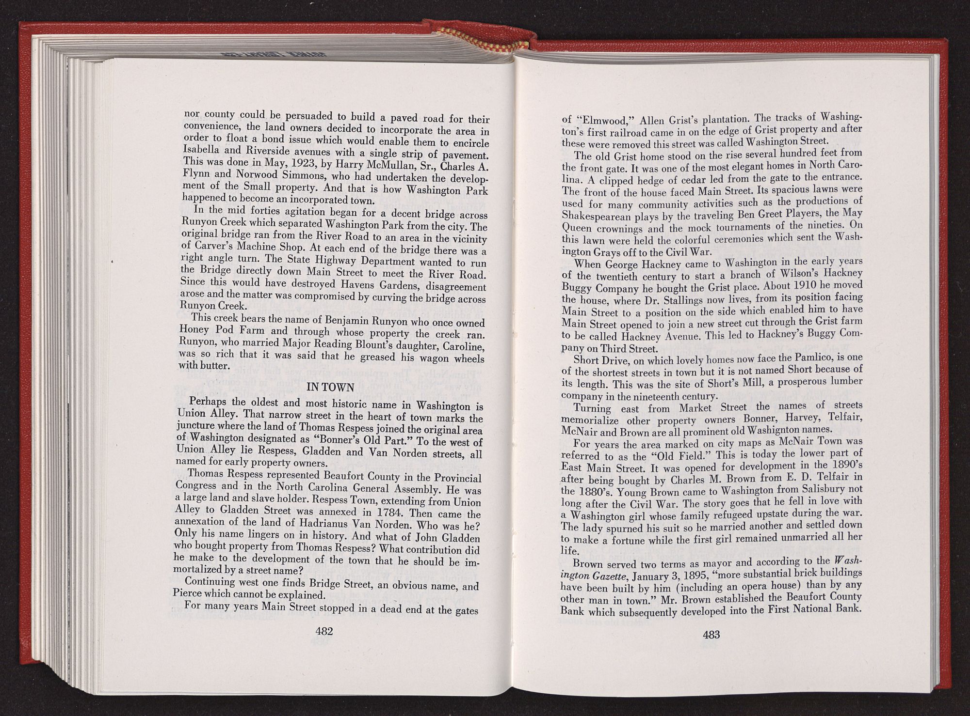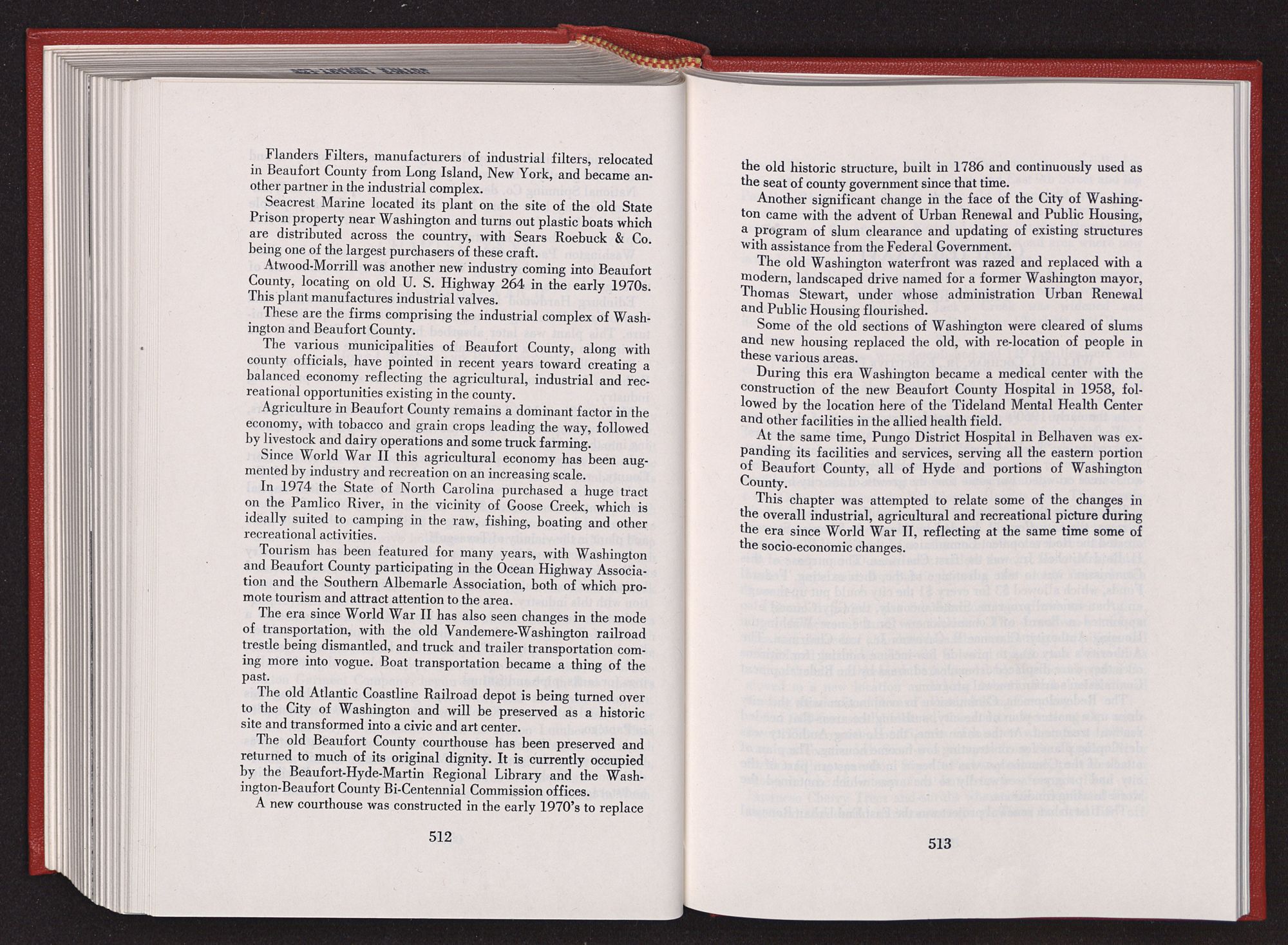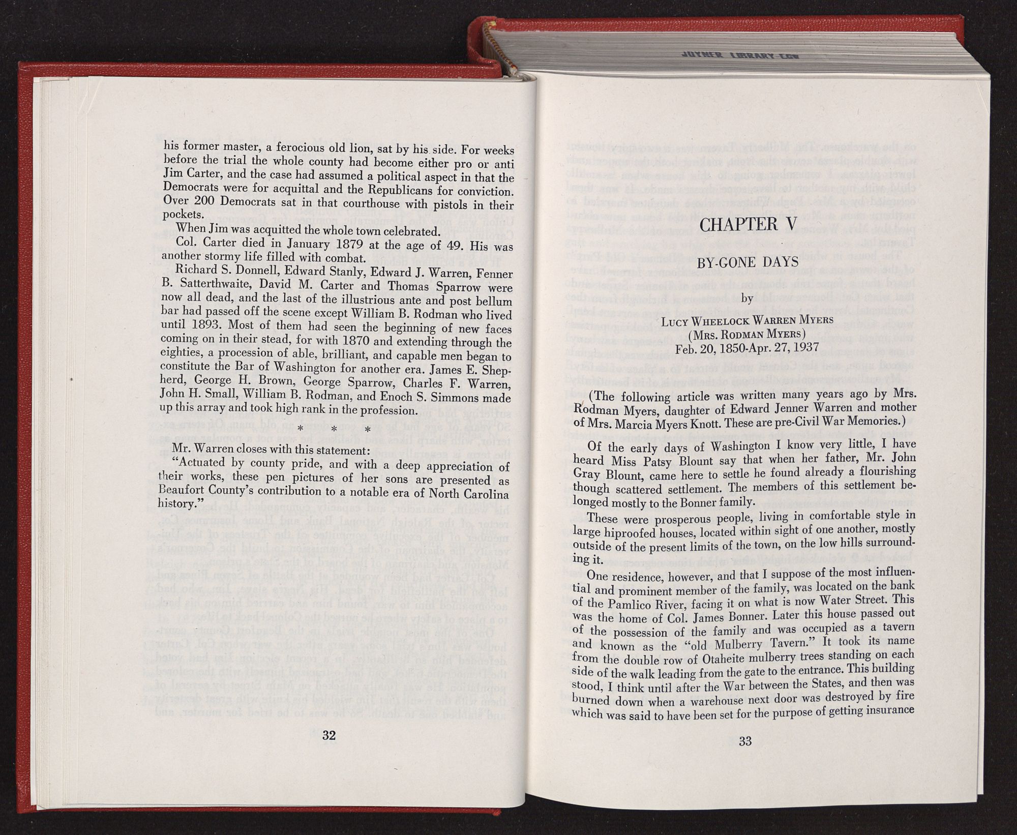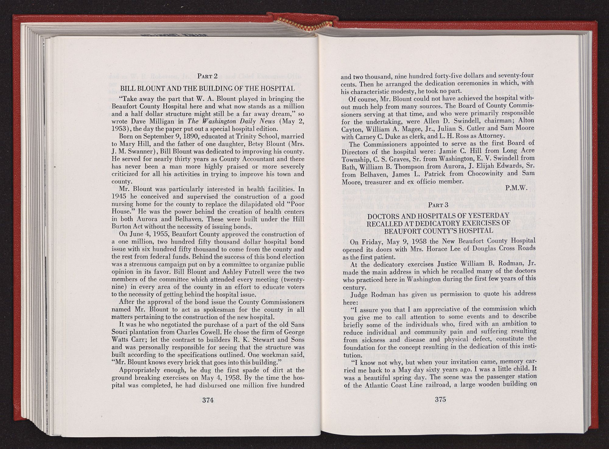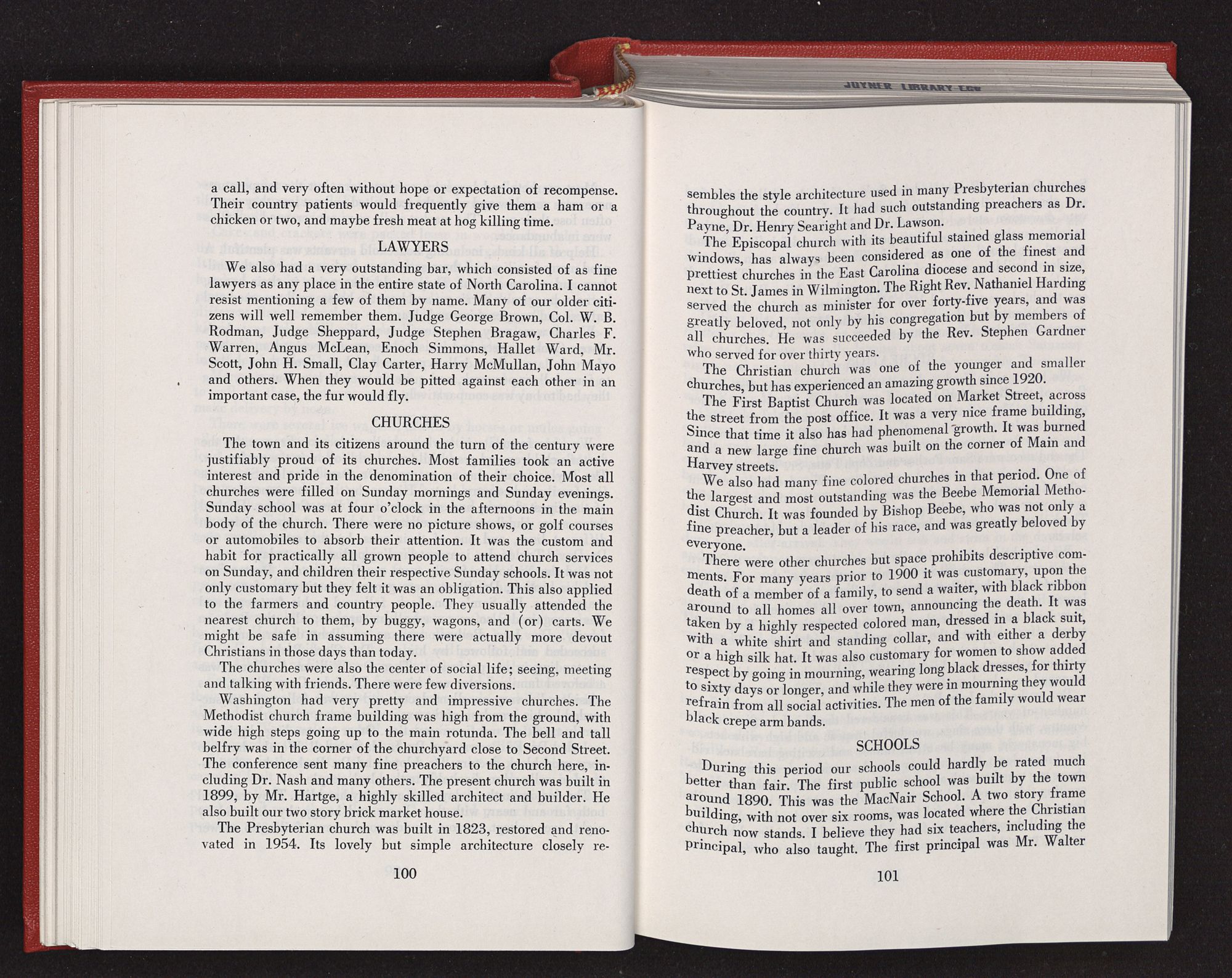 FOREWORDActing on instructions from the Washington-Beaufort County Bicentennial Commission with Roland Modlin, Chairman, the History Committee, under the Chairmanship of John Morgan, began in 1974 a history of the Washington area. The committee decided to use articles which spoke more graphically of their periods than those written today as the chronological base for the history, and to enlist the aid of a number of people in researching and writing in the areas in which they were interested. The result is a collection of articles, both old and new, which supplements the earlier work, Beaufort County: Two Centuries of its History by Colonel Wingate Reed, and brings to print much data heretofore not published. Hundreds of people have been interviewed. Records, letters, ledgers and scrapbooks have been brought from attics and used. Old newspapers have been collected and consulted. Much had to be omitted but the committee hopes that further volumes of Beaufort County history will follow. Quantities of material are now available and more is constantly accumulating, which has not been touched in this volume. This material is in the files at the George H. and Laura E. Brown Library where the data used for this book is stored.