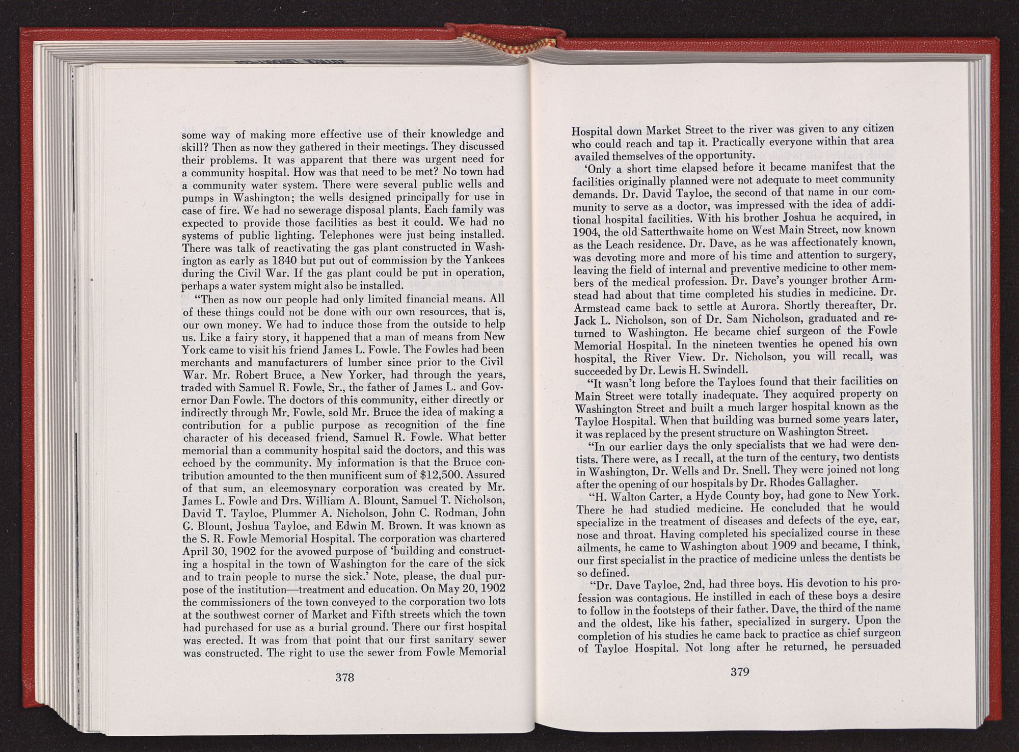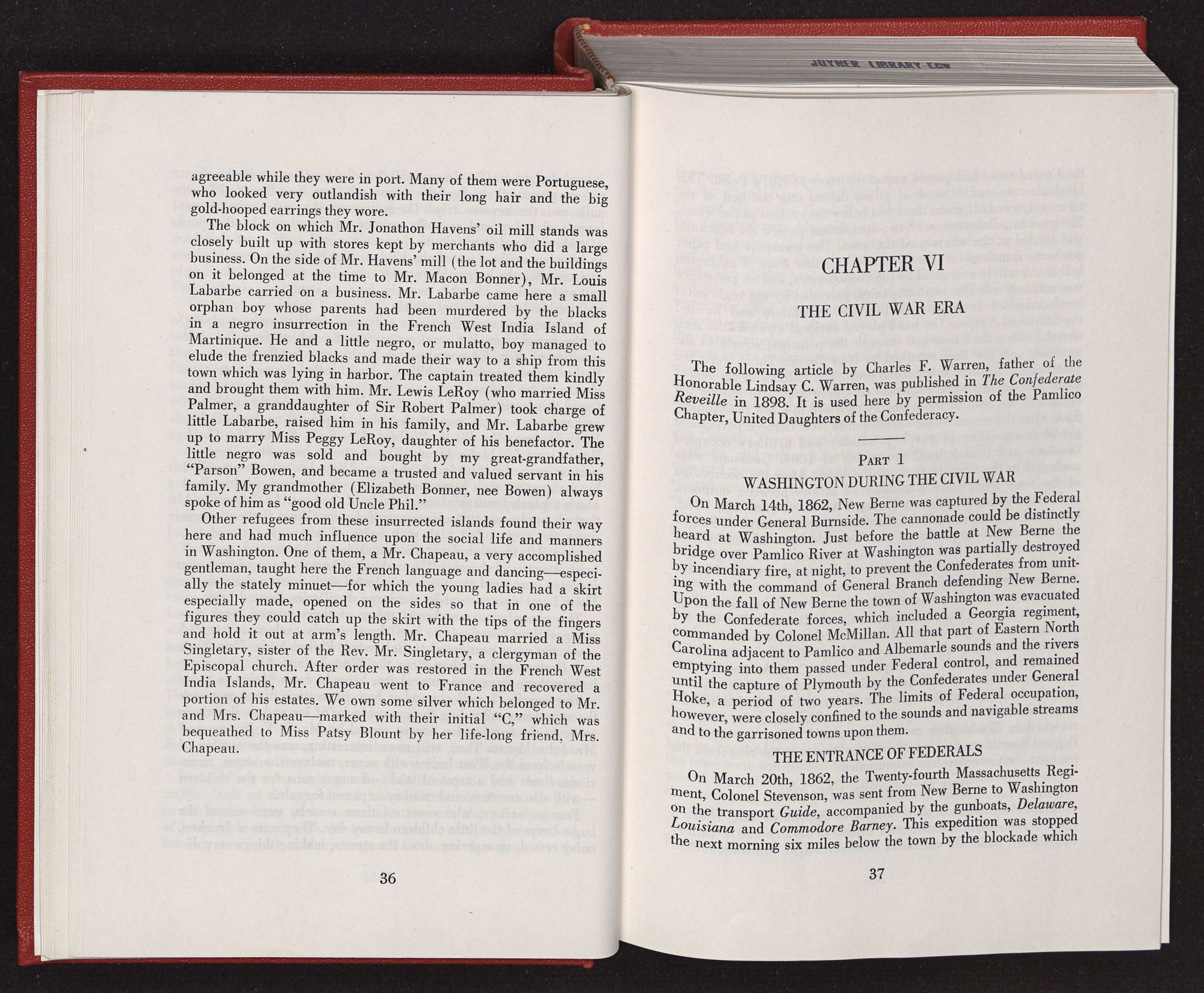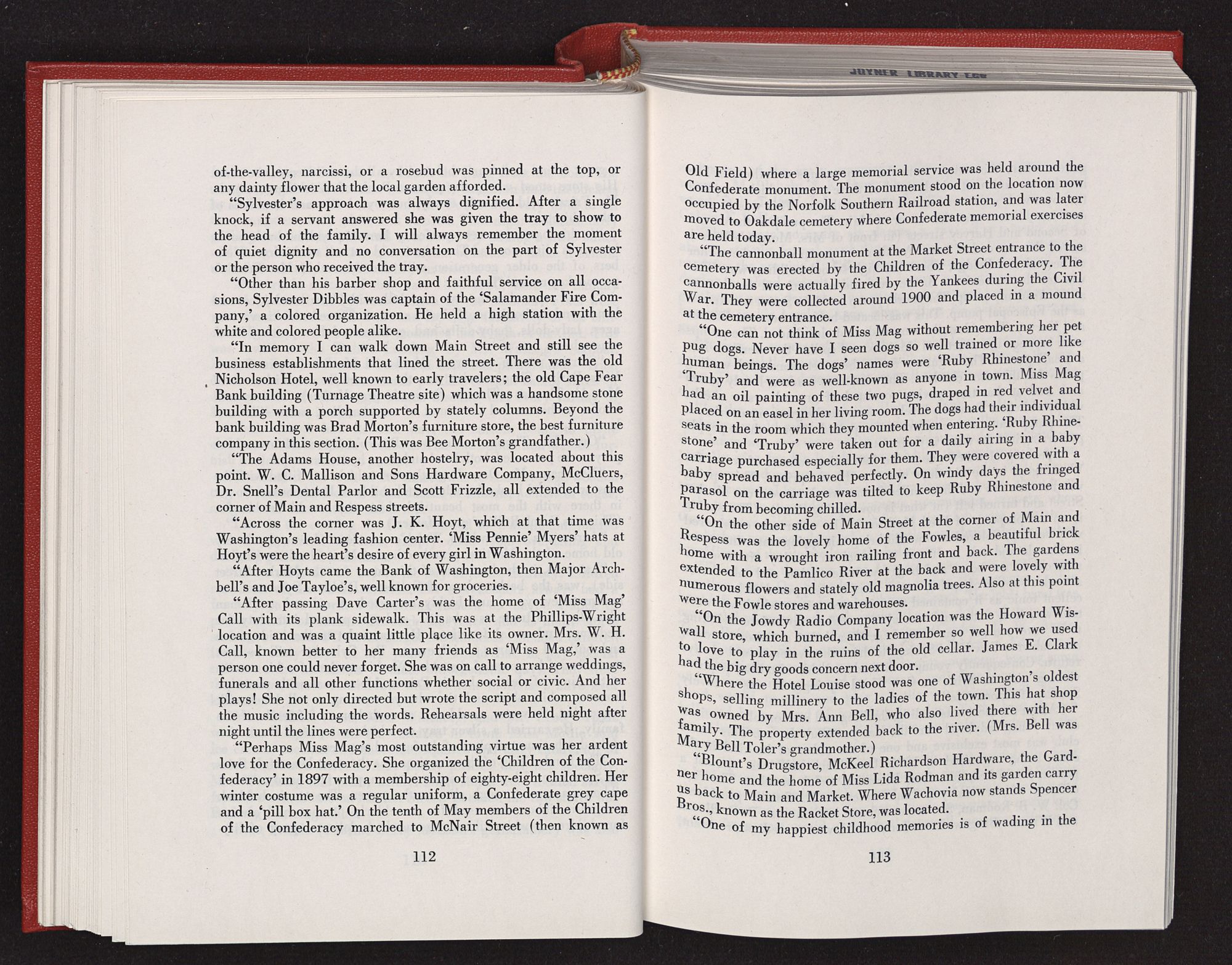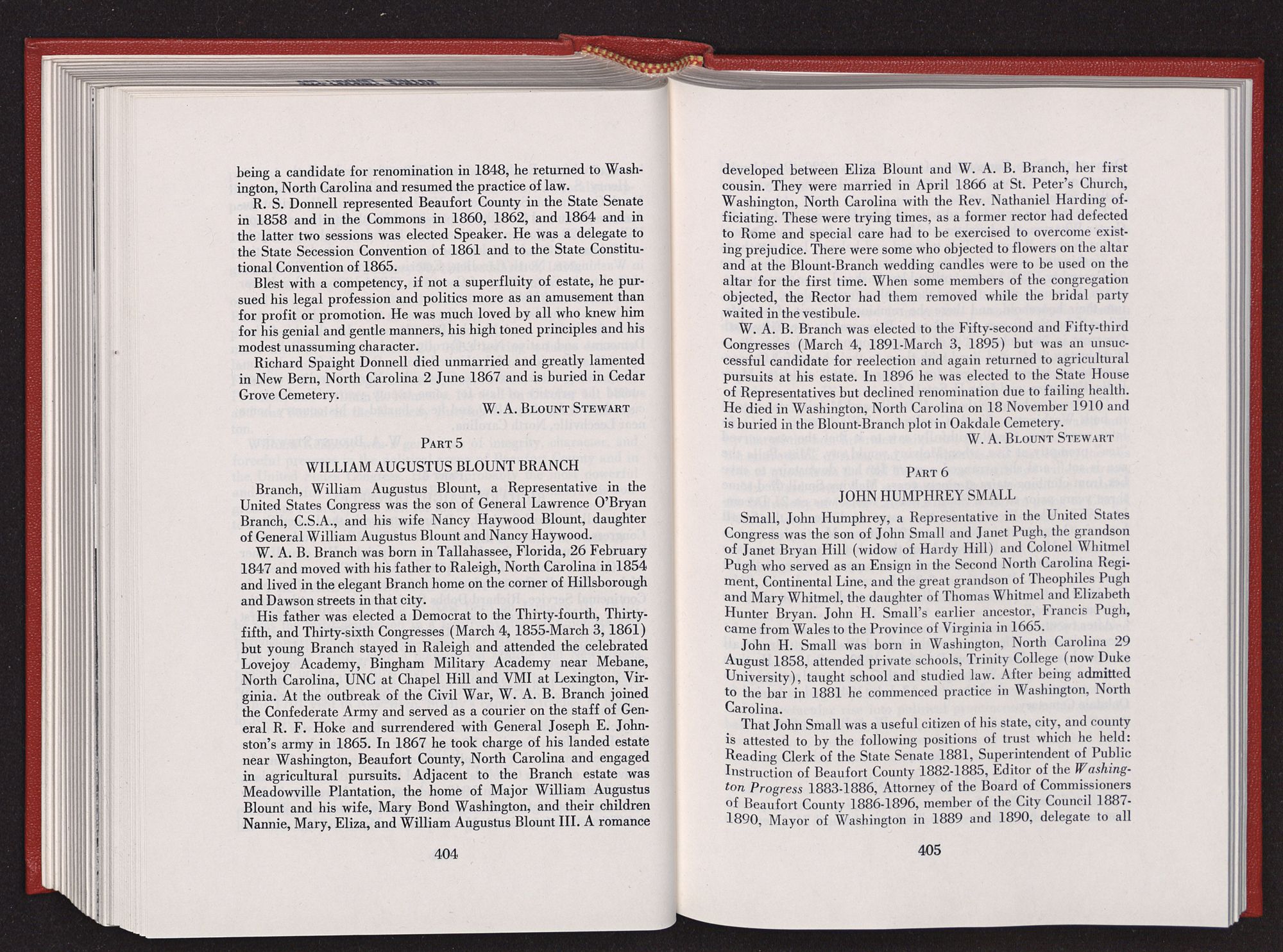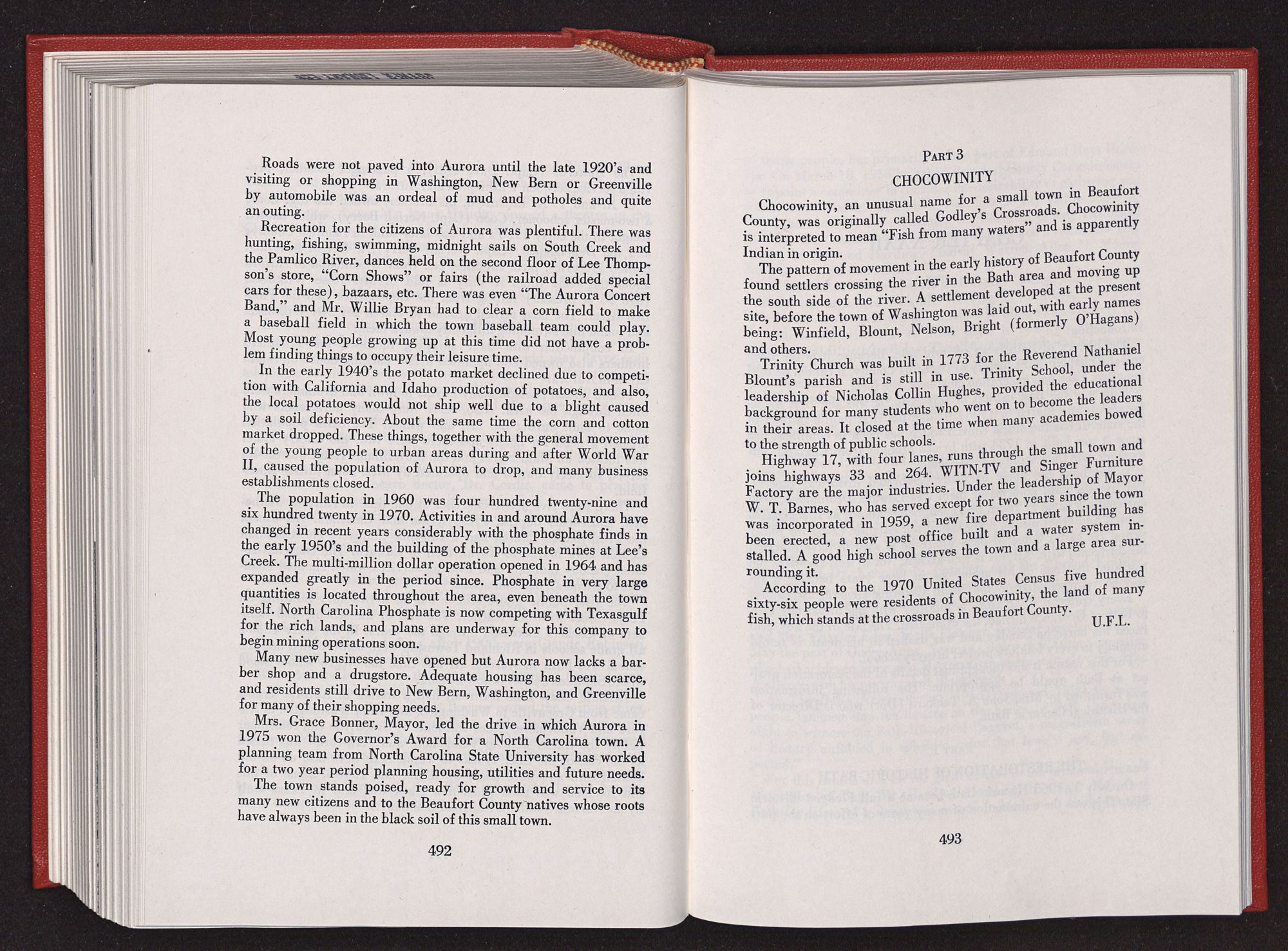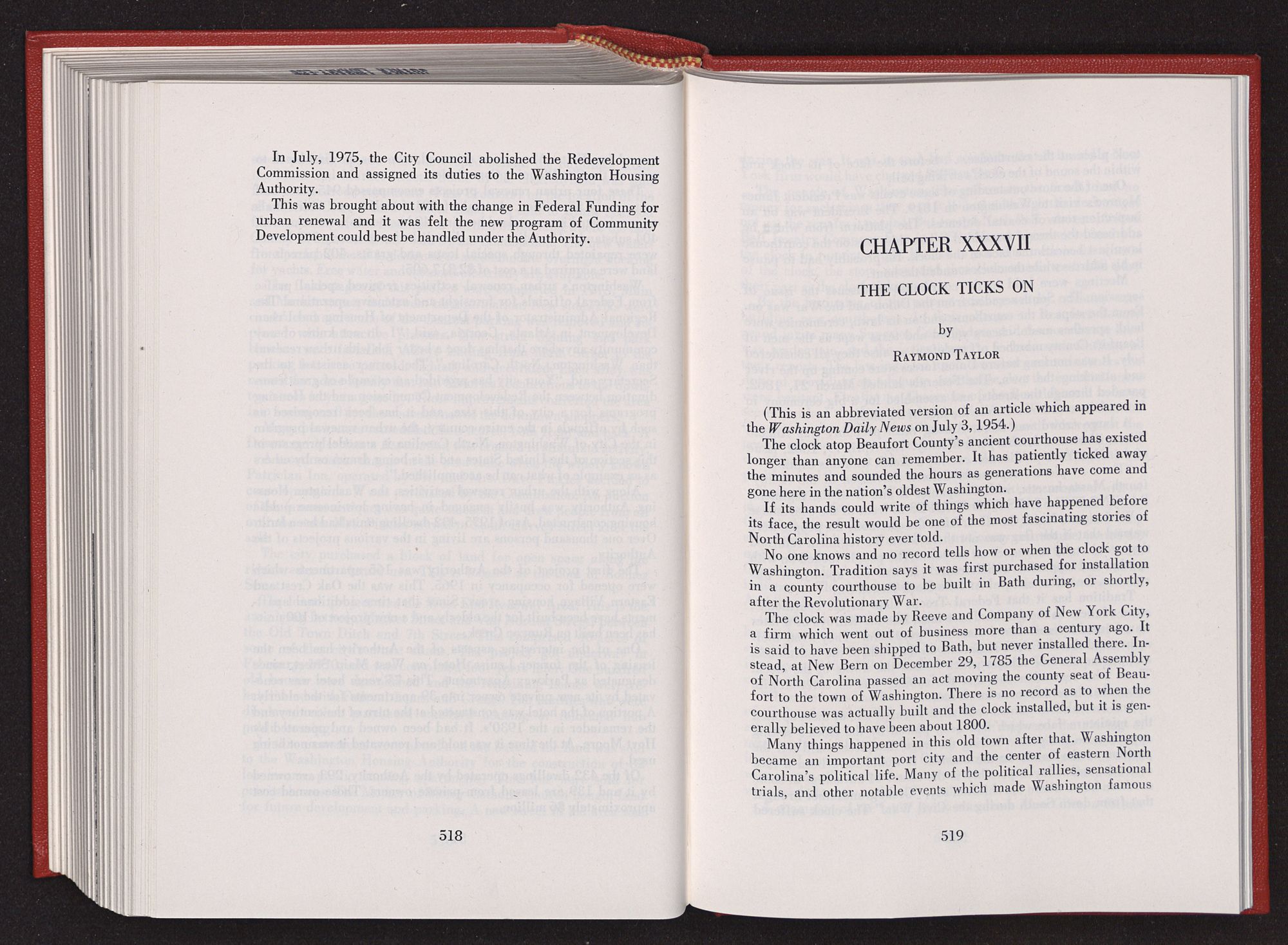 FOREWORDActing on instructions from the Washington-Beaufort County Bicentennial Commission with Roland Modlin, Chairman, the History Committee, under the Chairmanship of John Morgan, began in 1974 a history of the Washington area. The committee decided to use articles which spoke more graphically of their periods than those written today as the chronological base for the history, and to enlist the aid of a number of people in researching and writing in the areas in which they were interested. The result is a collection of articles, both old and new, which supplements the earlier work, Beaufort County: Two Centuries of its History by Colonel Wingate Reed, and brings to print much data heretofore not published. Hundreds of people have been interviewed. Records, letters, ledgers and scrapbooks have been brought from attics and used. Old newspapers have been collected and consulted. Much had to be omitted but the committee hopes that further volumes of Beaufort County history will follow. Quantities of material are now available and more is constantly accumulating, which has not been touched in this volume. This material is in the files at the George H. and Laura E. Brown Library where the data used for this book is stored.