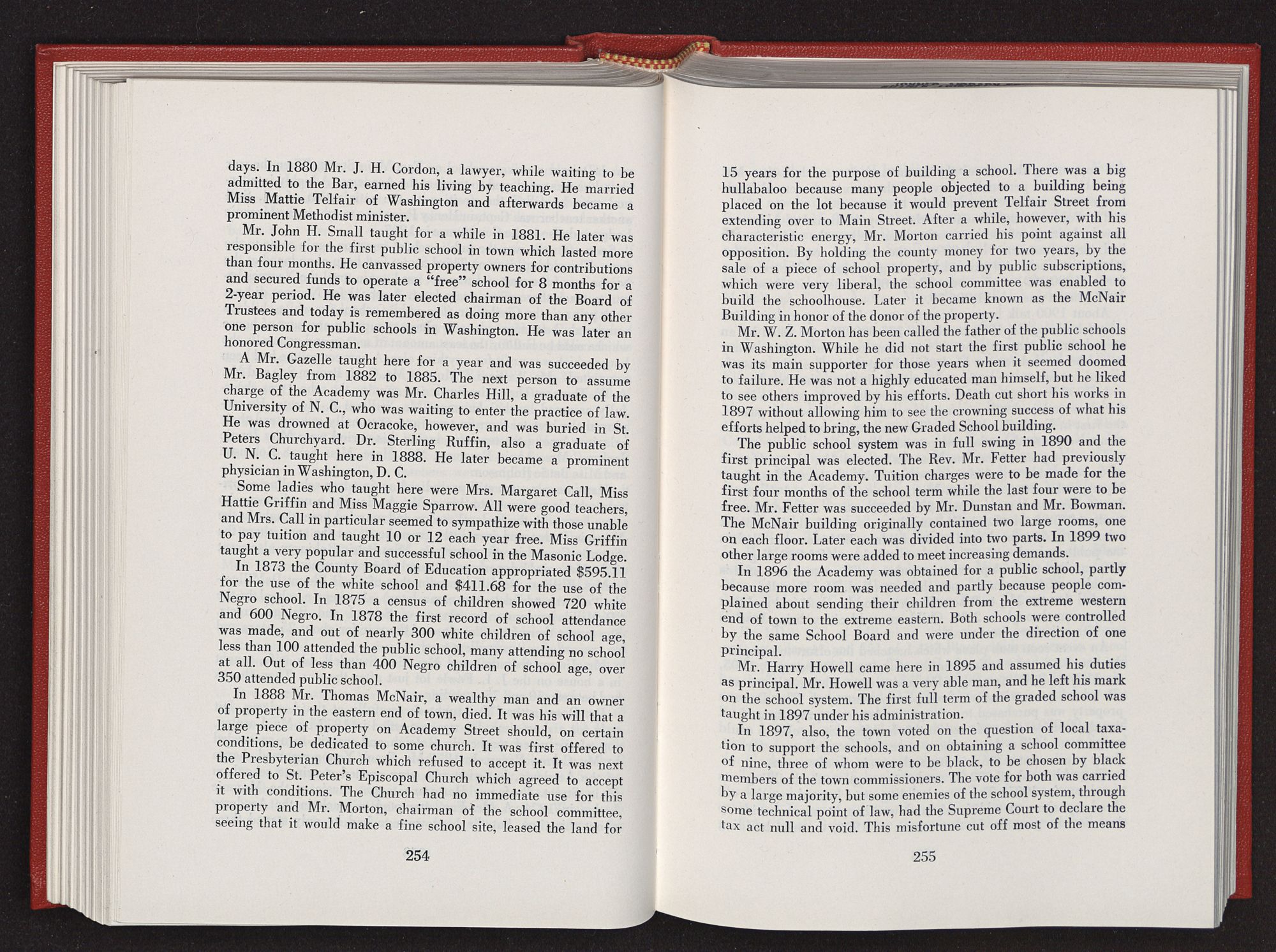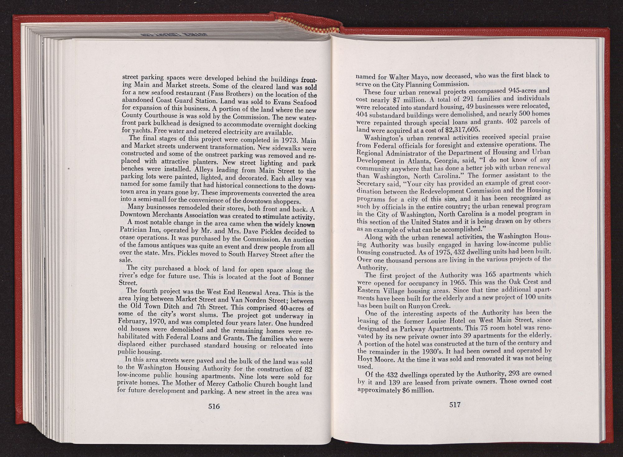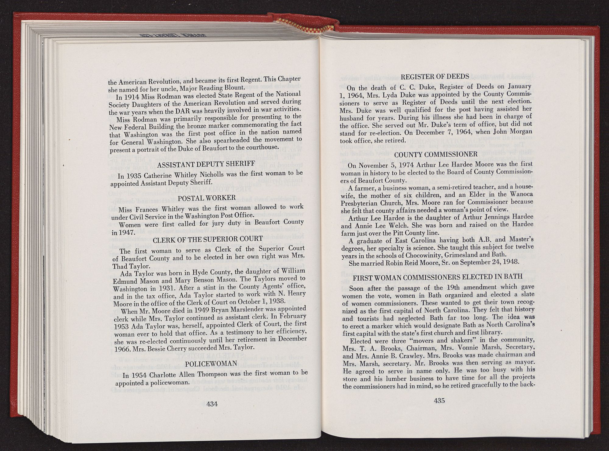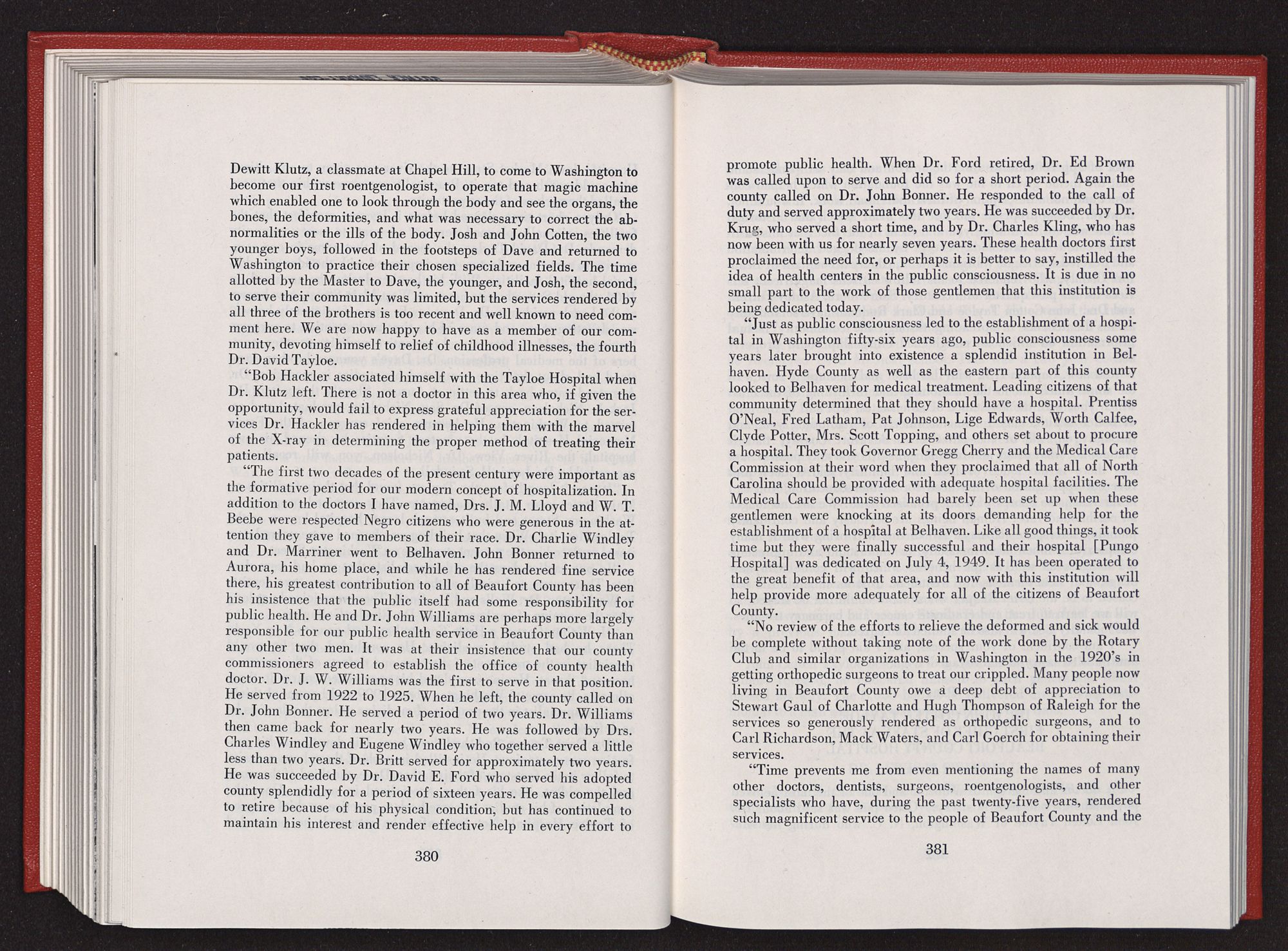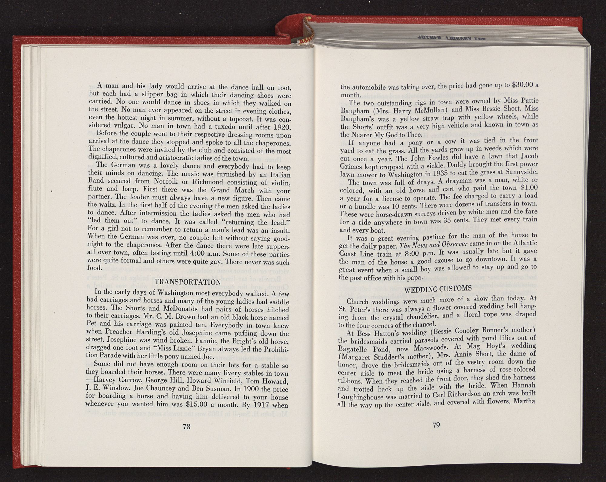 FOREWORDActing on instructions from the Washington-Beaufort County Bicentennial Commission with Roland Modlin, Chairman, the History Committee, under the Chairmanship of John Morgan, began in 1974 a history of the Washington area. The committee decided to use articles which spoke more graphically of their periods than those written today as the chronological base for the history, and to enlist the aid of a number of people in researching and writing in the areas in which they were interested. The result is a collection of articles, both old and new, which supplements the earlier work, Beaufort County: Two Centuries of its History by Colonel Wingate Reed, and brings to print much data heretofore not published. Hundreds of people have been interviewed. Records, letters, ledgers and scrapbooks have been brought from attics and used. Old newspapers have been collected and consulted. Much had to be omitted but the committee hopes that further volumes of Beaufort County history will follow. Quantities of material are now available and more is constantly accumulating, which has not been touched in this volume. This material is in the files at the George H. and Laura E. Brown Library where the data used for this book is stored.