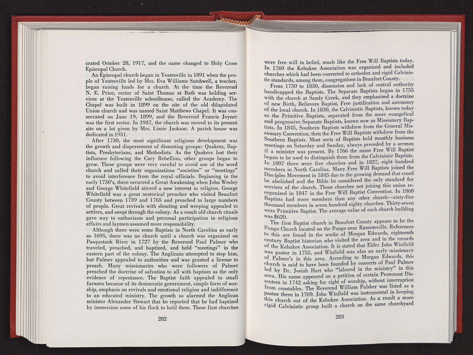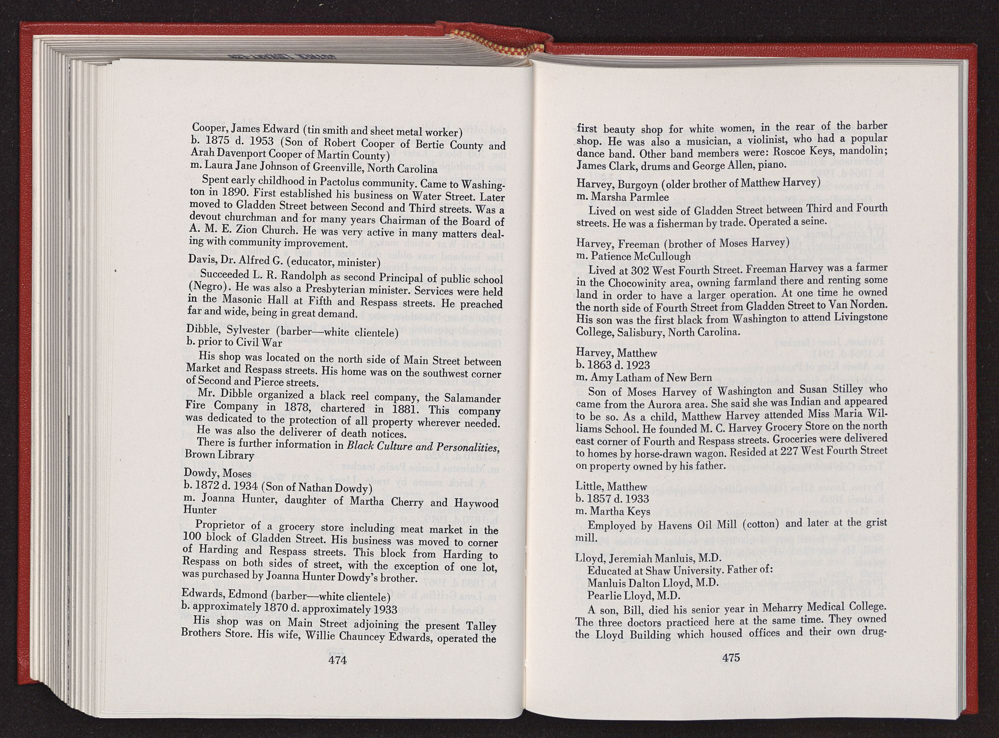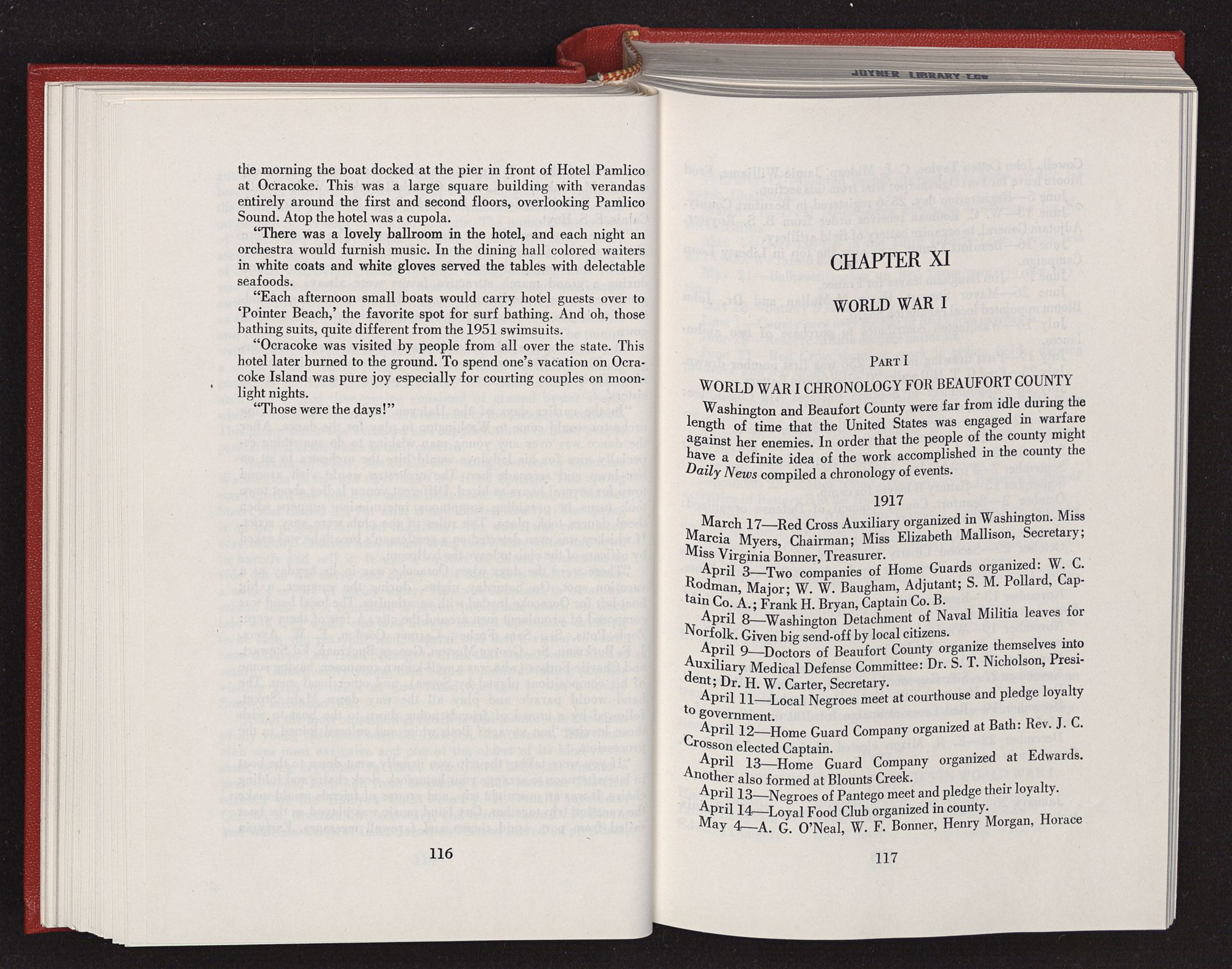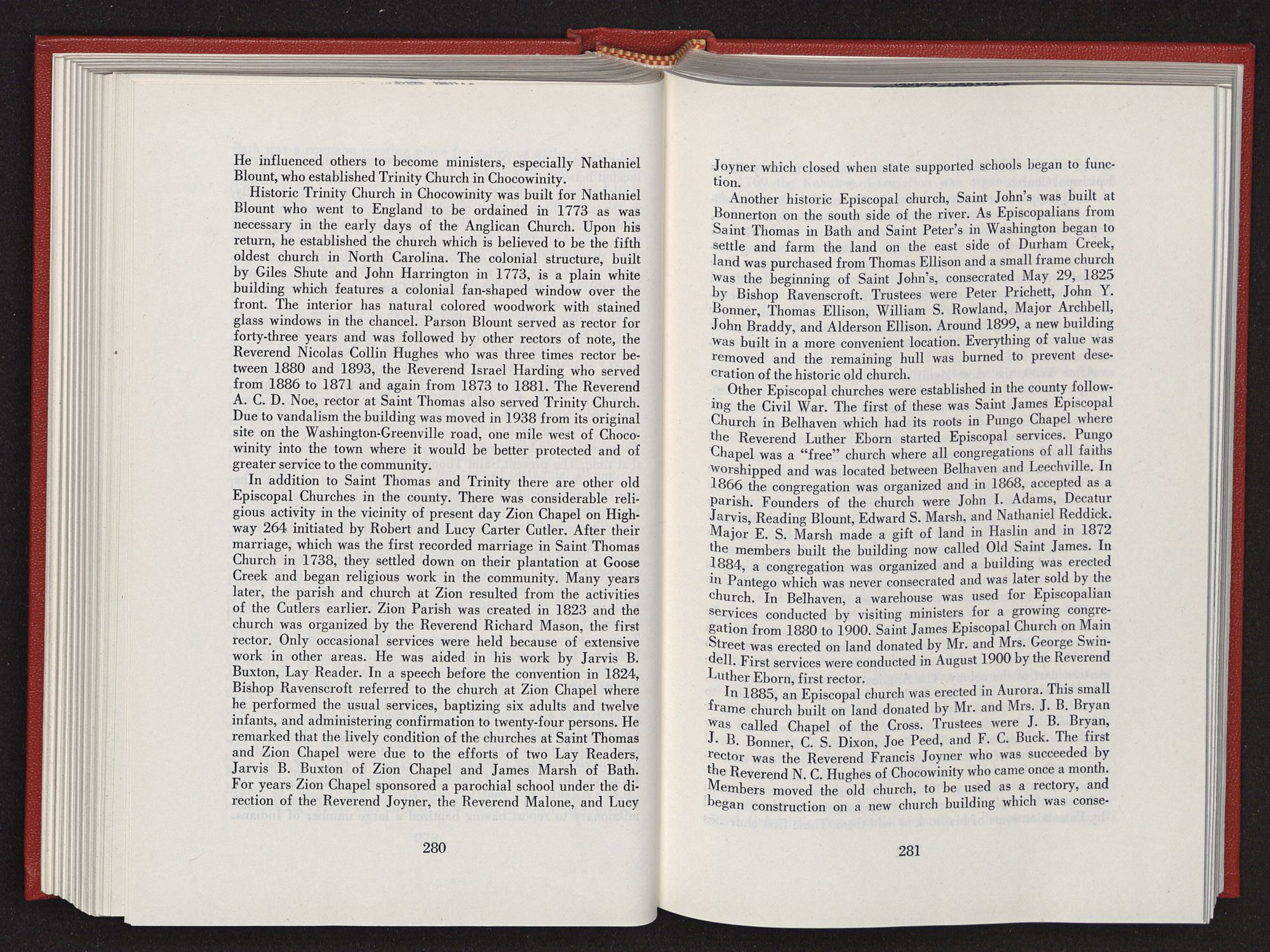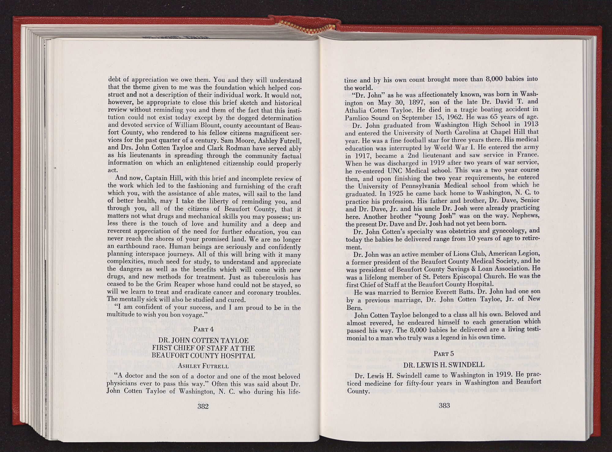 FOREWORDActing on instructions from the Washington-Beaufort County Bicentennial Commission with Roland Modlin, Chairman, the History Committee, under the Chairmanship of John Morgan, began in 1974 a history of the Washington area. The committee decided to use articles which spoke more graphically of their periods than those written today as the chronological base for the history, and to enlist the aid of a number of people in researching and writing in the areas in which they were interested. The result is a collection of articles, both old and new, which supplements the earlier work, Beaufort County: Two Centuries of its History by Colonel Wingate Reed, and brings to print much data heretofore not published. Hundreds of people have been interviewed. Records, letters, ledgers and scrapbooks have been brought from attics and used. Old newspapers have been collected and consulted. Much had to be omitted but the committee hopes that further volumes of Beaufort County history will follow. Quantities of material are now available and more is constantly accumulating, which has not been touched in this volume. This material is in the files at the George H. and Laura E. Brown Library where the data used for this book is stored.