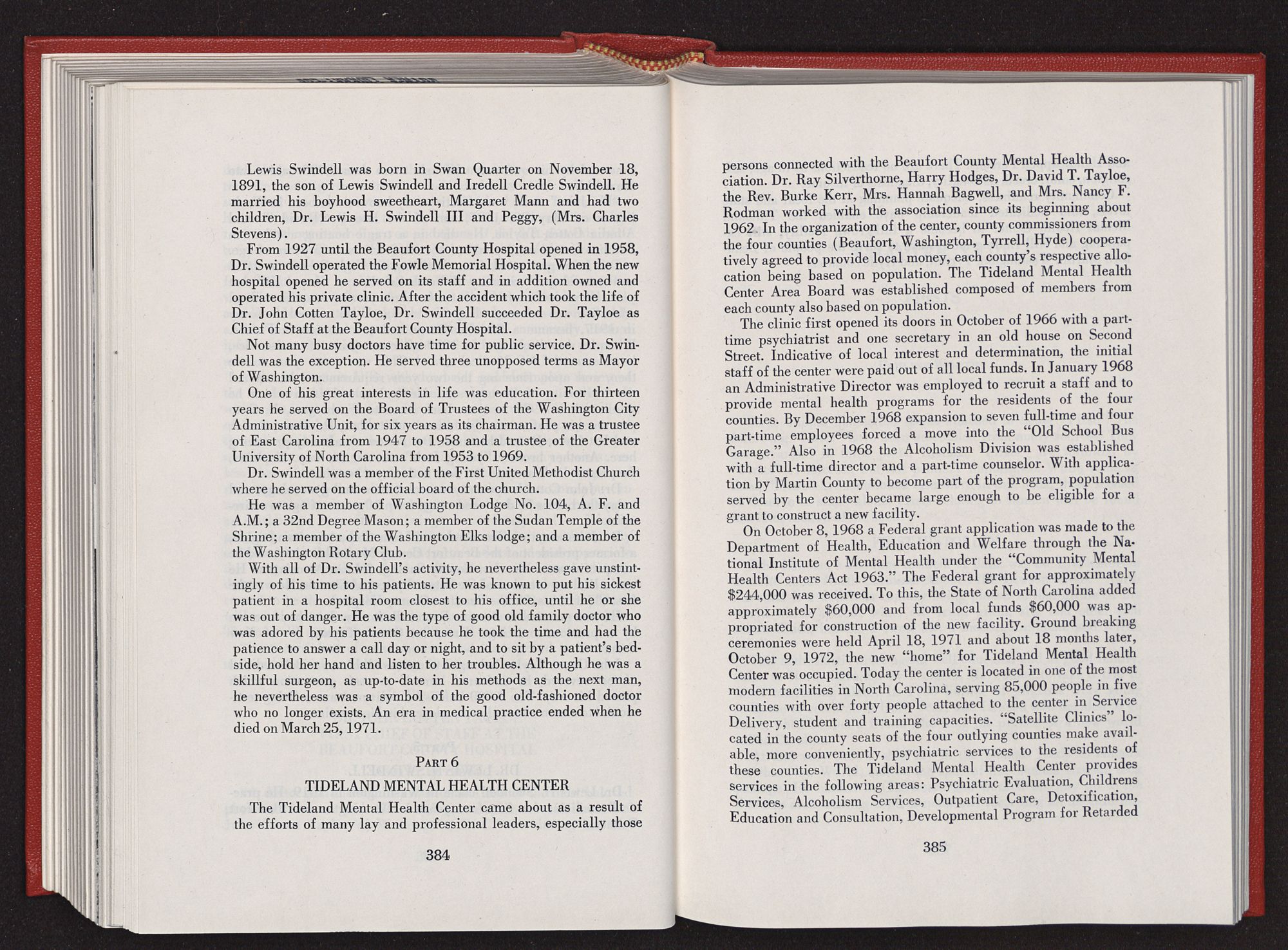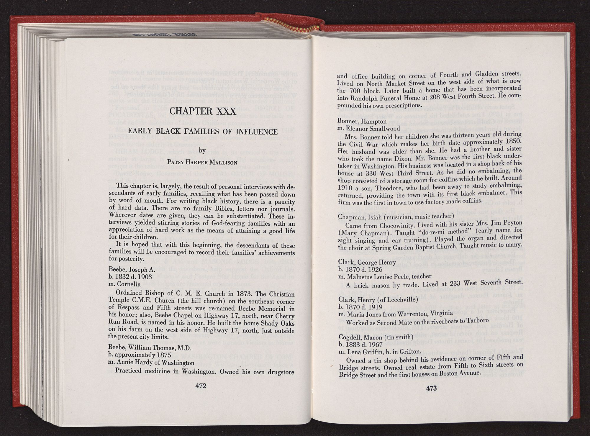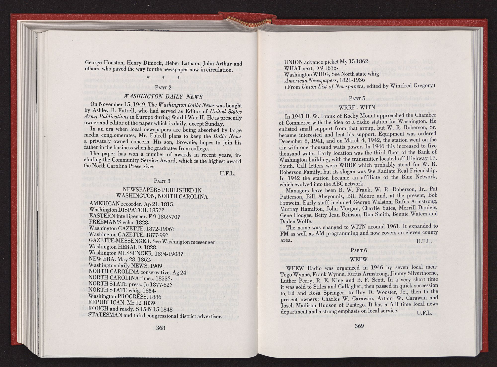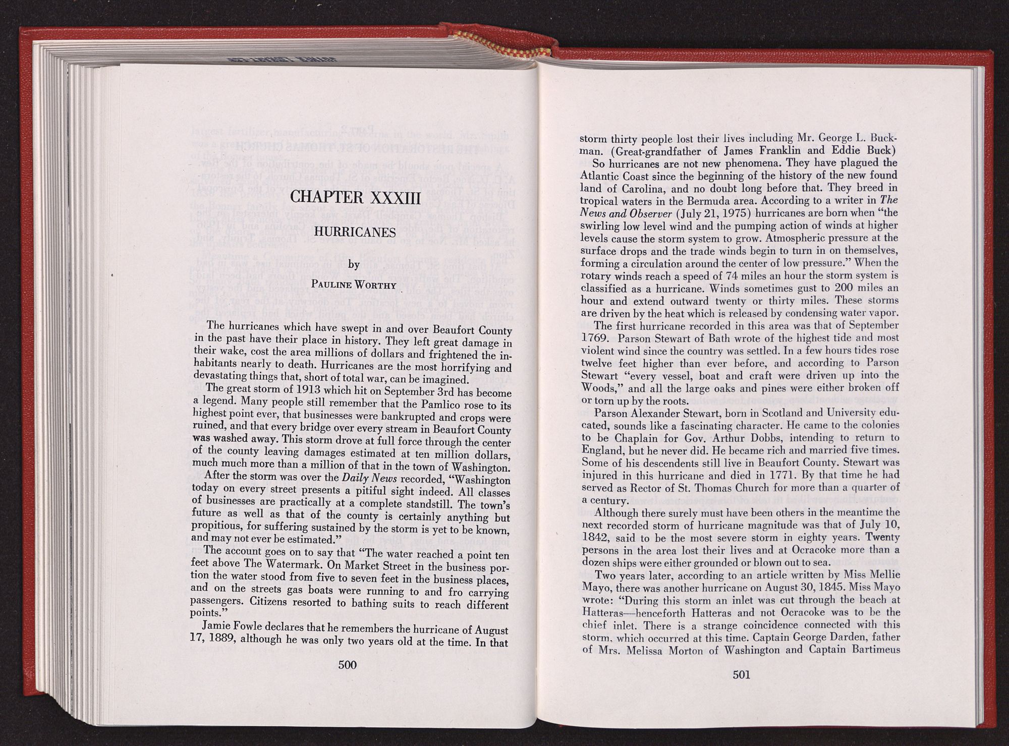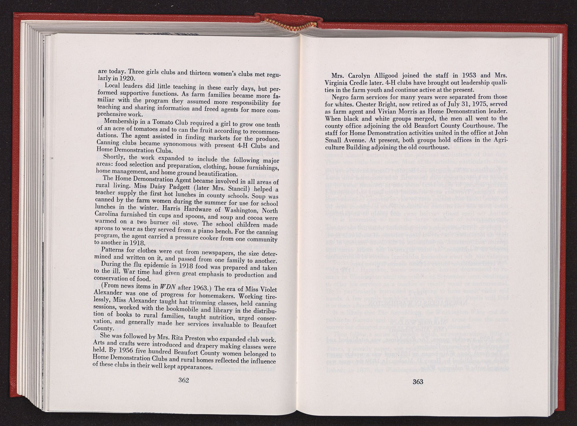 FOREWORDActing on instructions from the Washington-Beaufort County Bicentennial Commission with Roland Modlin, Chairman, the History Committee, under the Chairmanship of John Morgan, began in 1974 a history of the Washington area. The committee decided to use articles which spoke more graphically of their periods than those written today as the chronological base for the history, and to enlist the aid of a number of people in researching and writing in the areas in which they were interested. The result is a collection of articles, both old and new, which supplements the earlier work, Beaufort County: Two Centuries of its History by Colonel Wingate Reed, and brings to print much data heretofore not published. Hundreds of people have been interviewed. Records, letters, ledgers and scrapbooks have been brought from attics and used. Old newspapers have been collected and consulted. Much had to be omitted but the committee hopes that further volumes of Beaufort County history will follow. Quantities of material are now available and more is constantly accumulating, which has not been touched in this volume. This material is in the files at the George H. and Laura E. Brown Library where the data used for this book is stored.