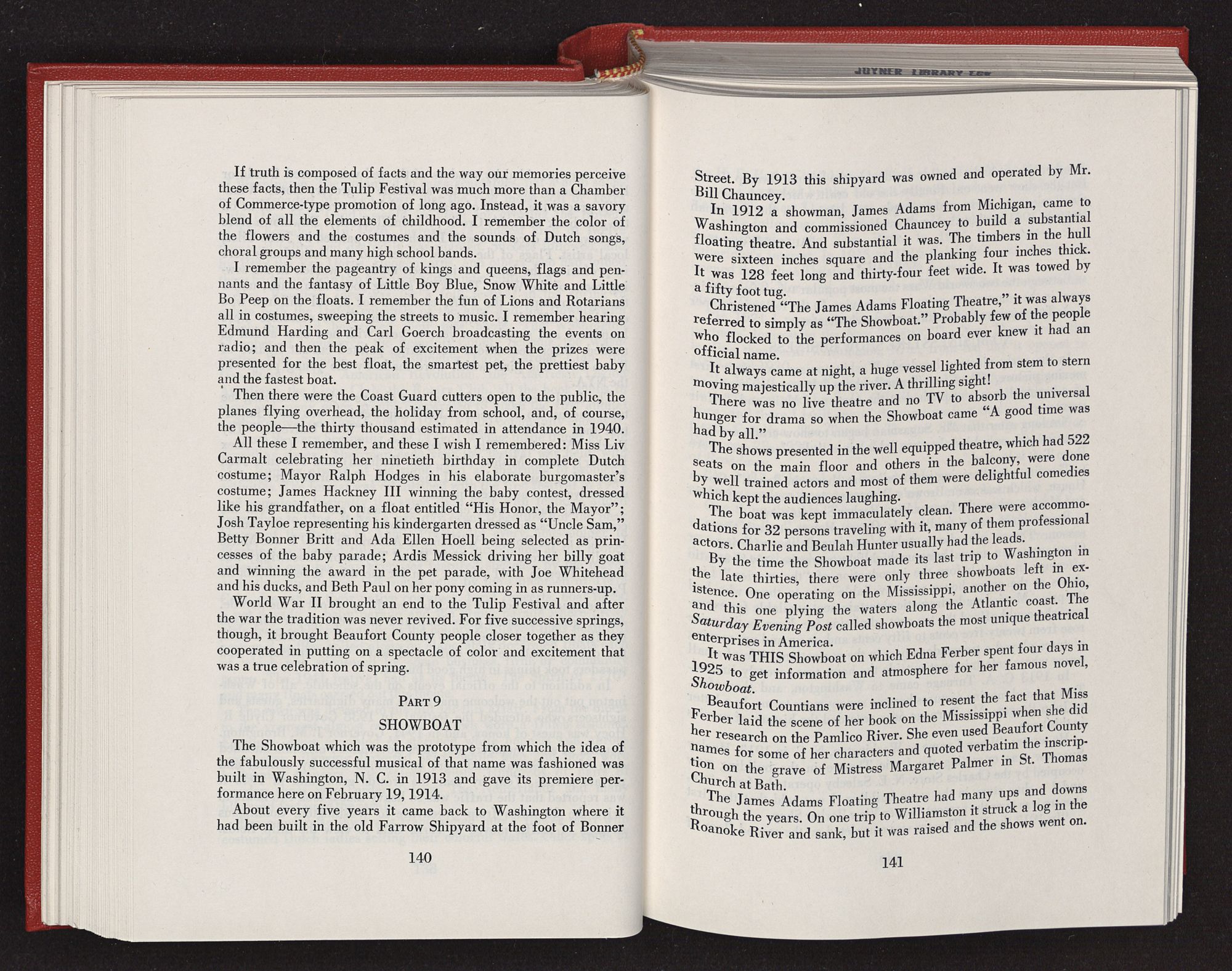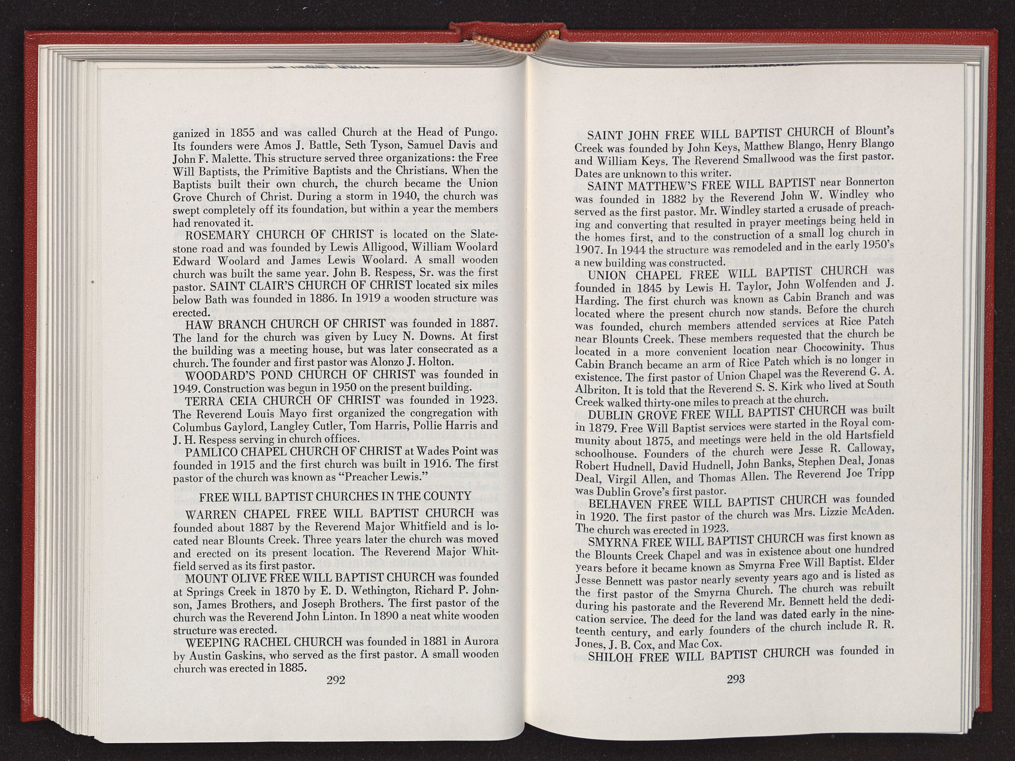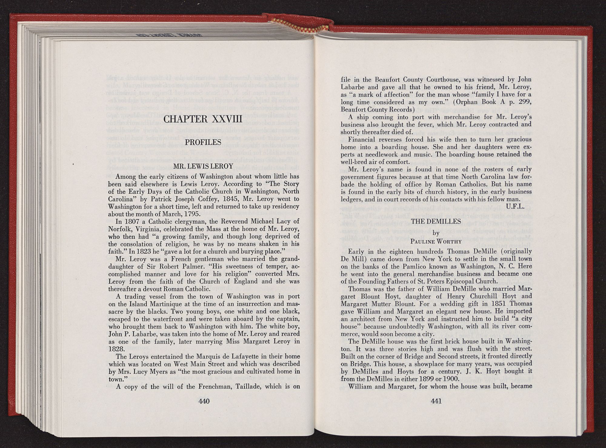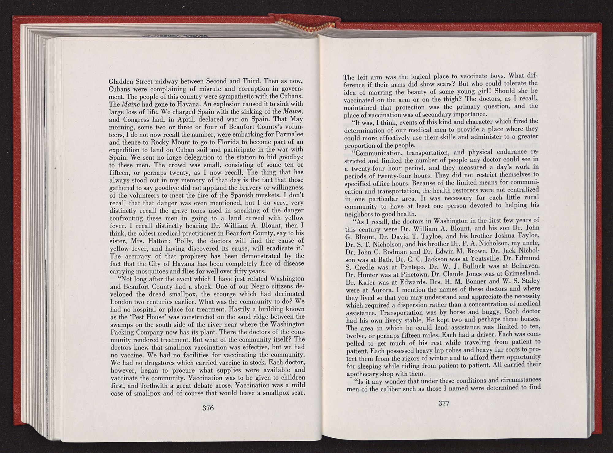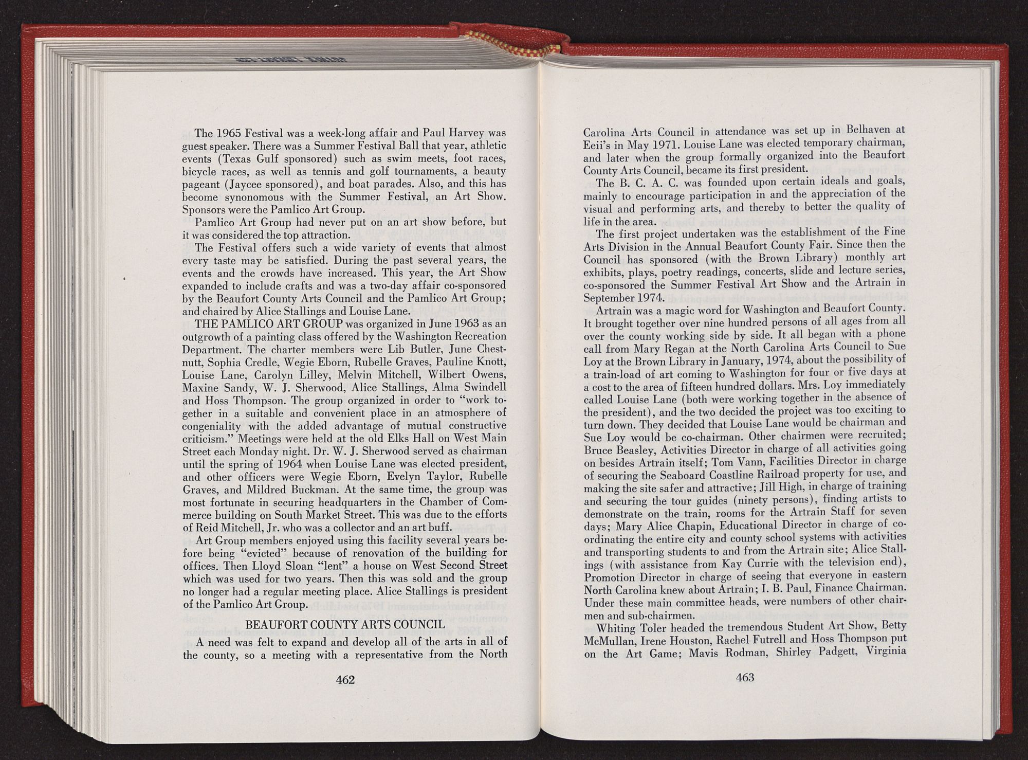 FOREWORDActing on instructions from the Washington-Beaufort County Bicentennial Commission with Roland Modlin, Chairman, the History Committee, under the Chairmanship of John Morgan, began in 1974 a history of the Washington area. The committee decided to use articles which spoke more graphically of their periods than those written today as the chronological base for the history, and to enlist the aid of a number of people in researching and writing in the areas in which they were interested. The result is a collection of articles, both old and new, which supplements the earlier work, Beaufort County: Two Centuries of its History by Colonel Wingate Reed, and brings to print much data heretofore not published. Hundreds of people have been interviewed. Records, letters, ledgers and scrapbooks have been brought from attics and used. Old newspapers have been collected and consulted. Much had to be omitted but the committee hopes that further volumes of Beaufort County history will follow. Quantities of material are now available and more is constantly accumulating, which has not been touched in this volume. This material is in the files at the George H. and Laura E. Brown Library where the data used for this book is stored.