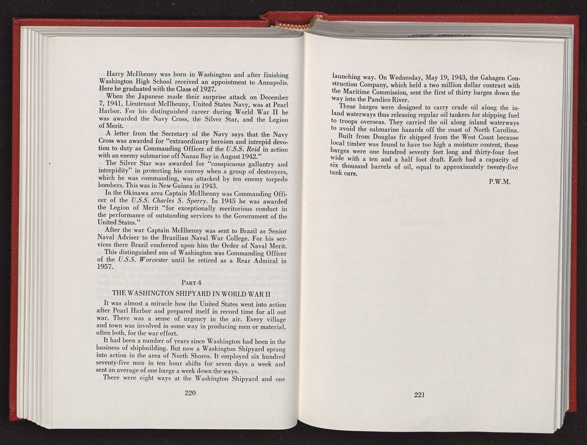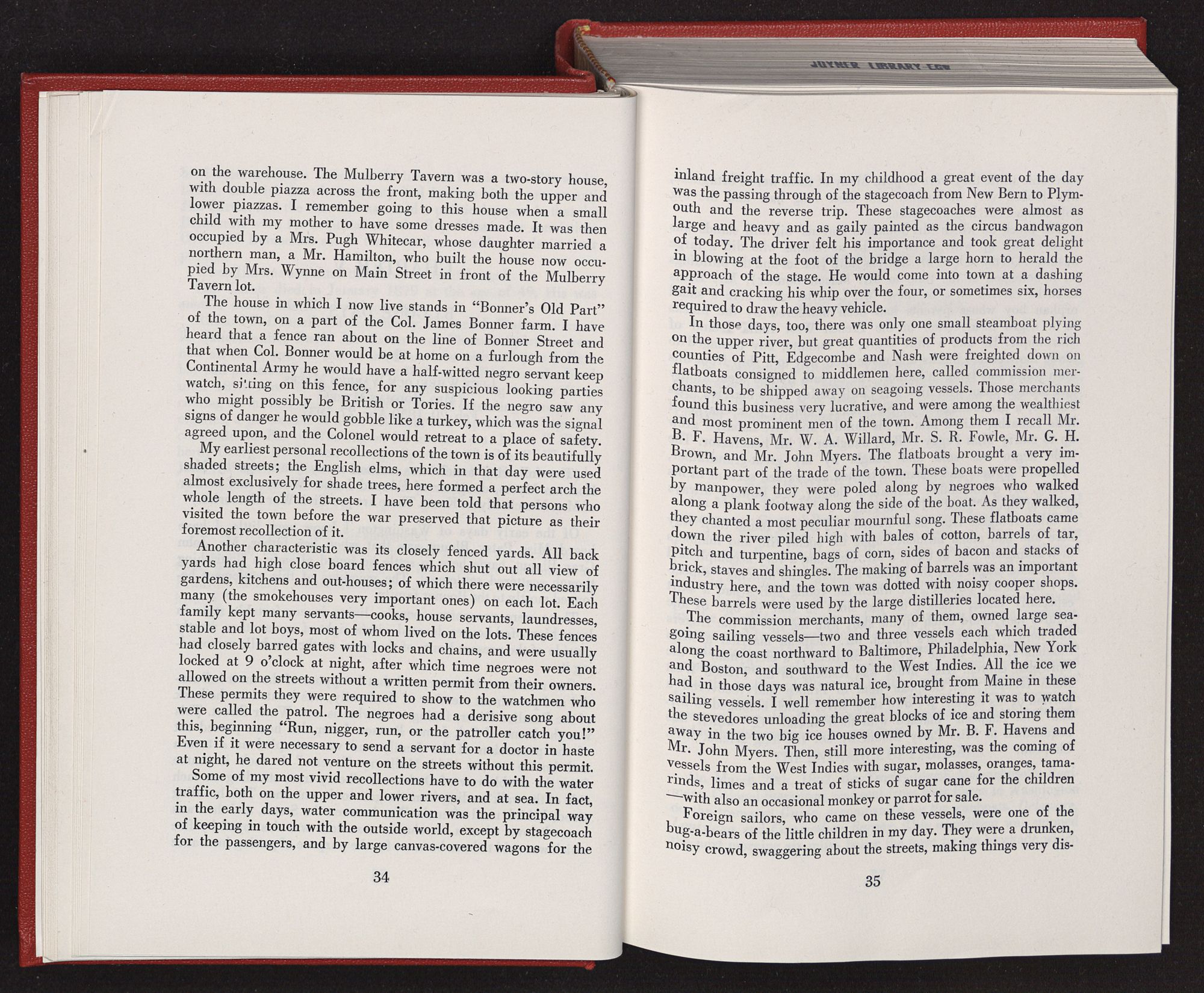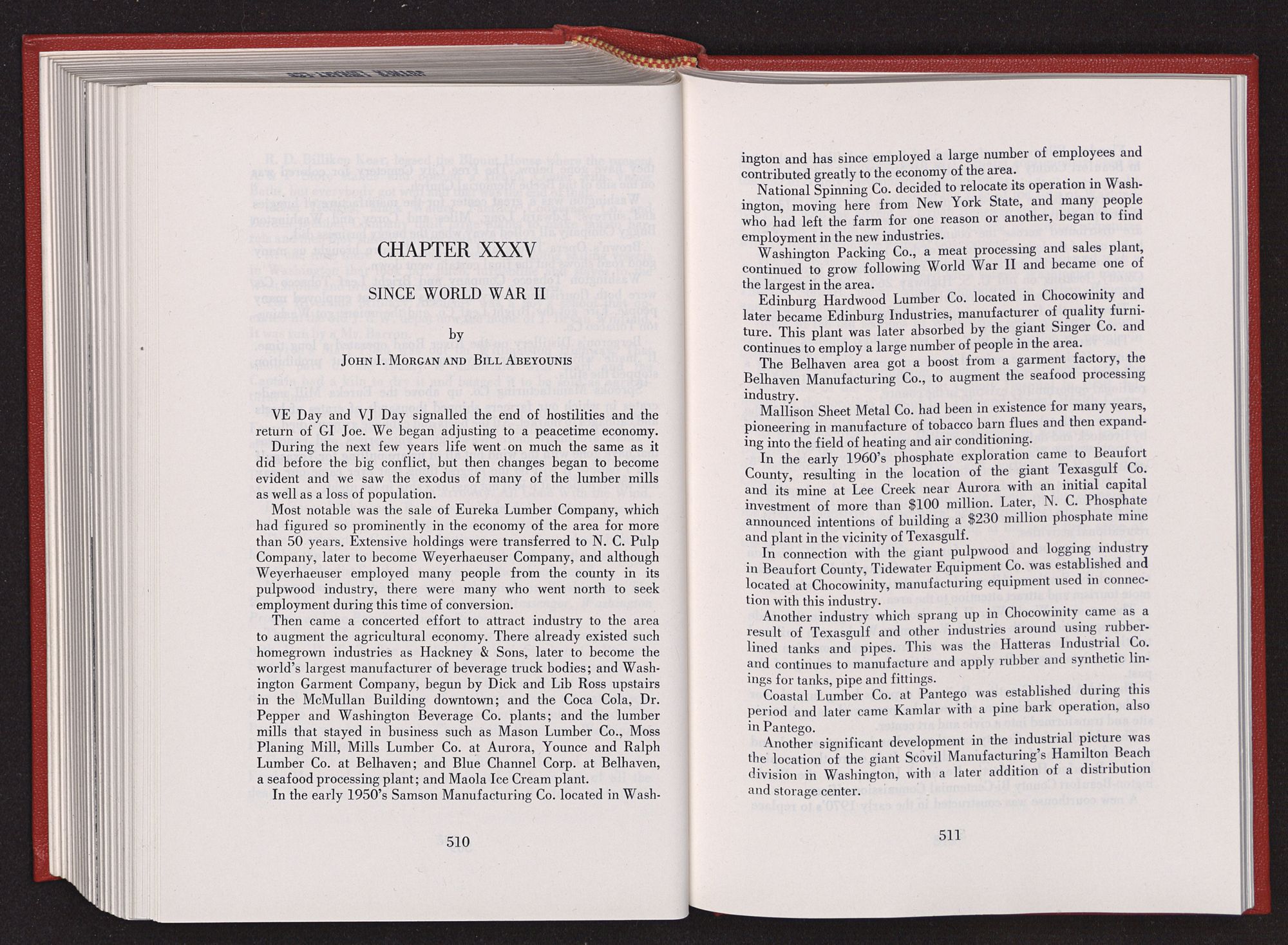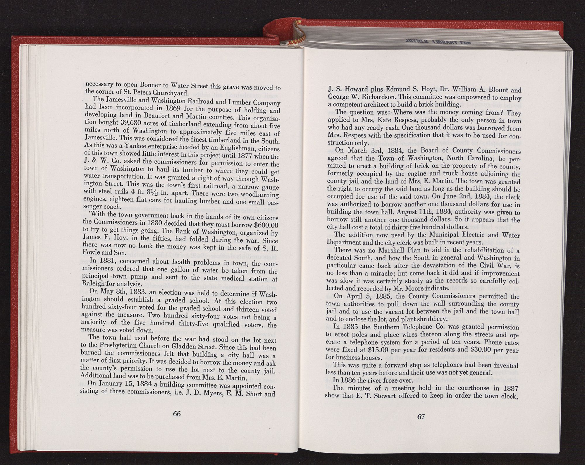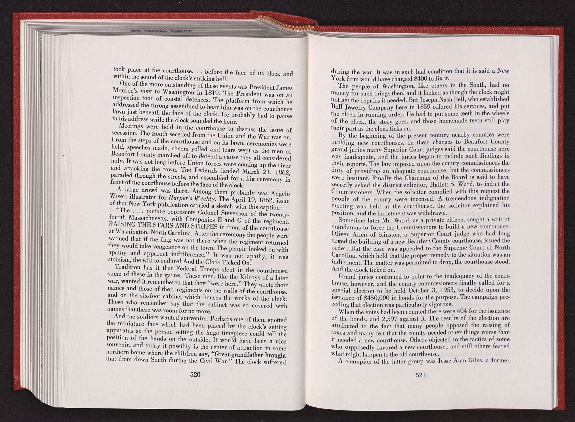 FOREWORDActing on instructions from the Washington-Beaufort County Bicentennial Commission with Roland Modlin, Chairman, the History Committee, under the Chairmanship of John Morgan, began in 1974 a history of the Washington area. The committee decided to use articles which spoke more graphically of their periods than those written today as the chronological base for the history, and to enlist the aid of a number of people in researching and writing in the areas in which they were interested. The result is a collection of articles, both old and new, which supplements the earlier work, Beaufort County: Two Centuries of its History by Colonel Wingate Reed, and brings to print much data heretofore not published. Hundreds of people have been interviewed. Records, letters, ledgers and scrapbooks have been brought from attics and used. Old newspapers have been collected and consulted. Much had to be omitted but the committee hopes that further volumes of Beaufort County history will follow. Quantities of material are now available and more is constantly accumulating, which has not been touched in this volume. This material is in the files at the George H. and Laura E. Brown Library where the data used for this book is stored.