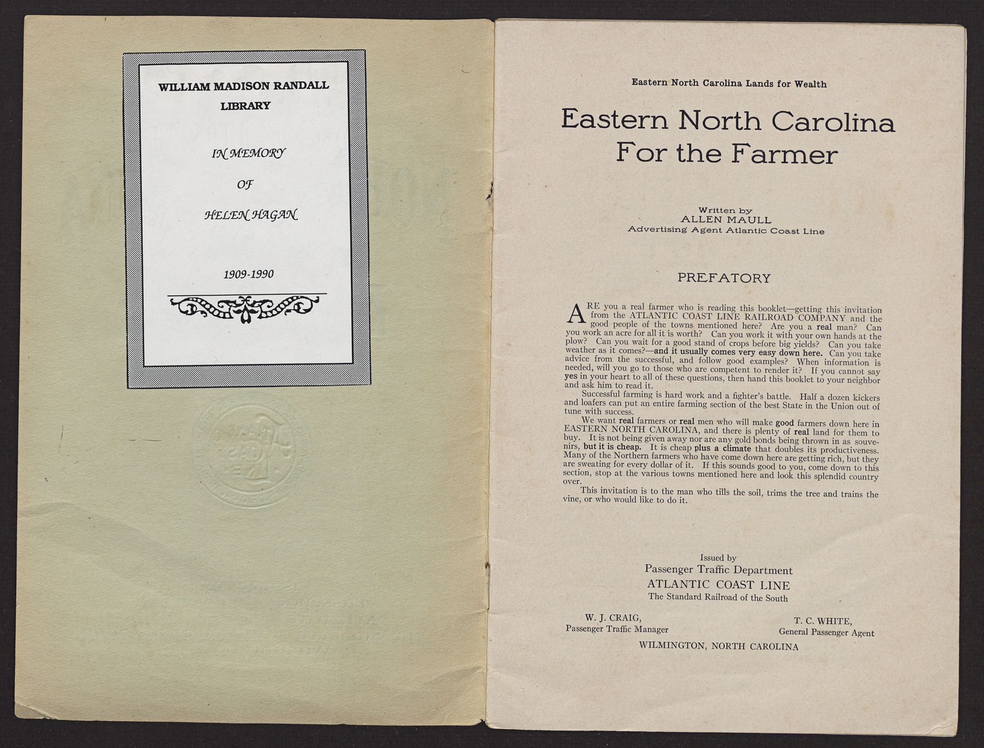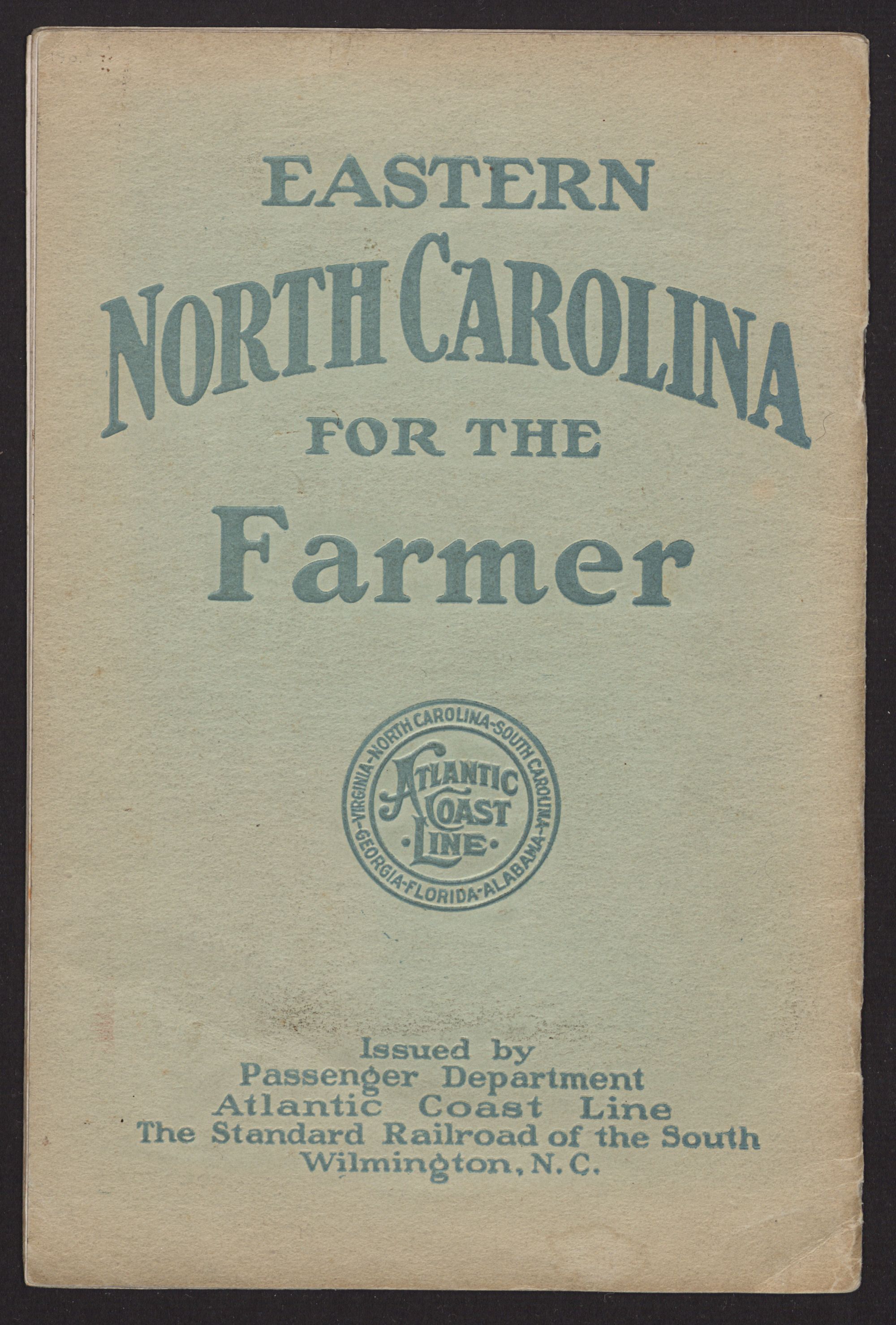 Eastern North Carolina For the FarmerWritten by ALLEN MAULL Advertising Agent Atlantic Coast LinePREFATORY ARE you a real farmer who is reading this booklet—getting this invitation from the ATLANTIC COAST LINE RAILROAD COMPANY and the good people of the towns mentioned here? Are you a real man? Can you work an acre for all it is worth? Can you work it with your own hands at the plow? Can you wait for a good stand of crops before big yields? Can you take weather as it comes?—and it usually comes very easy down here. Can you take advice from the successful, and follow good examples? When information is needed, will you go to those who are competent to render it? If you cannot say yes in your heart to all of these questions, then hand this booklet to your neighbor and ask him to read it. Successful farming is hard work and a fighter's battle. Half a dozen kickers and loafers can put an entire farming section of the best State in the Union out of tune with success. We want real farmers or real men who will make good farmers down here in EASTERN NORTH CAROLINA, and there is plenty of real land for them to buy. It is not being given away nor are any gold bonds being thrown in as souvenirs, but it is cheap. It is cheap plus a climate that doubles its productiveness. Many of the Northern farmers who have come down here are getting rich, but they are sweating for every dollar of it. If this sounds good to you, come down to this section, stop at the various towns mentioned here and look this splendid country over. This invitation is to the man who tills the soil, trims the tree and trains the vine, or who would like to do it. Issued by Passenger Traffic Department ATLANTIC COAST LINE The Standard Railroad of the South W. J. CRAIG, Passenger Traffic Manager T. C. WHITE, General Passenger AgentWILMINGTON, NORTH CAROLINATHE FARMER'S OPPORTUNITY