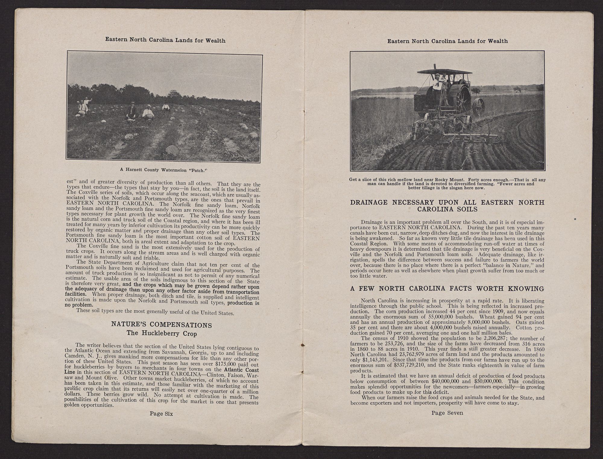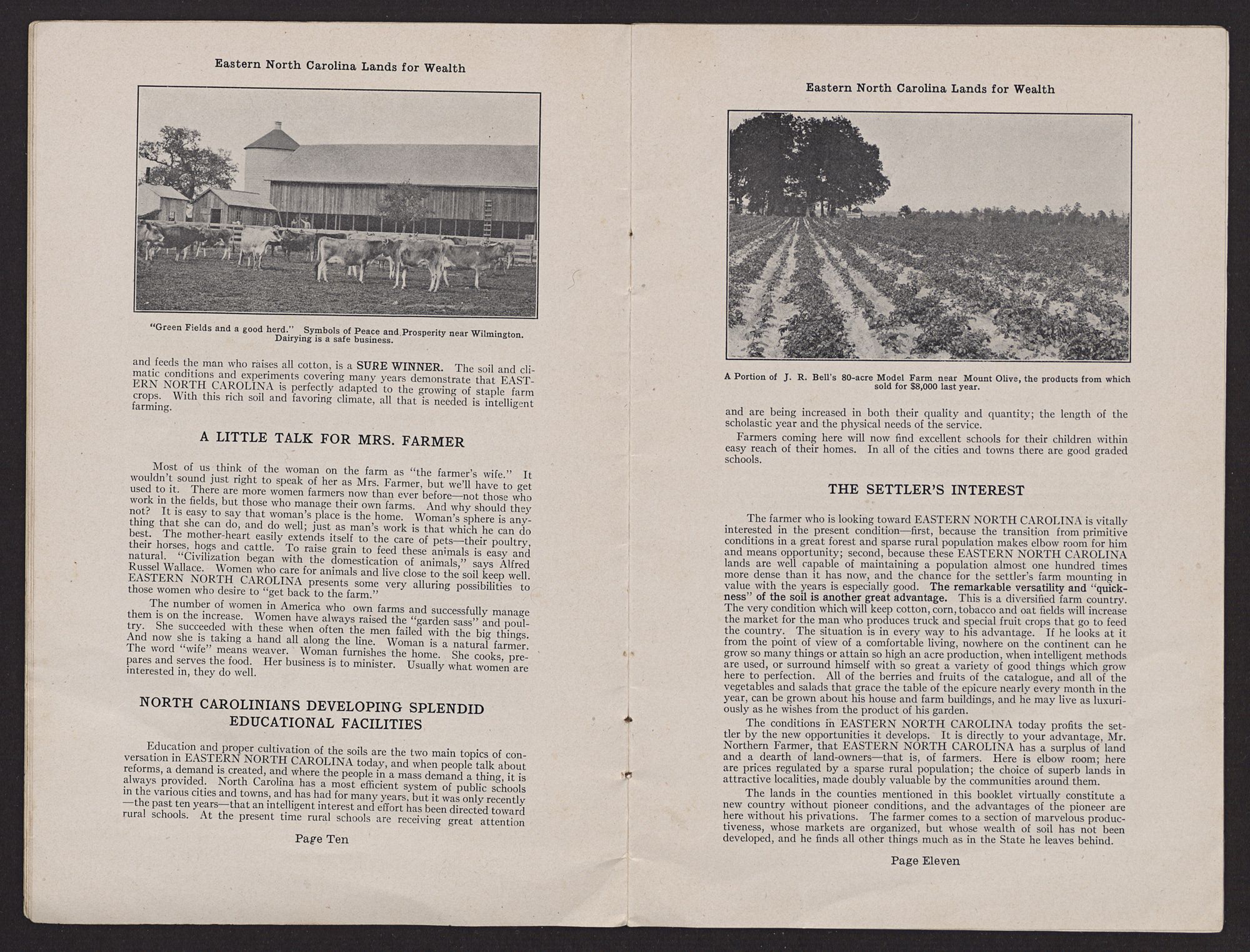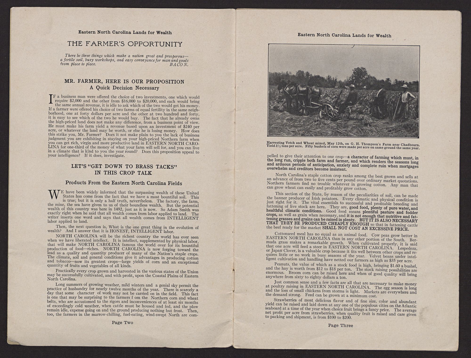 The conditions in EASTERN NORTH CAROLINA today profits the settler by the new opportunities it develops. It is directly to your advantage. Mr. Northern Farmer, that EASTERN NORTH CAROLINA has a surplus of land and a dearth of land-owners—that is, of farmers. Here is elbow room; here are prices regulated by a sparse rural population; the choice of superb lands in attractive localities, made doubly valuable by the communities around them.