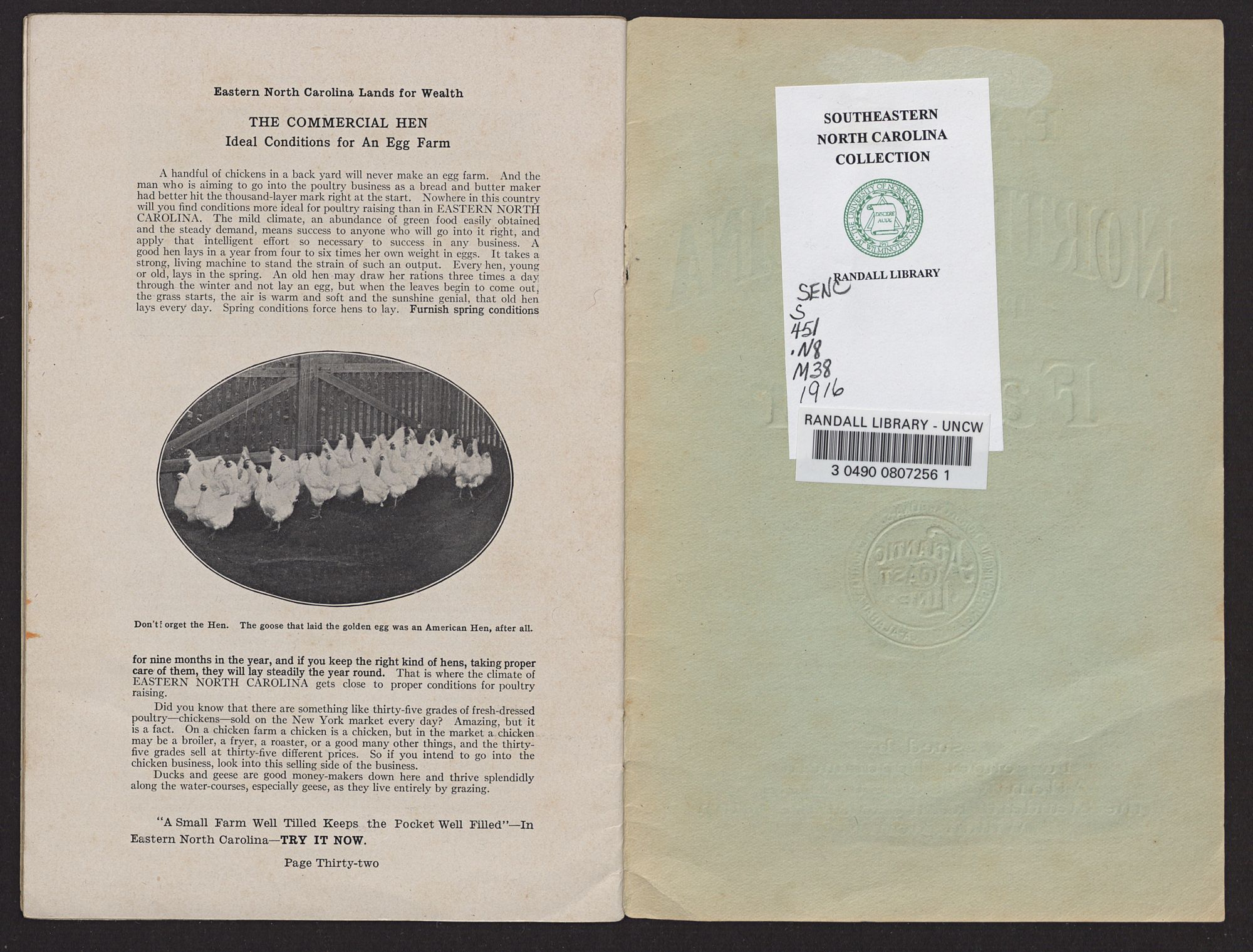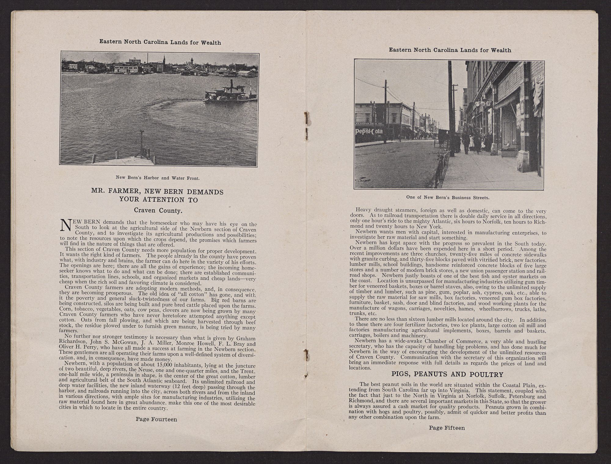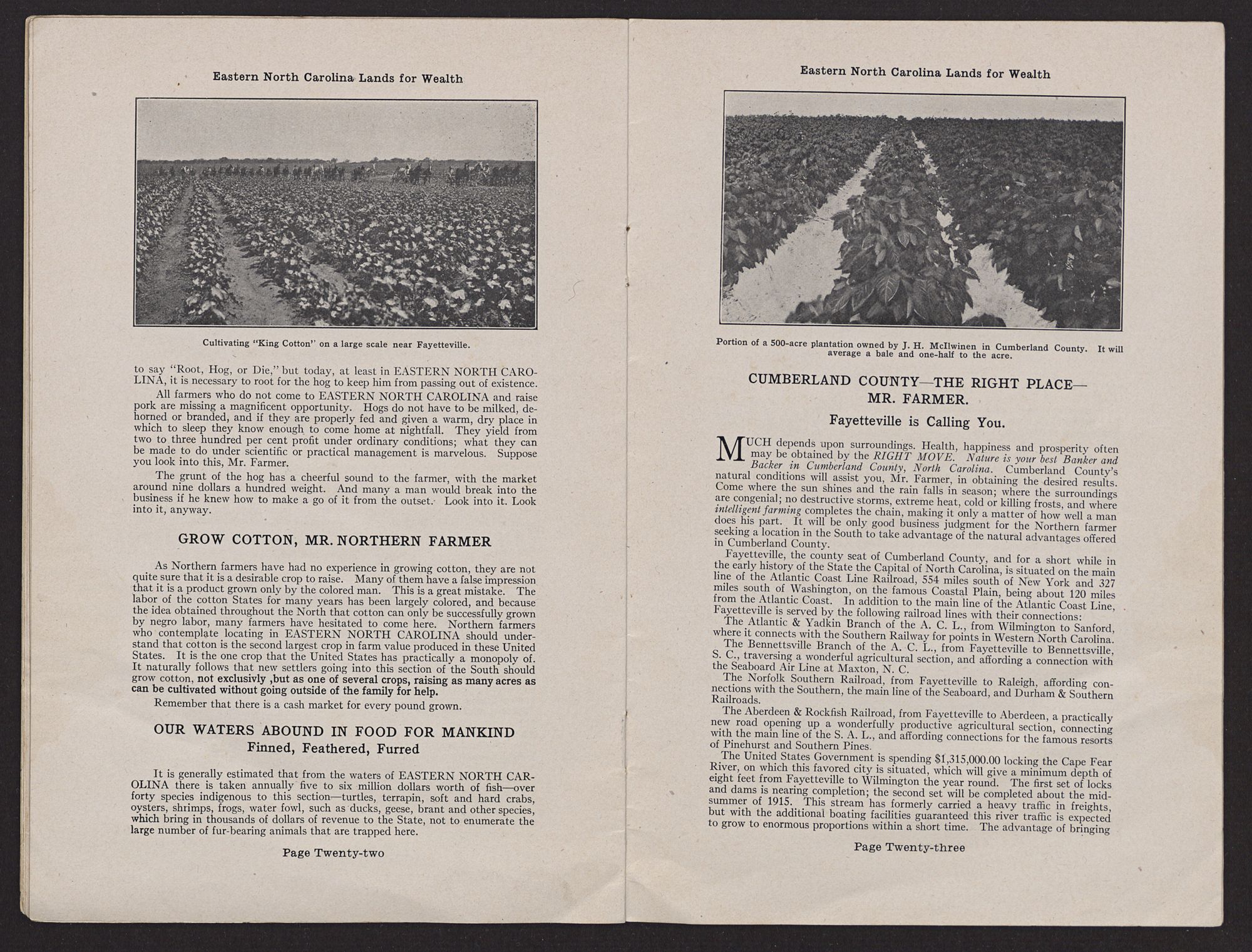 The conditions in EASTERN NORTH CAROLINA today profits the settler by the new opportunities it develops. It is directly to your advantage. Mr. Northern Farmer, that EASTERN NORTH CAROLINA has a surplus of land and a dearth of land-owners—that is, of farmers. Here is elbow room; here are prices regulated by a sparse rural population; the choice of superb lands in attractive localities, made doubly valuable by the communities around them.