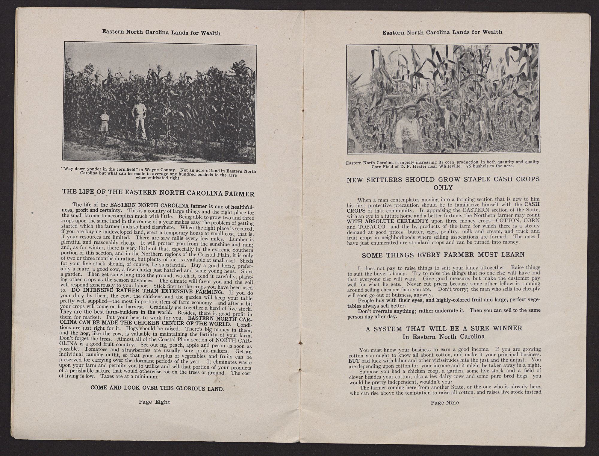 When a man contenplates moving into a farming section that is new to him his first protective precaution should be to familiarize himself with the CASH CROPS of that community. In appraising the EASTERN section of the State, with an eye to a future home and a better fortune, the Northern farmer may count WITH ABSOLUTE CERTAINTY upon three money crops—COTTON, CORN and TOBACCO—and the by-products of the farm for which there is a steady demand at good prices—butter, eggs, poultry, milk and cream, and truck and fruit crops in neighborhoods where selling associations are formed. The ones I have just enumerated are standard crops and can be turned into money.