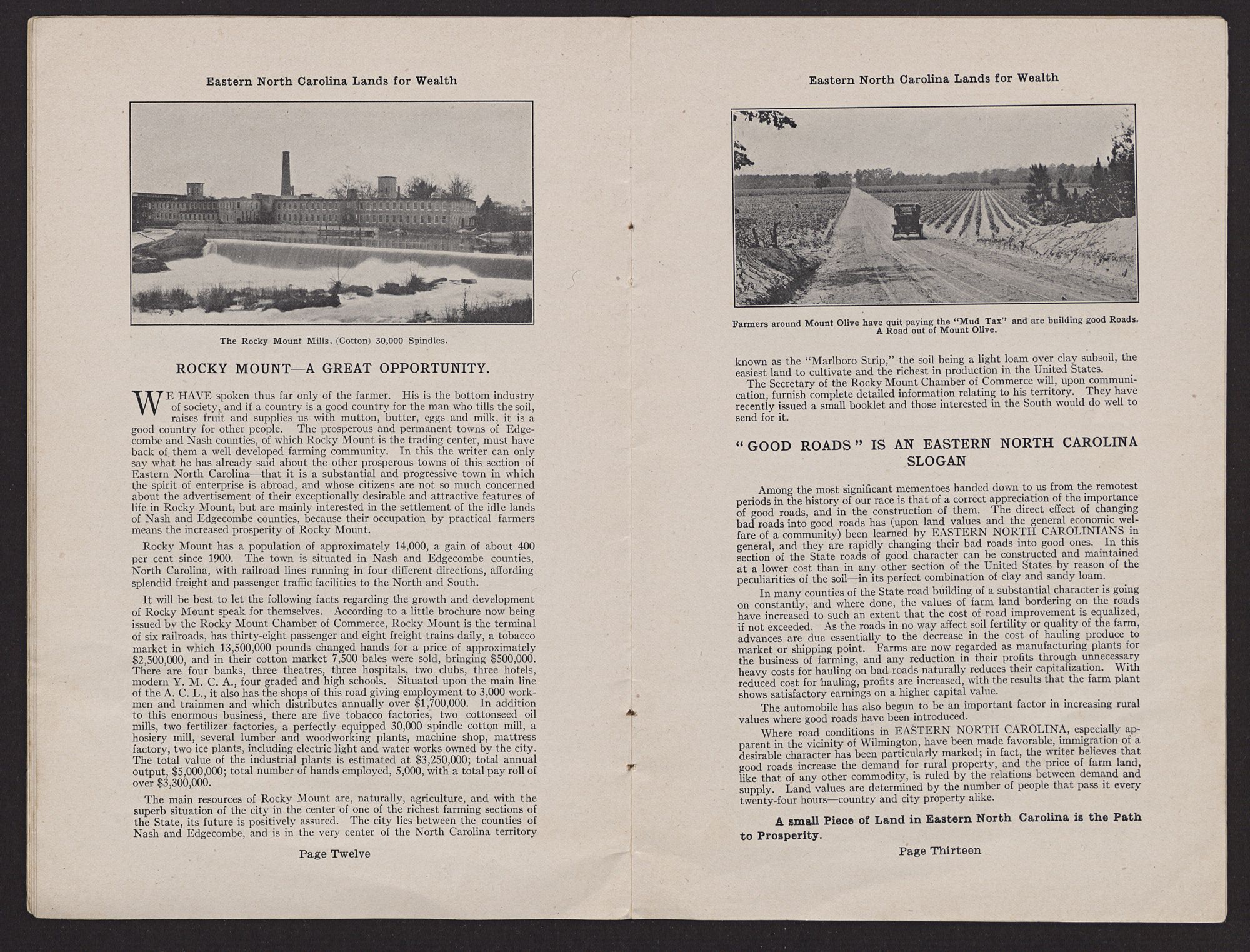 WE HAVE spoken thus far only of the farmer. His is the bottom industry of society, and if a country is a good country for the man who tills the soil, raises fruit and supplies us with mutton, butter, eggs and milk, it is a good country for other people. The prosperous and permanent towns of Edgecombe and Nash counties, of which Rocky Mount is the trading center, must have back of them a well developed farming community. In this the writer can only say what he has already said about the other prosperous towns of this section of Eastern North Carolina—that it is a substantial and progressive town in which the spirit of enterprise is abroad, and whose citizens are not so much concerned about the advertisement of their exceptionally desirable and attractive features of life in Rocky Mount, but are mainly interested in the settlement of the idle lands of Nash and Edgecombe counties, because their occupation by practical farmers means the increased prosperity of Rocky Mount.