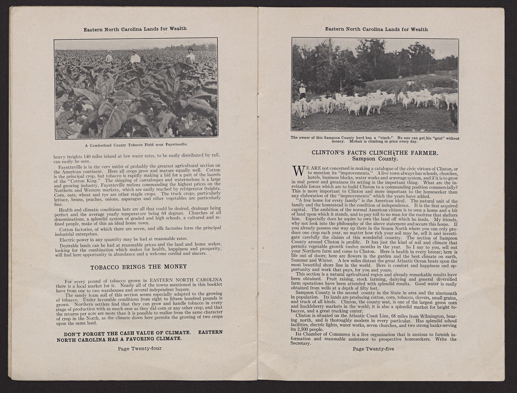 TOBACCO BRINGS THE MONEYFor every pound of tobacco grown in EASTERN NORTH CAROLINA there is a local market for it. Nearly all of the towns mentioned in this booklet have from one to two warehouses and several independent buyers.