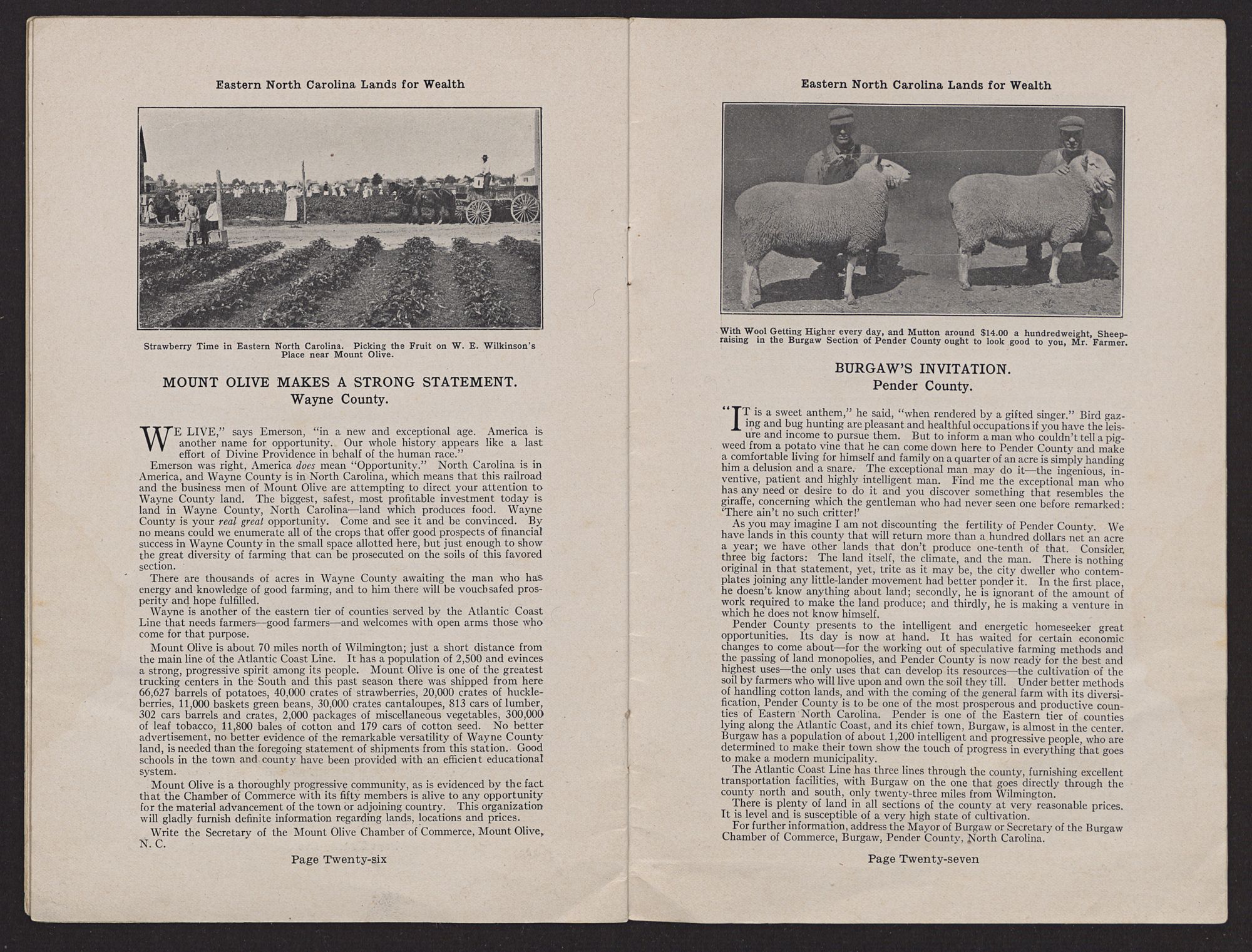 Emerson was right, America does mean “Opportunity.” North Carolina is in America, and Wayne County is in North Carolina, which means that this railroad and the business men of Mount Olive are attempting to direct your attention to Wayne County land. The biggest, safest, most profitable investment today is land in Wayne County, North Carolina—land which produces food. Wayne County is your real great opportunity. Come and see it and be convinced. By no means could we enumerate all of the crops that offer good prospects of financial success in Wayne County in the small space allotted here, but just enough to show the great diversity of farming that can be prosecuted on the soils of this favored section.