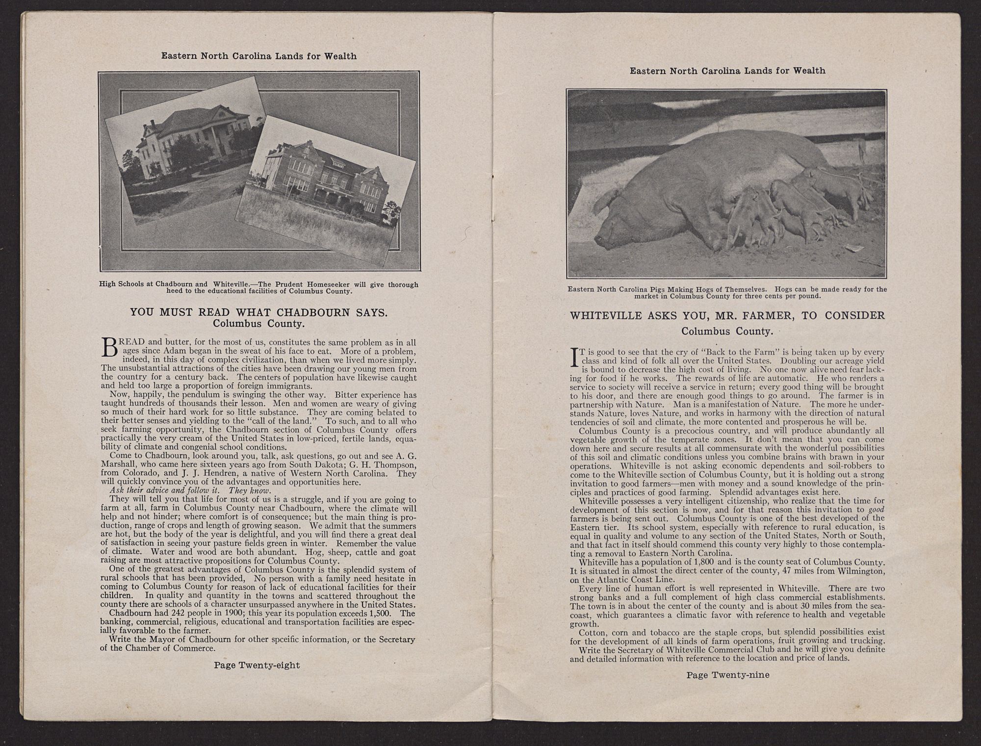 Whiteville possesses a very intelligent citizenship, who realize that the time for development of this section is now, and for that reason this invitation to good farmers is being sent out. Columbus County is one of the best developed of the Eastern tier. Its school system, especially with reference to rural education, is equal in quality and volume to any section of the United States, North or South, and that fact in itself should commend this county very highly to those contemplating a removal to Eastern North Carolina.