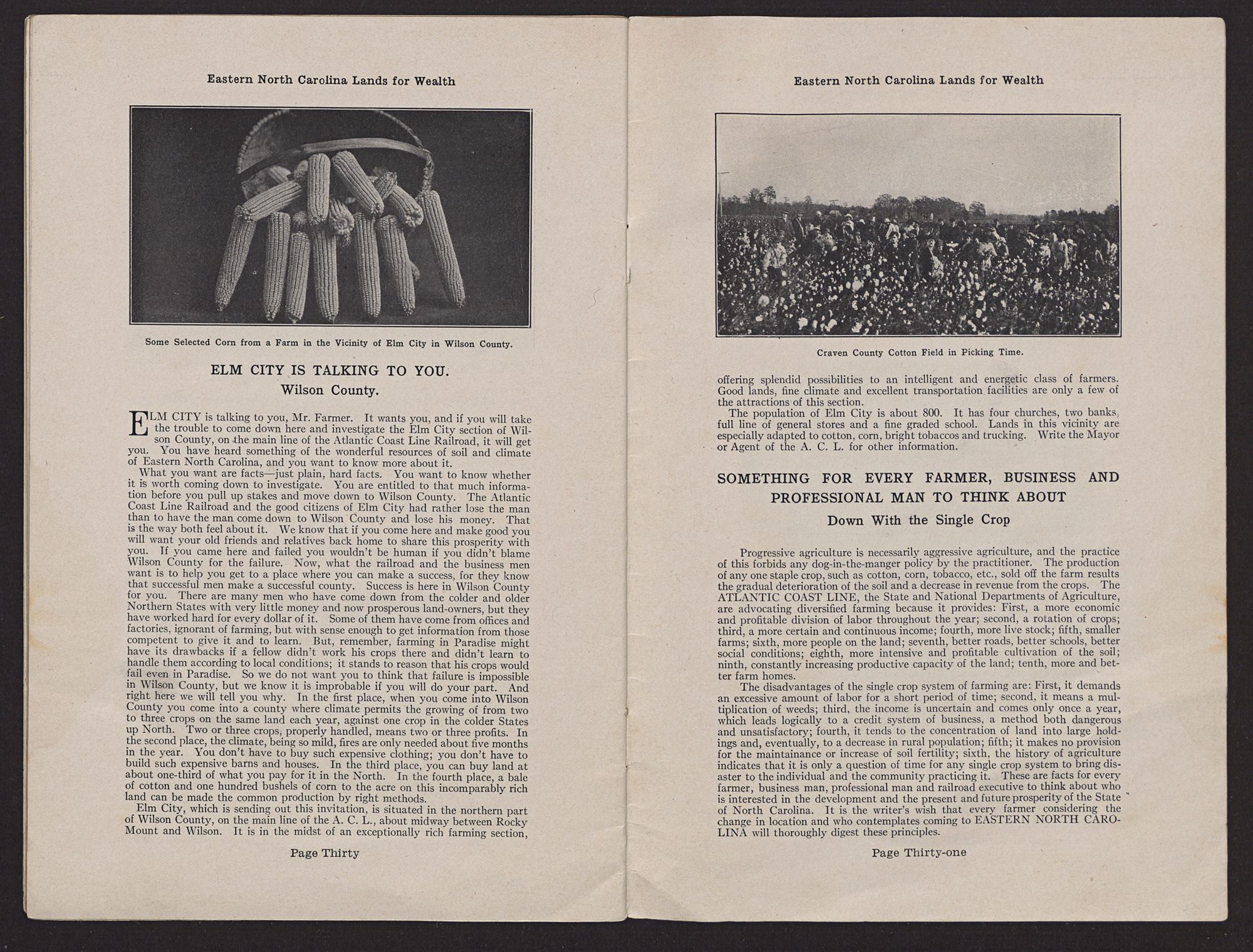 ELM CITY is talking to you, Mr. Farmer. It wants you, and if you will take the trouble to come down here and investigate the Elm City section of Wilson County, on the main line of the Atlantic Coast Line Railroad, it will get you. You have heard something of the wonderful resources of soil and climate of Eastern North Carolina, and you want to know more about it.