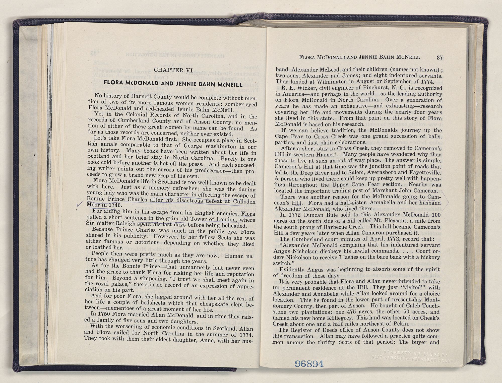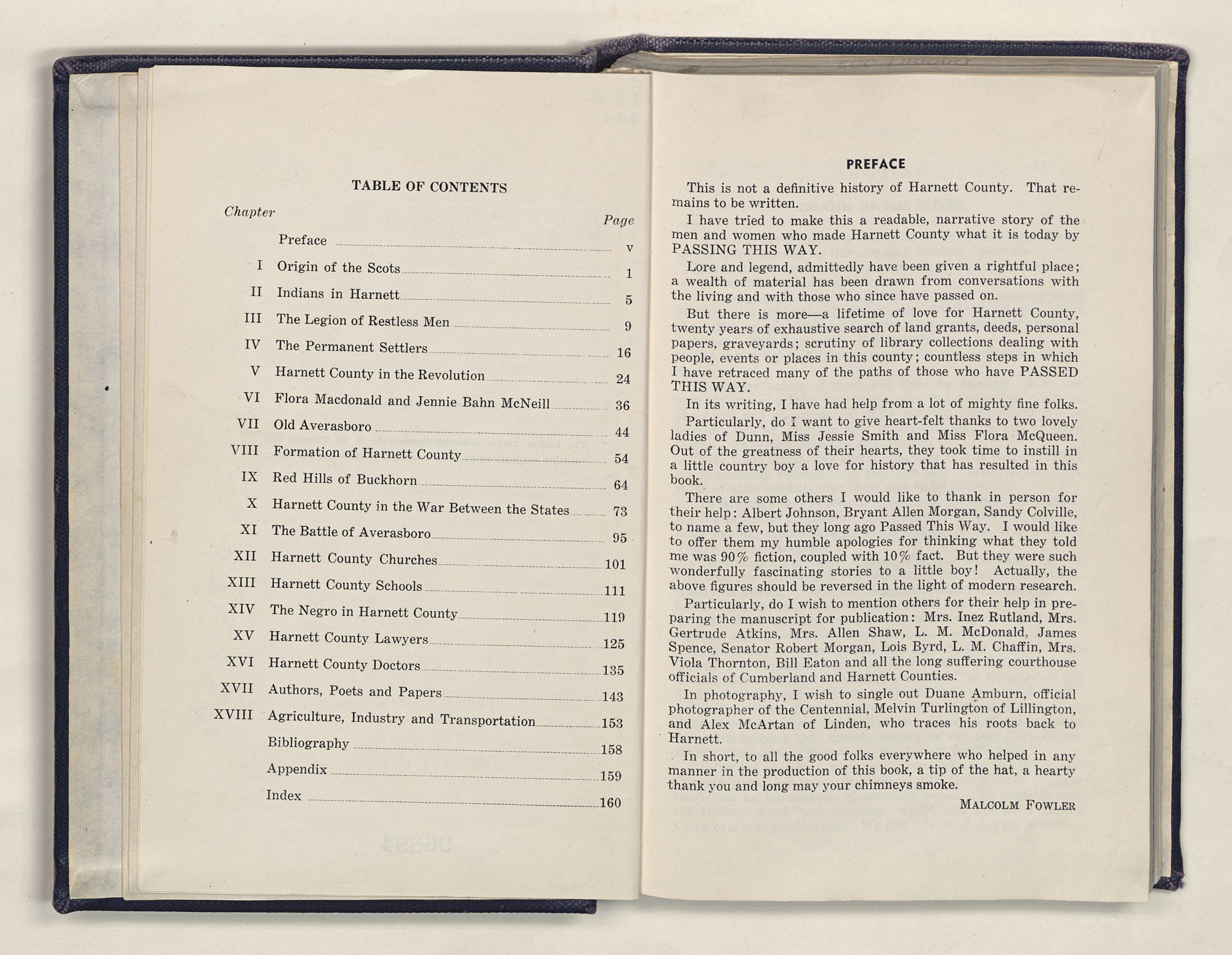 Particularly, do I wish to mention others for their help in preparing the manuscript for publication: Mrs. Inez Rutland, Mrs. Gertrude Atkins, Mrs. Allen Shaw, L. M. McDonald, James Spence, Senator Robert Morgan, Lois Byrd, L. M. Chaffin, Mrs. Viola Thornton, Bill Eaton and all the long suffering courthouse officials of Cumberland and Harnett Counties.