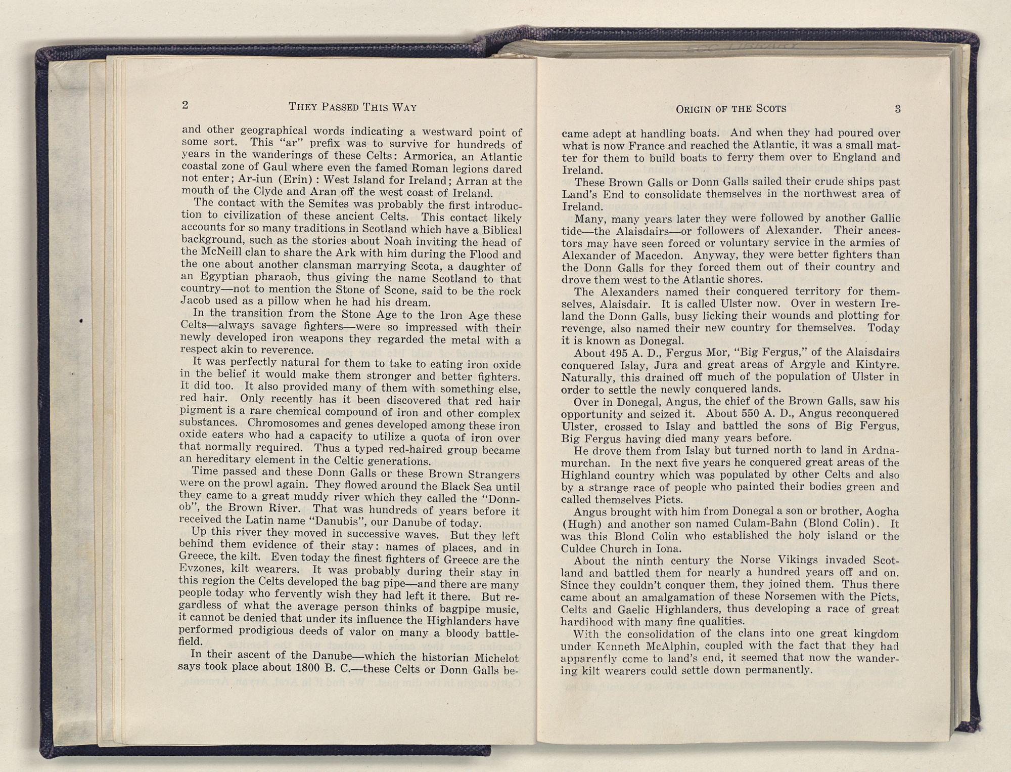 Over in Donegal, Angus, the chief of the Brown Galls, saw his opportunity and seized it. About 550 A. D., Angus reconquered Ulster, crossed to Islay and battled the sons of Big Fergus, Big Fergus having died many years before.