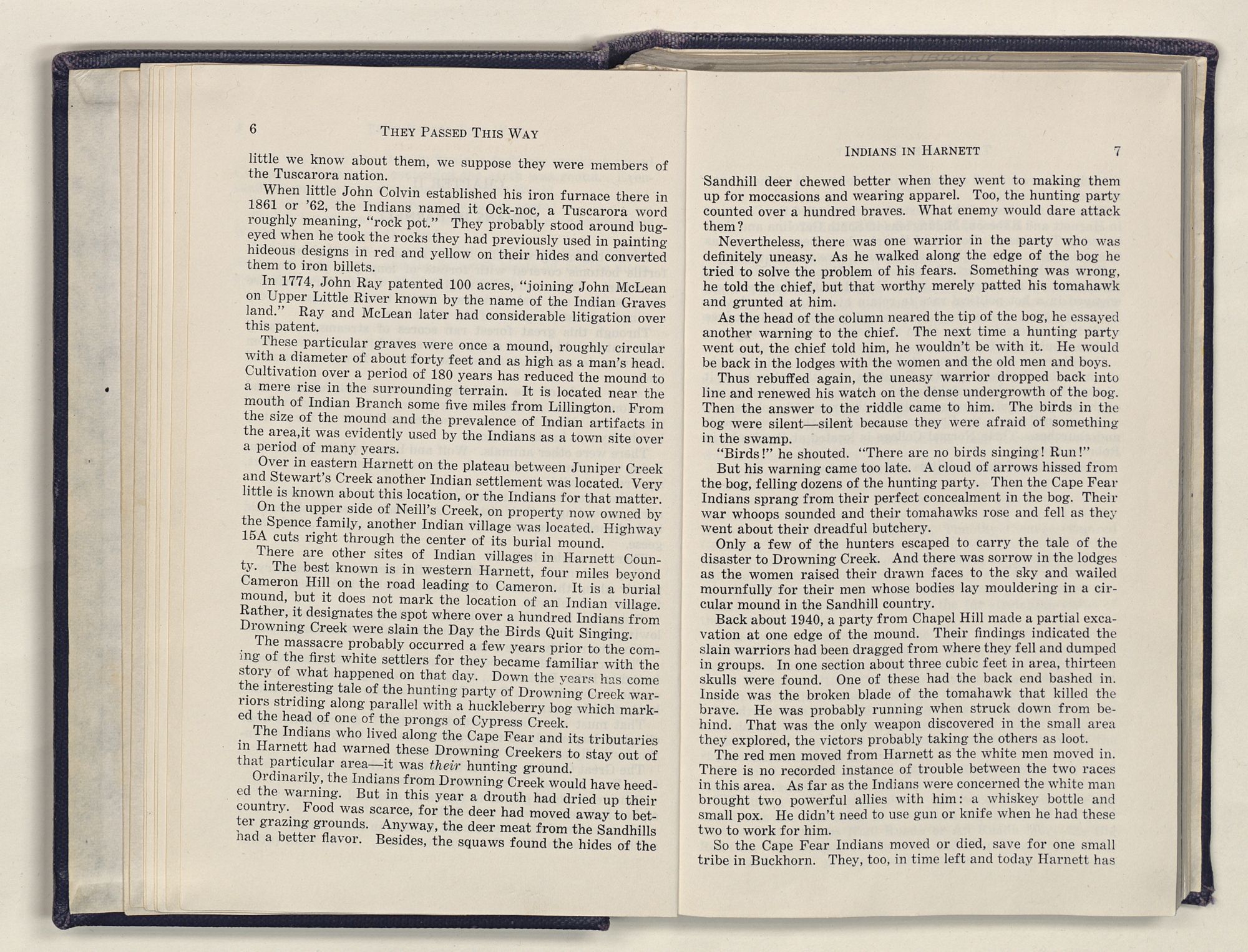 The Indians who lived along the Cape Fear and its tributaries in Harnett had warned these Drowning Creekers to stay out of that particular area—it was their hunting ground.