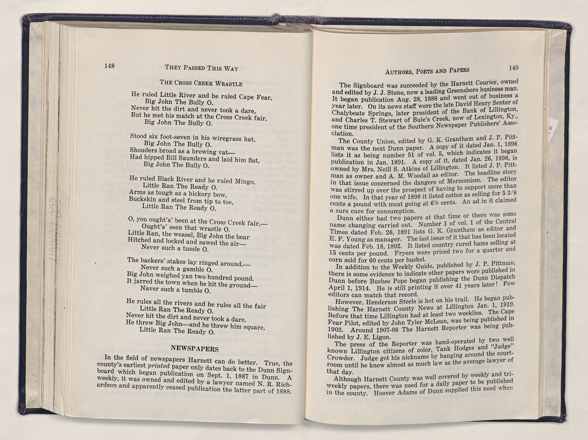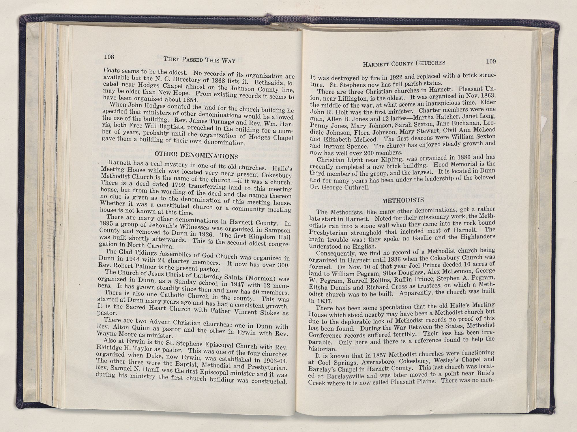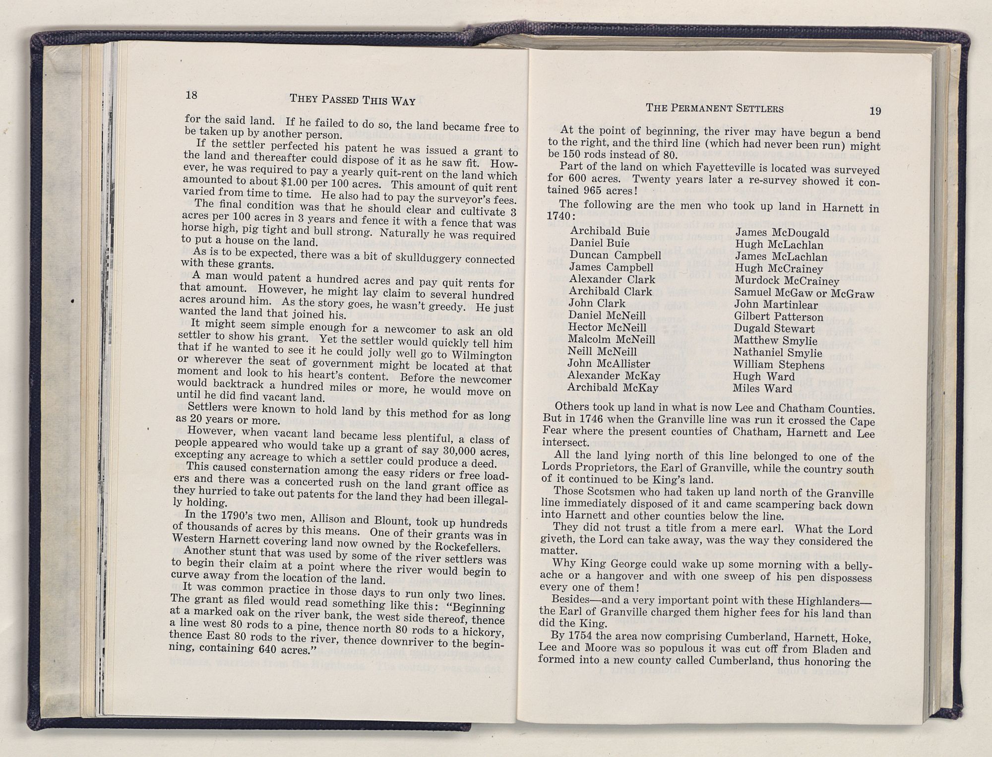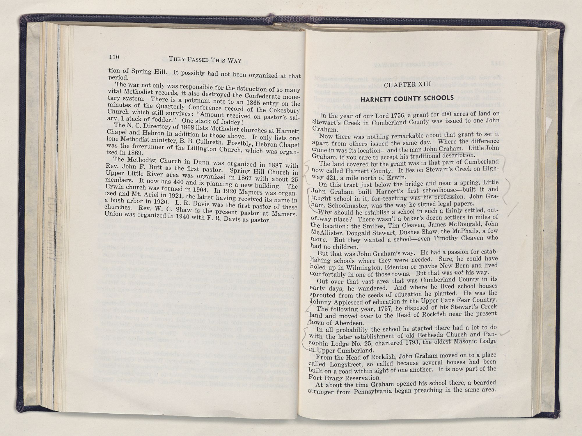 But there is more—a lifetime of love for Harnett County, twenty years of exhaustive search of land grants, deeds, personal papers, graveyards; scrutiny of library collections dealing with people, events or places in this county; countless steps in which I have retraced many of the paths of those who have PASSED THIS WAY.
