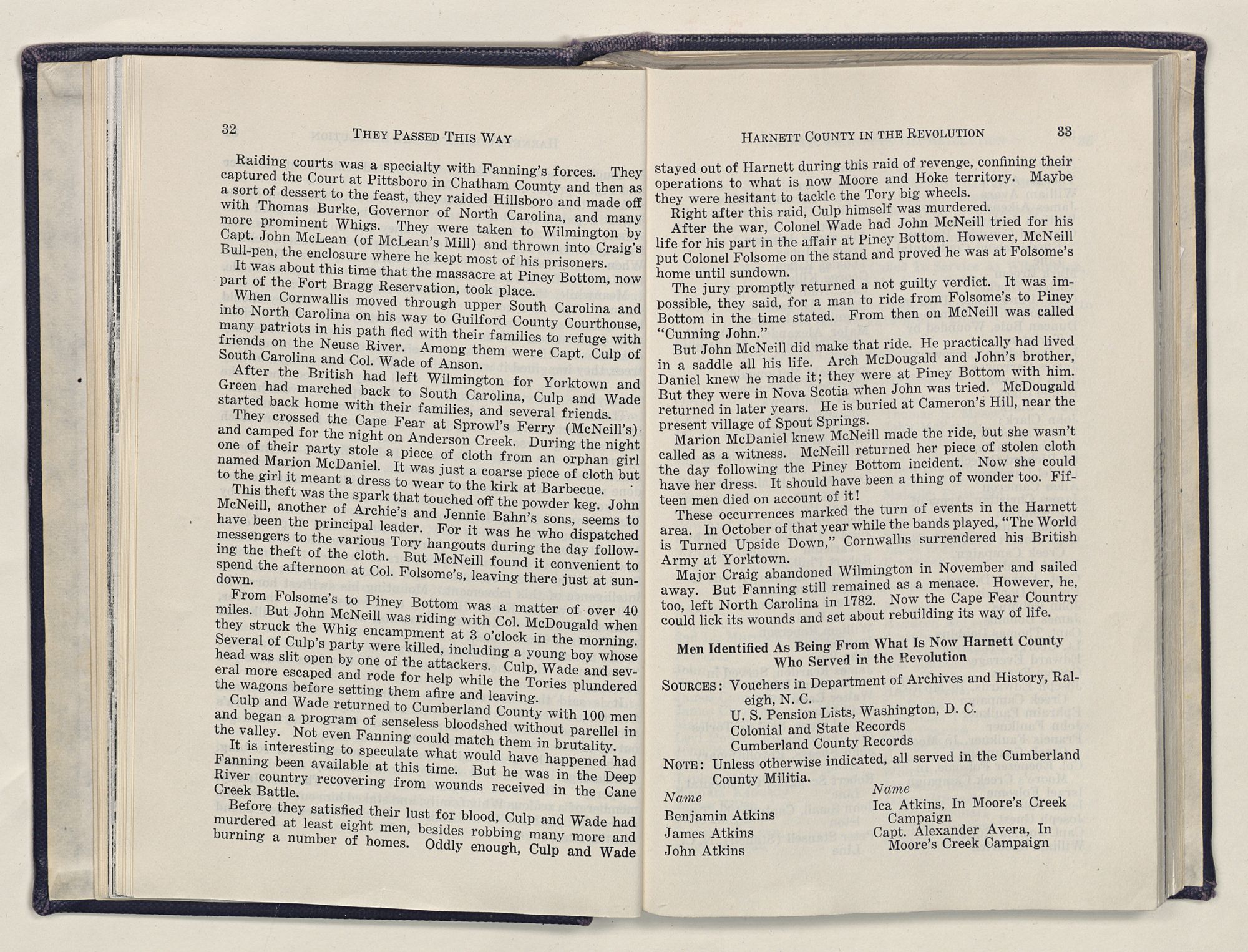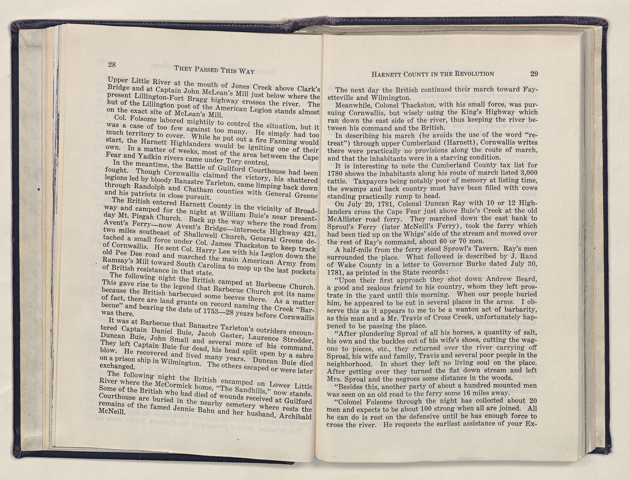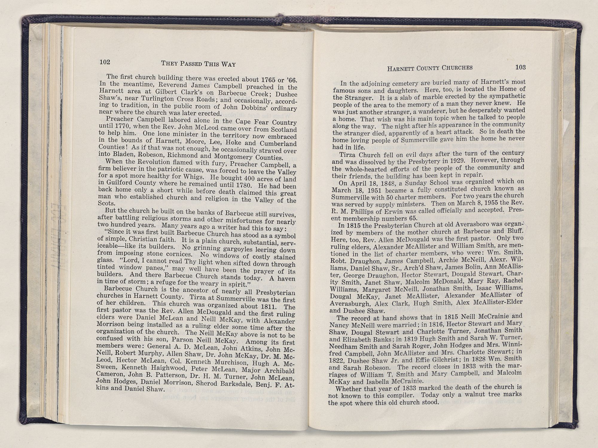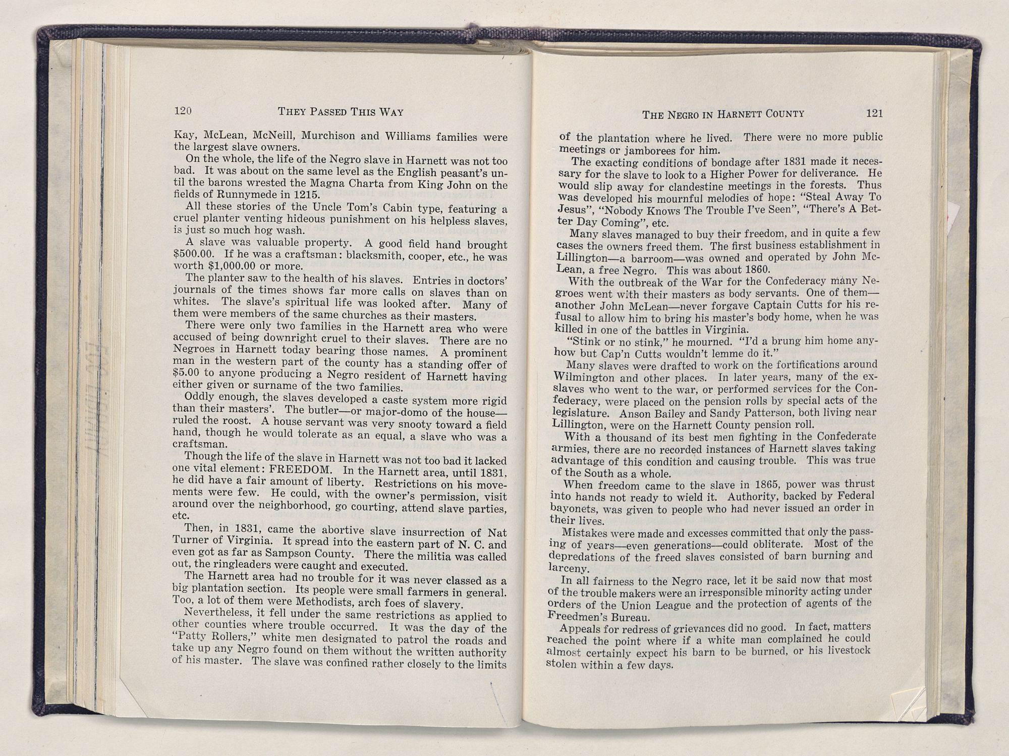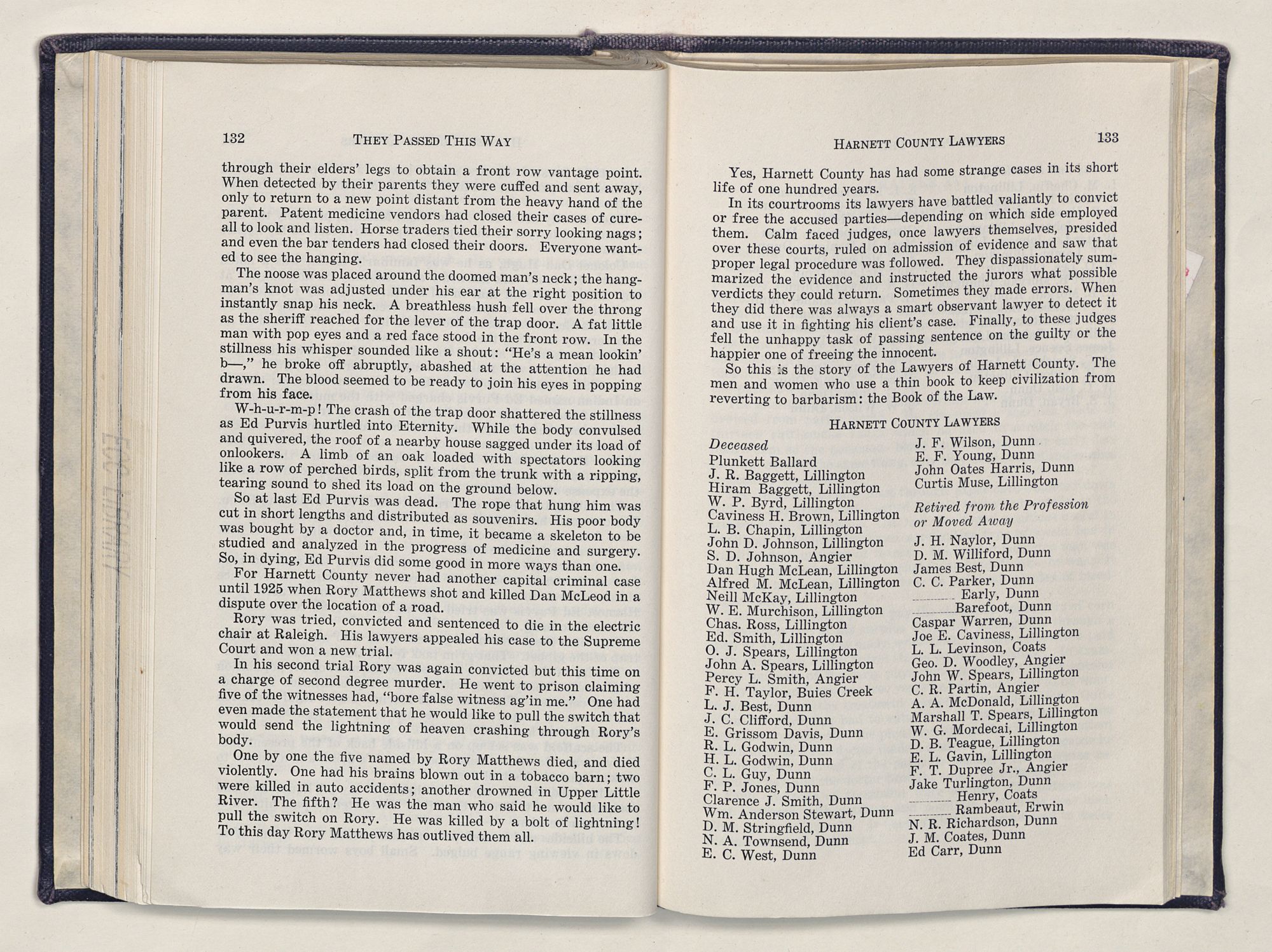 But there is more—a lifetime of love for Harnett County, twenty years of exhaustive search of land grants, deeds, personal papers, graveyards; scrutiny of library collections dealing with people, events or places in this county; countless steps in which I have retraced many of the paths of those who have PASSED THIS WAY.