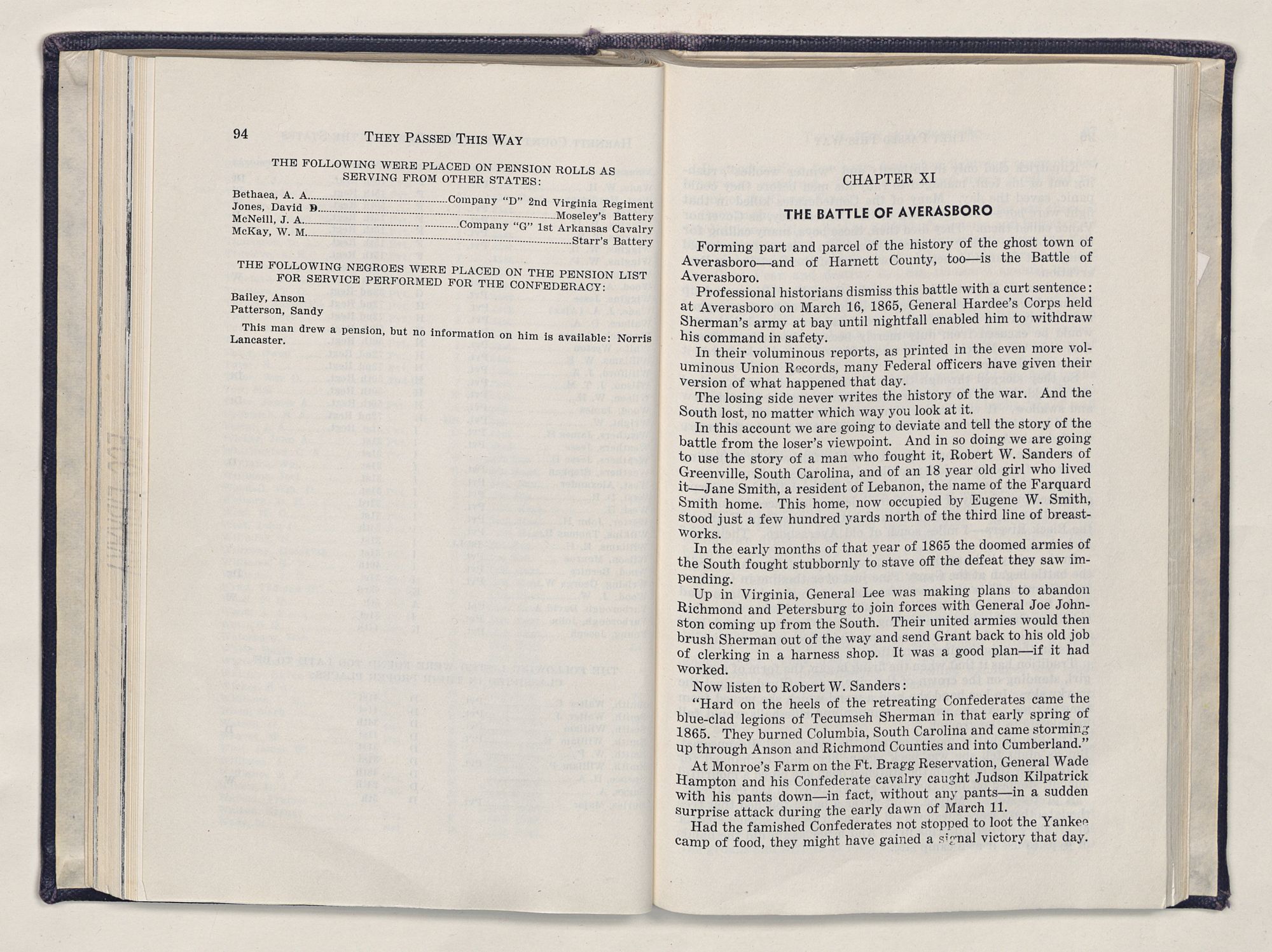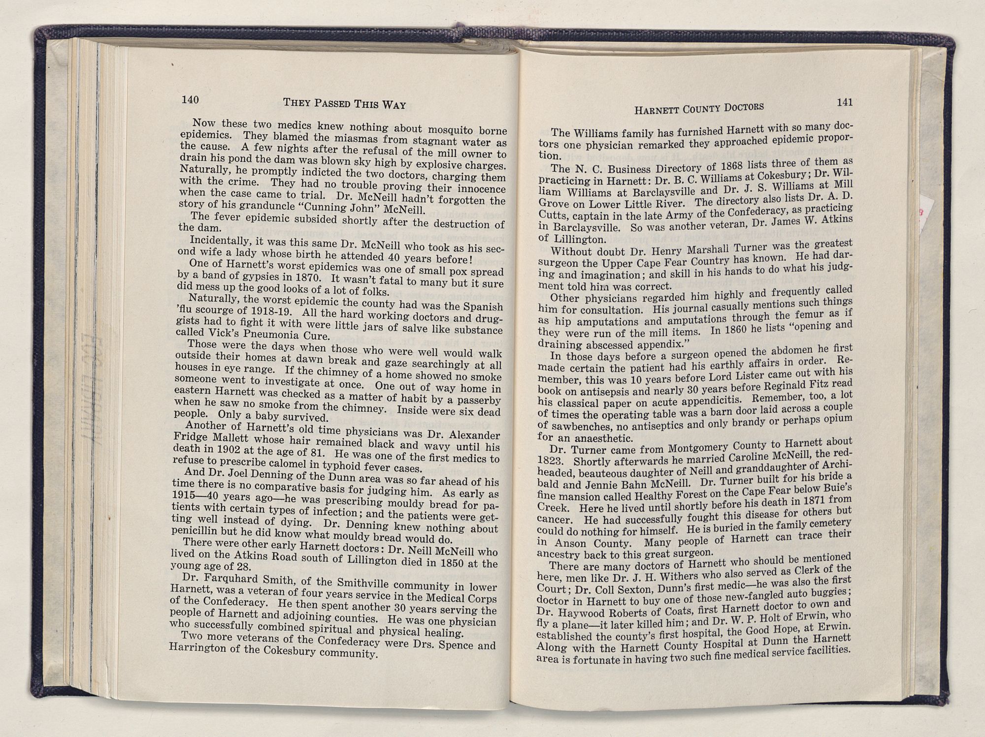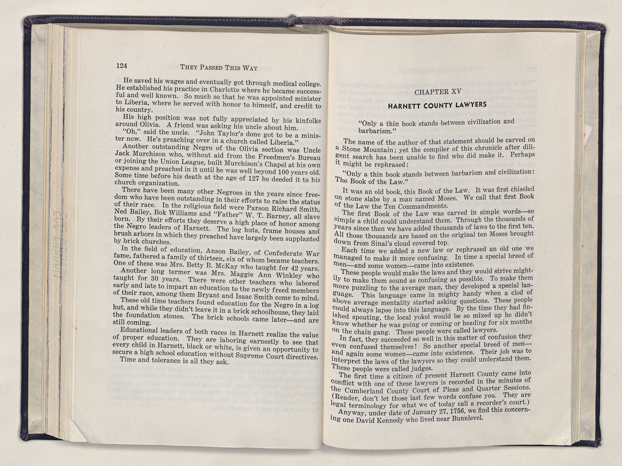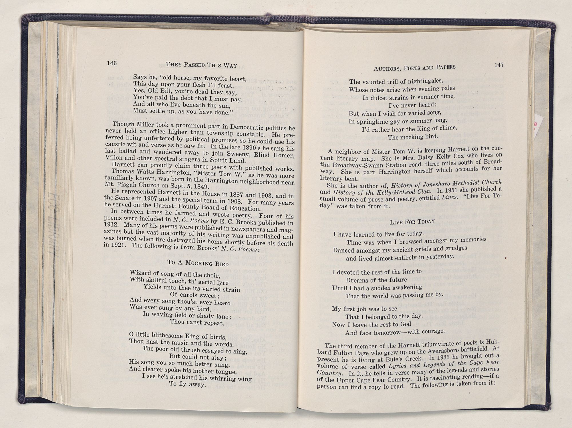 But there is more—a lifetime of love for Harnett County, twenty years of exhaustive search of land grants, deeds, personal papers, graveyards; scrutiny of library collections dealing with people, events or places in this county; countless steps in which I have retraced many of the paths of those who have PASSED THIS WAY.