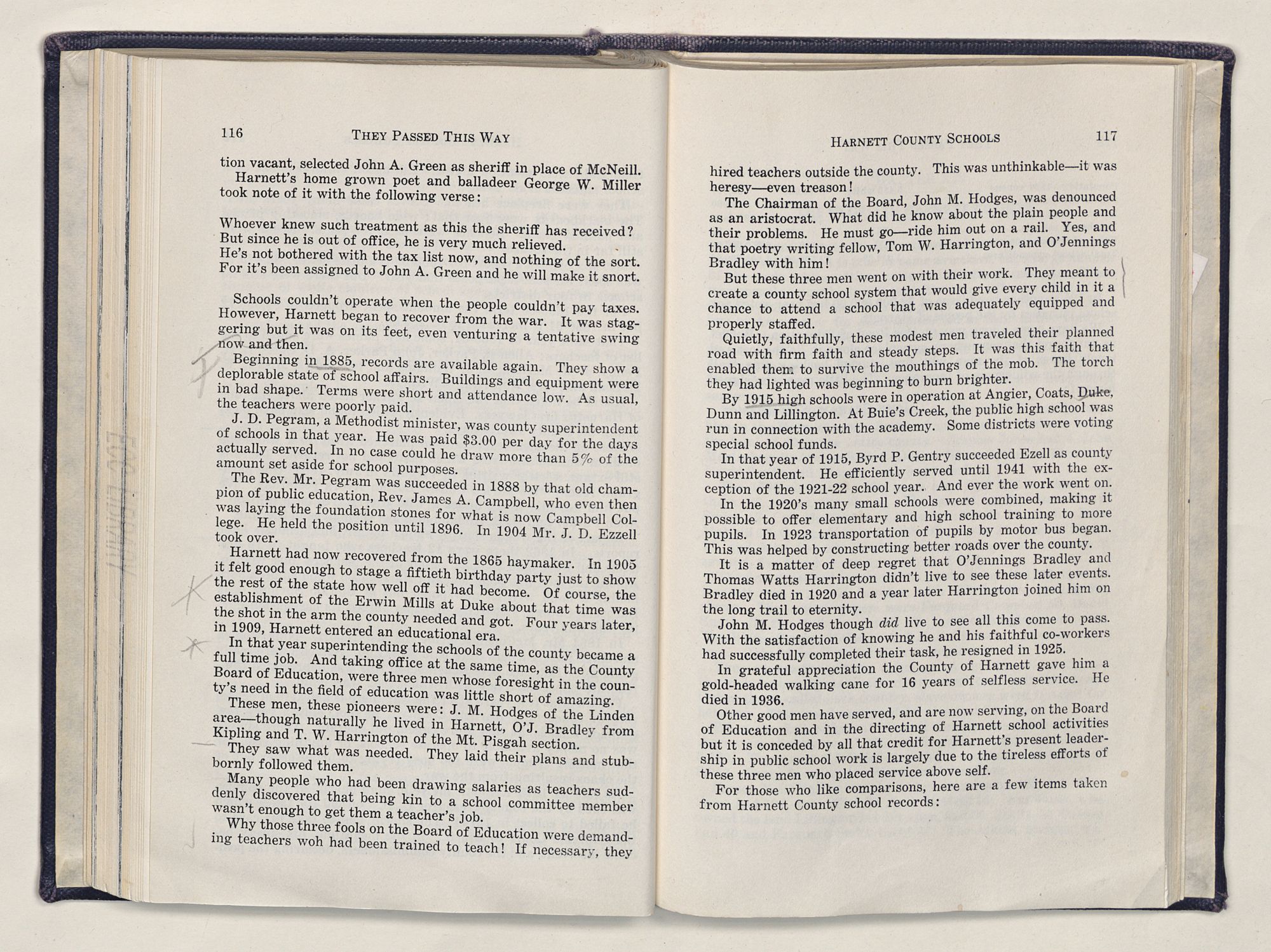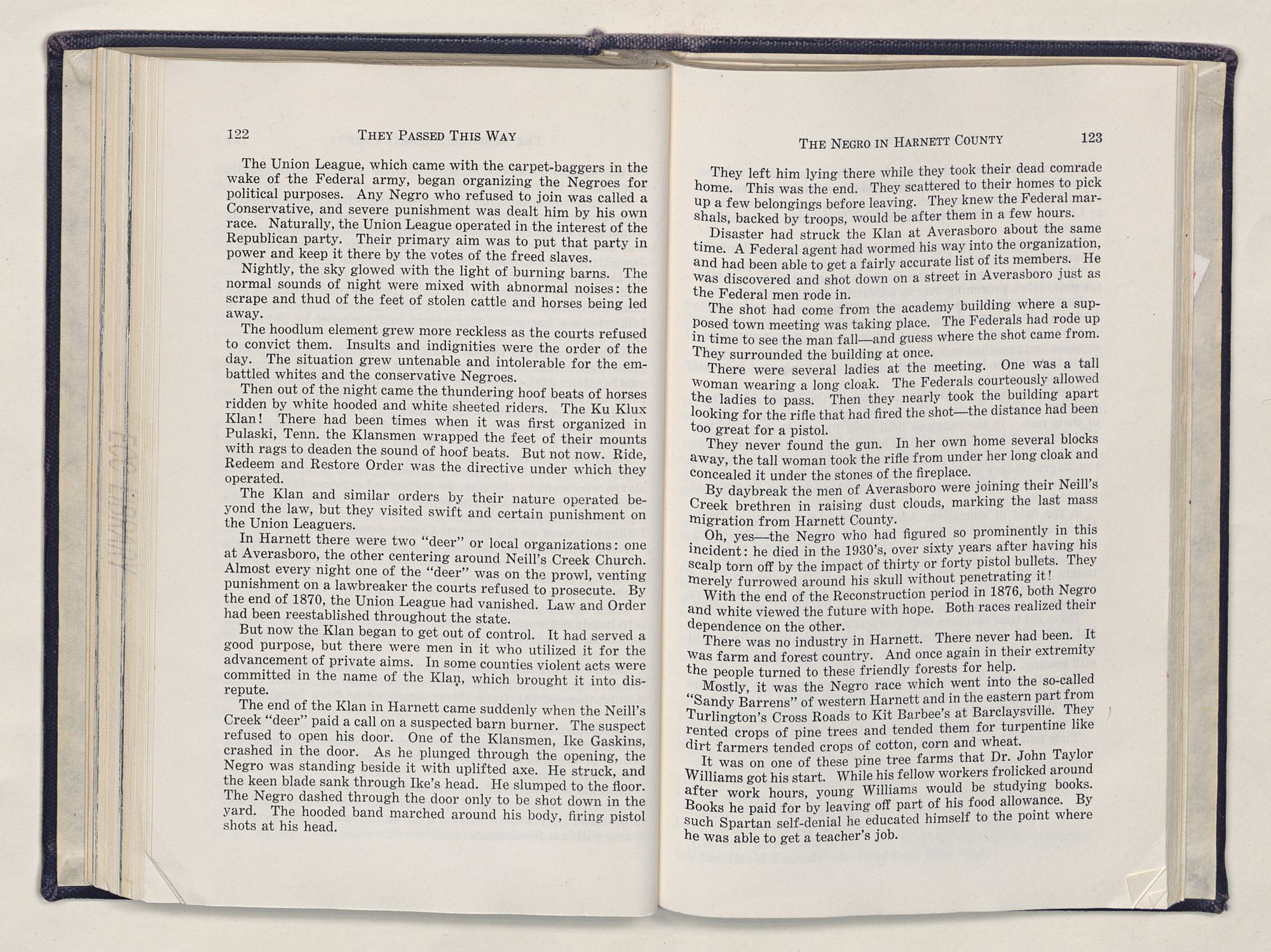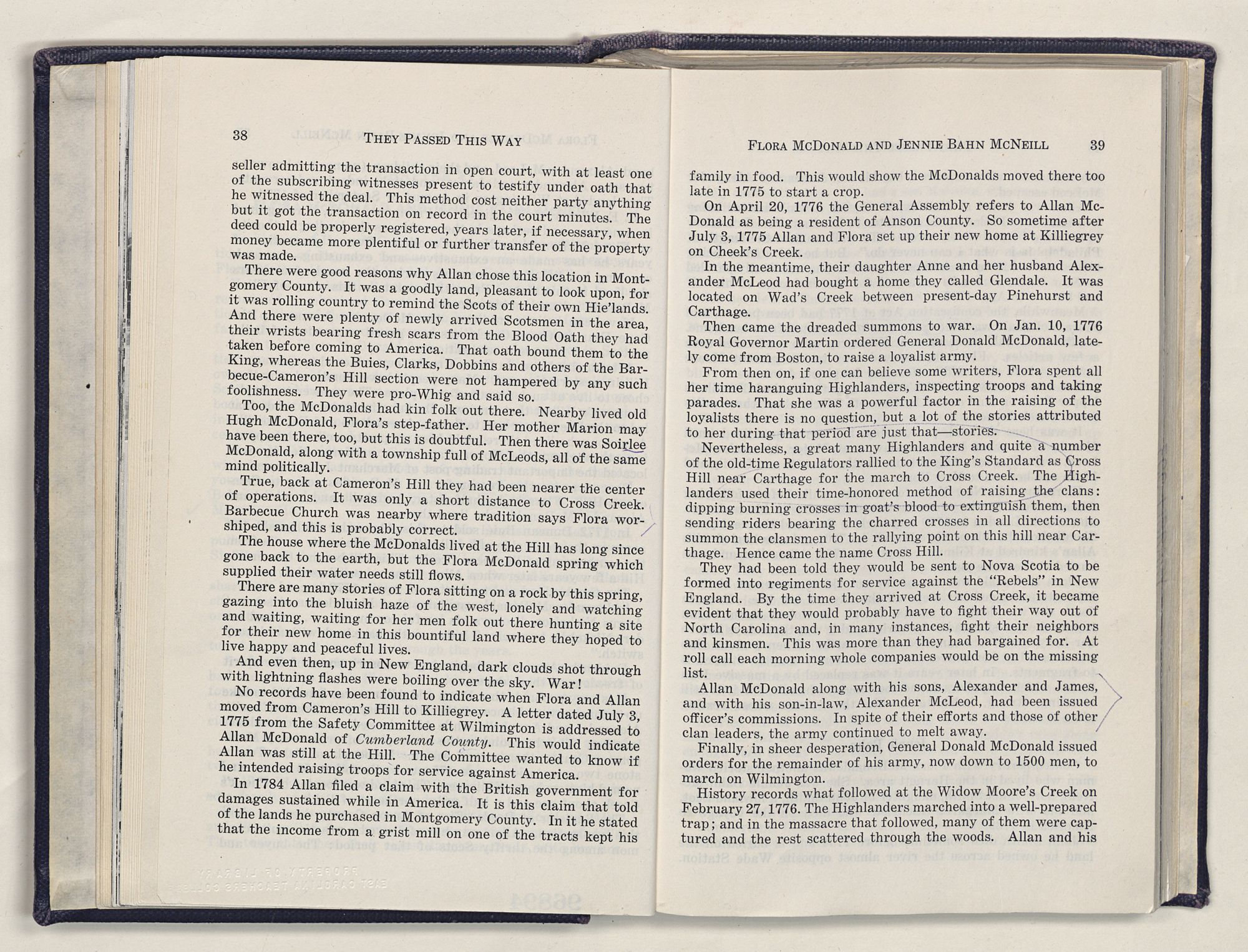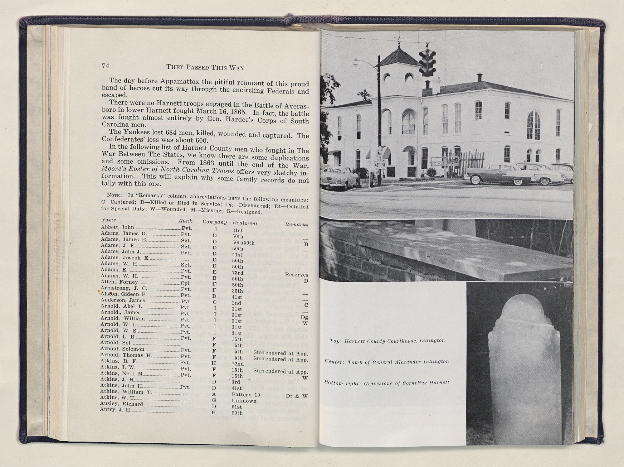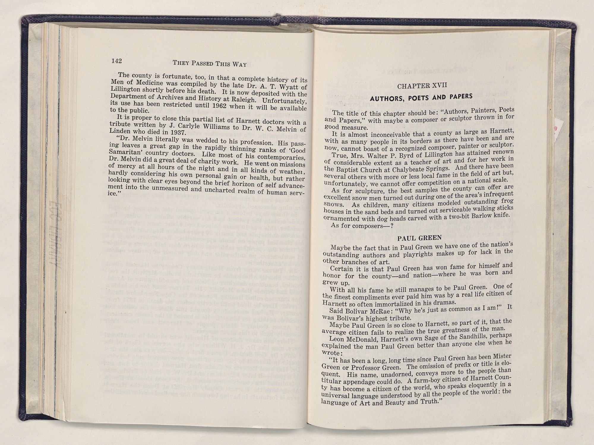 But there is more—a lifetime of love for Harnett County, twenty years of exhaustive search of land grants, deeds, personal papers, graveyards; scrutiny of library collections dealing with people, events or places in this county; countless steps in which I have retraced many of the paths of those who have PASSED THIS WAY.