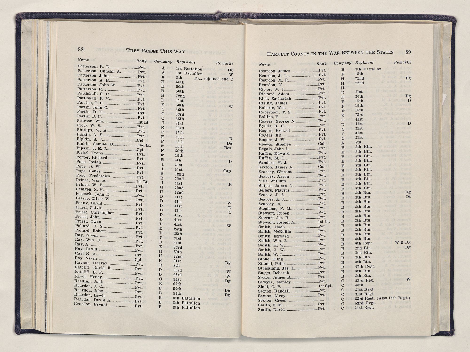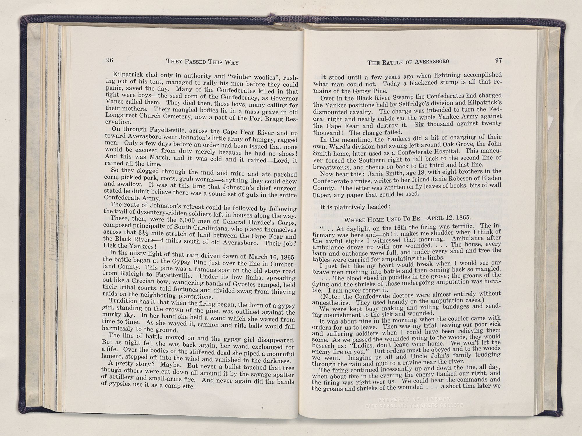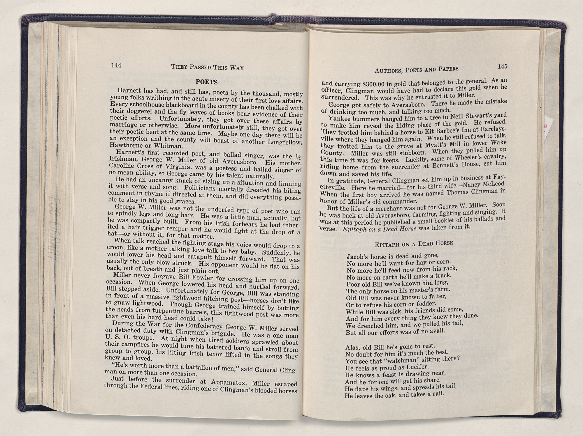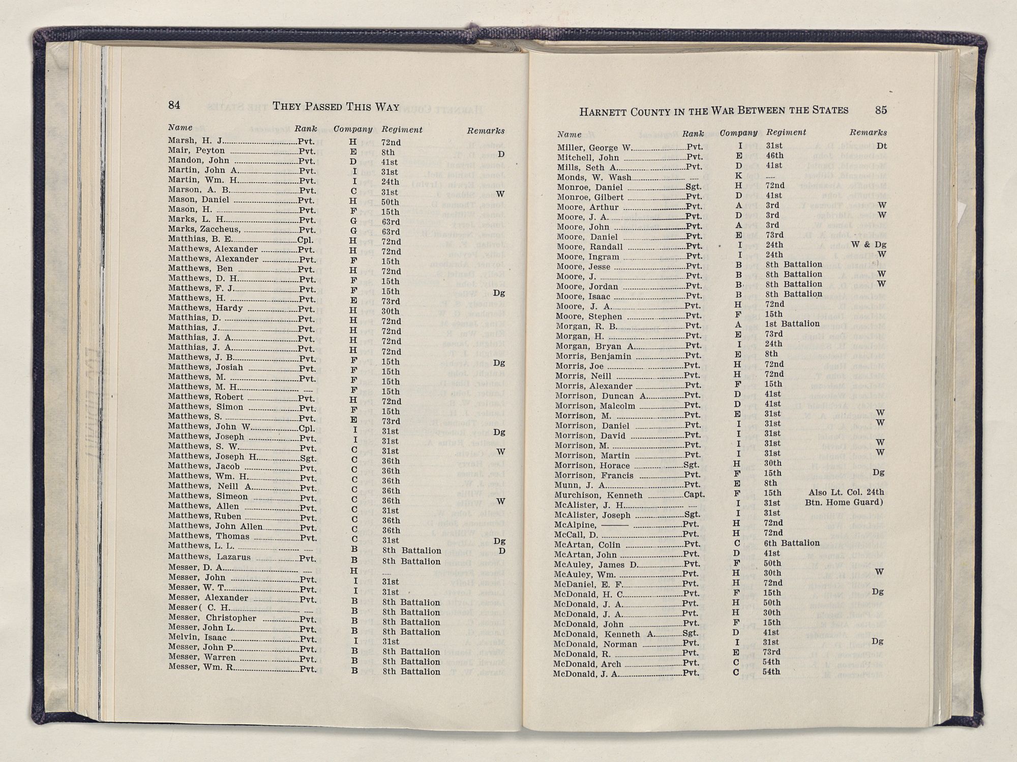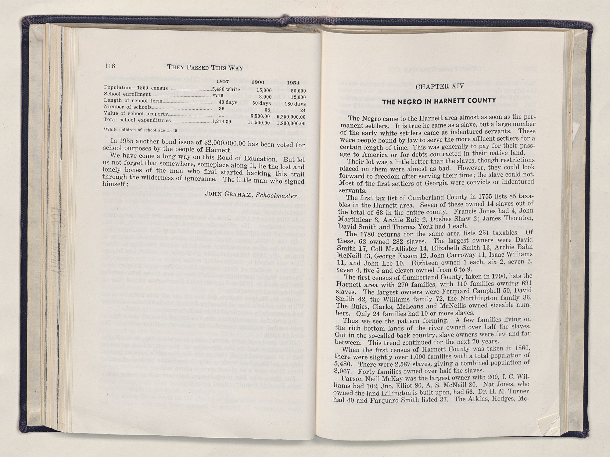 But there is more—a lifetime of love for Harnett County, twenty years of exhaustive search of land grants, deeds, personal papers, graveyards; scrutiny of library collections dealing with people, events or places in this county; countless steps in which I have retraced many of the paths of those who have PASSED THIS WAY.