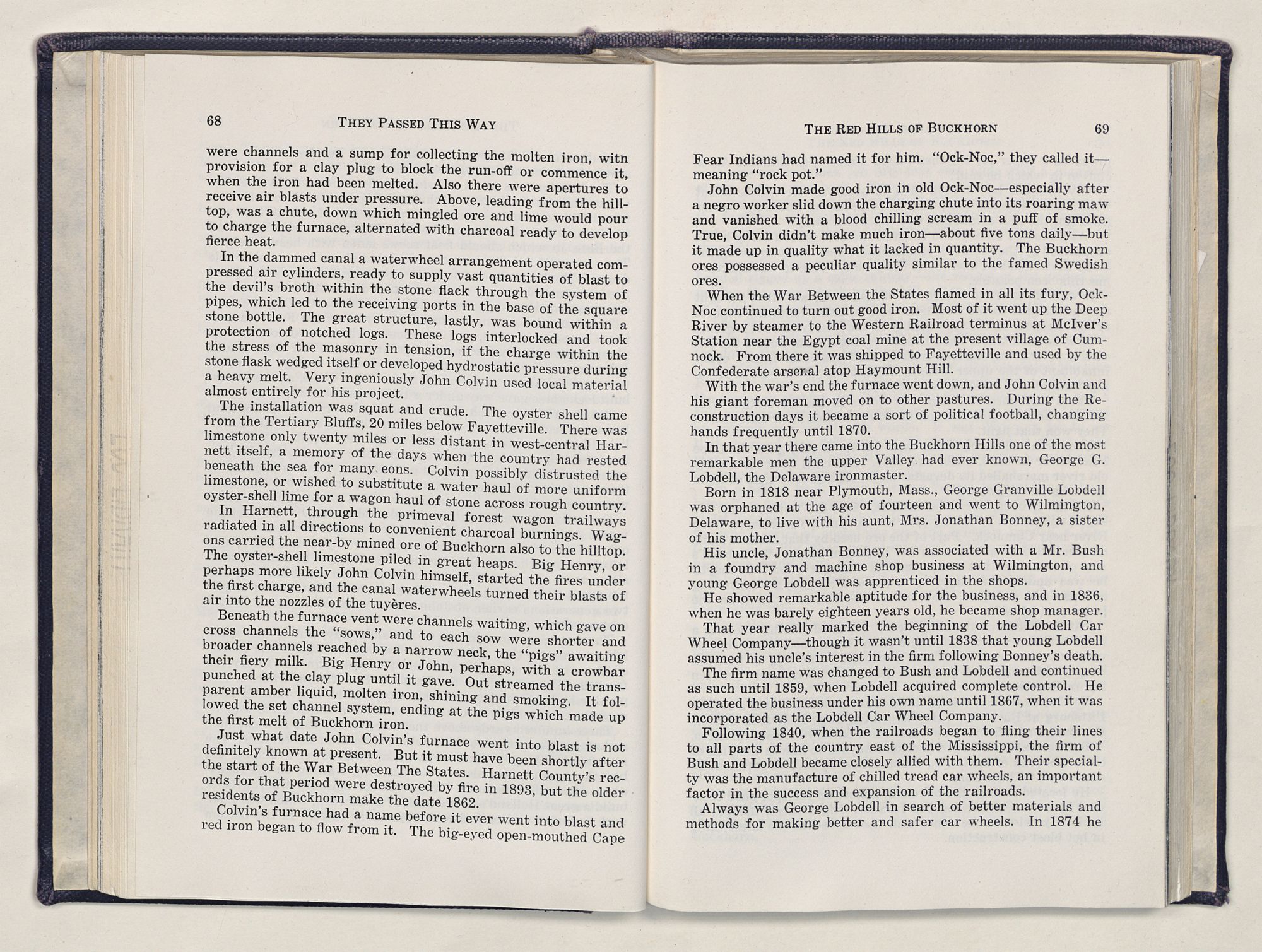 When little John Colvin established his iron furnace there in 1861 or ’62, the Indians named it Ock-noc, a Tuscarora word roughly meaning, “rock pot.” They probably stood around bugeyed when he took the rocks they had previously used in painting hideous designs in red and yellow on their hides and converted them to iron billets.