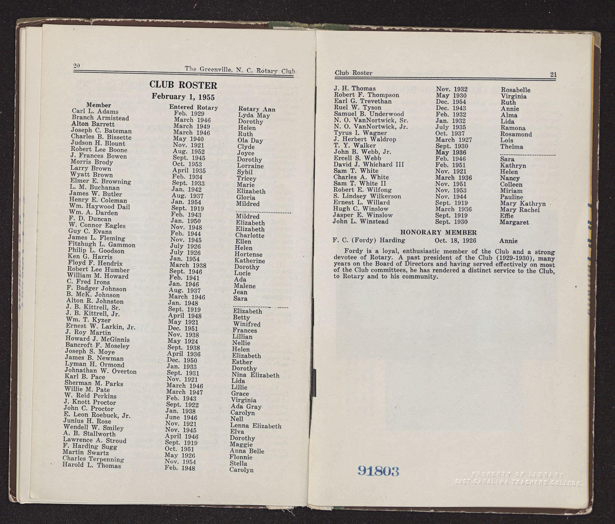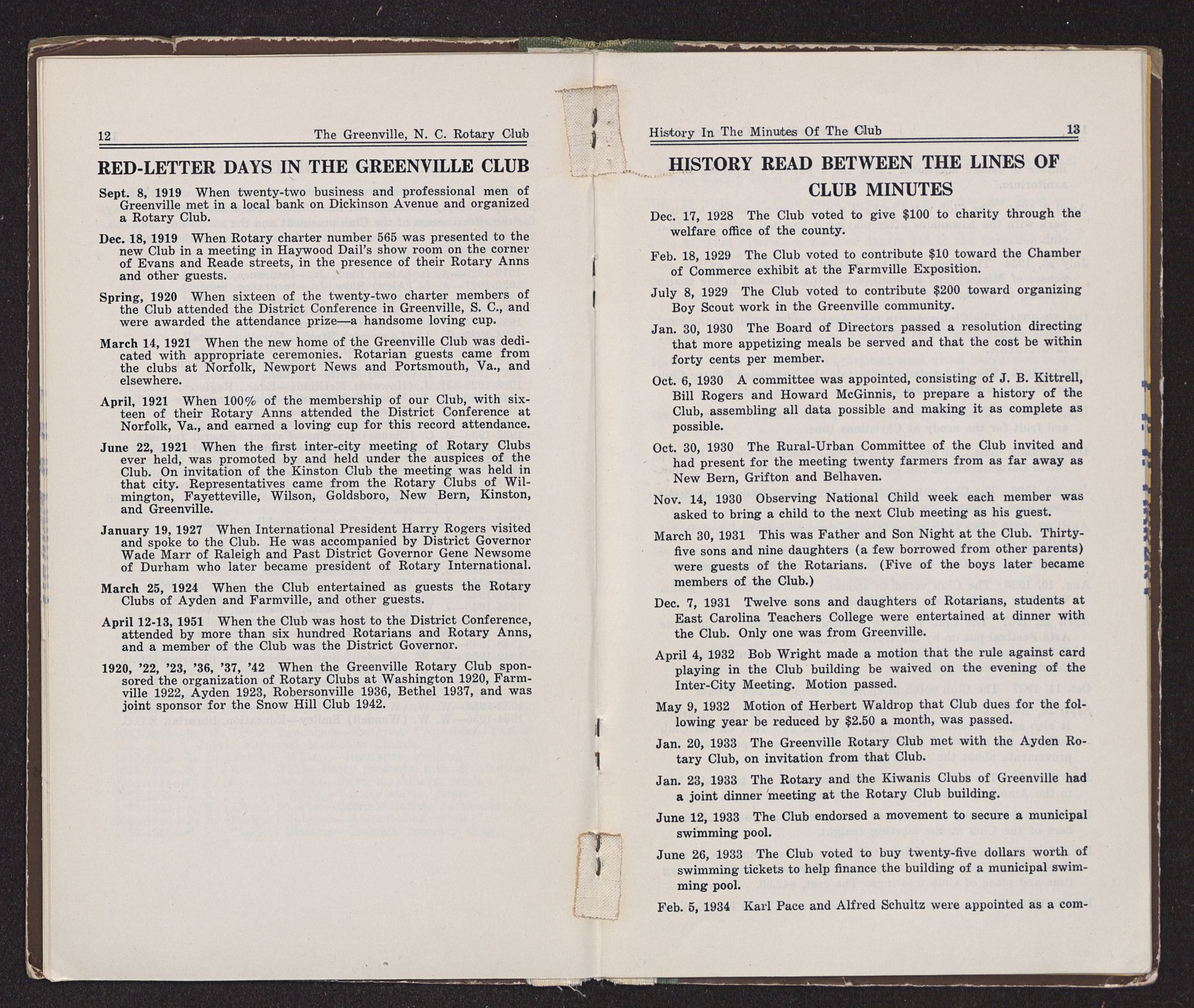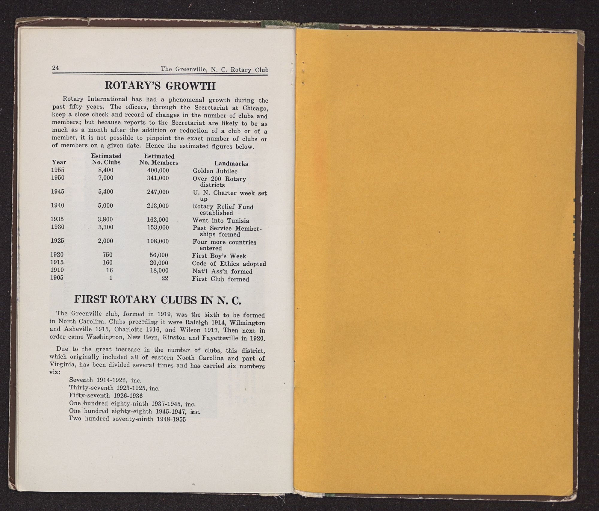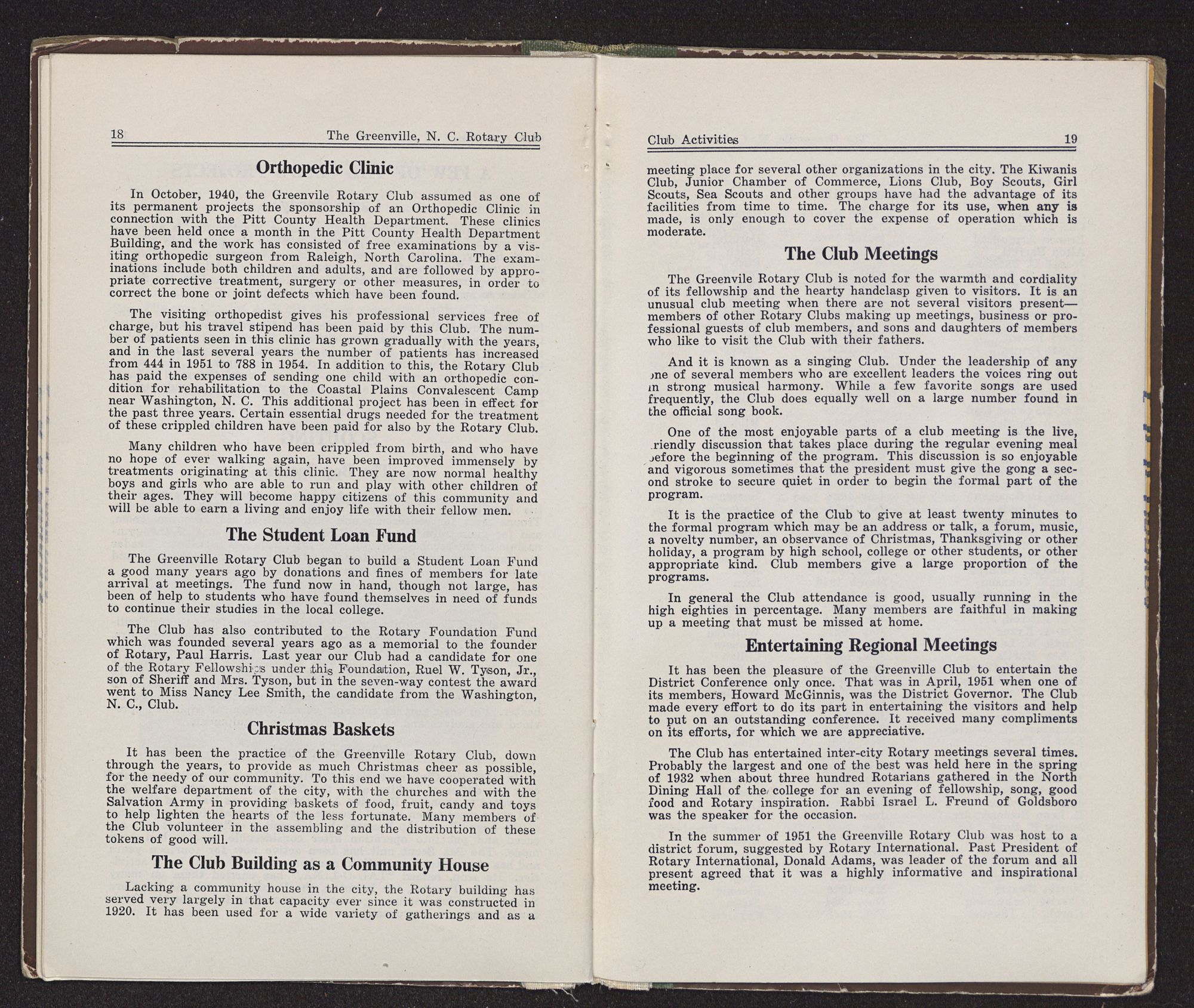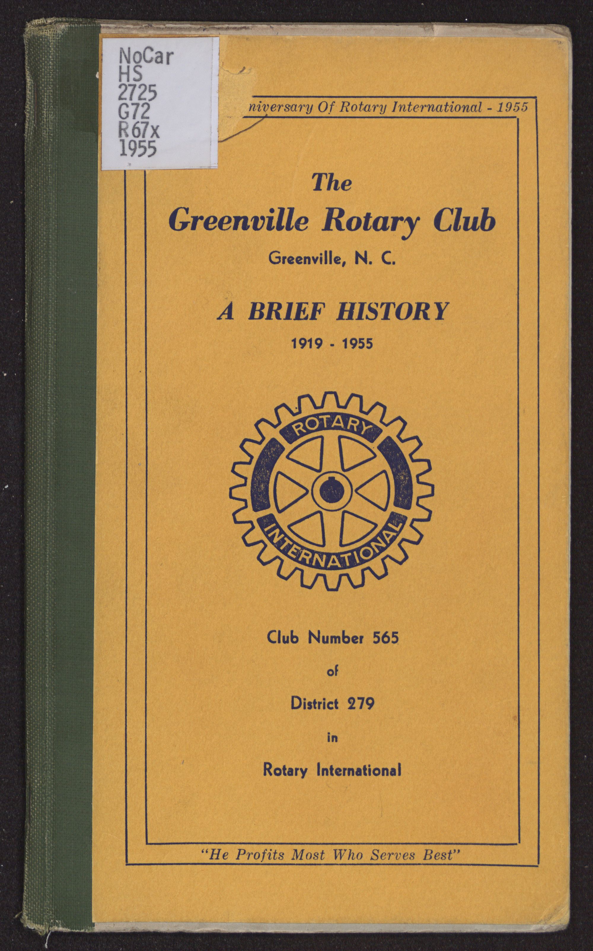 As a feature of the Golden Anniversary celebration clubs are encouraged to prepare or bring up to date their club histories and publish them in bulletin form in order to better acquaint members and the public with Rotary, and to preserve the history of the Club as a matter of record. Hence this brief story of the Greenville, North Carolina Rotary Club.