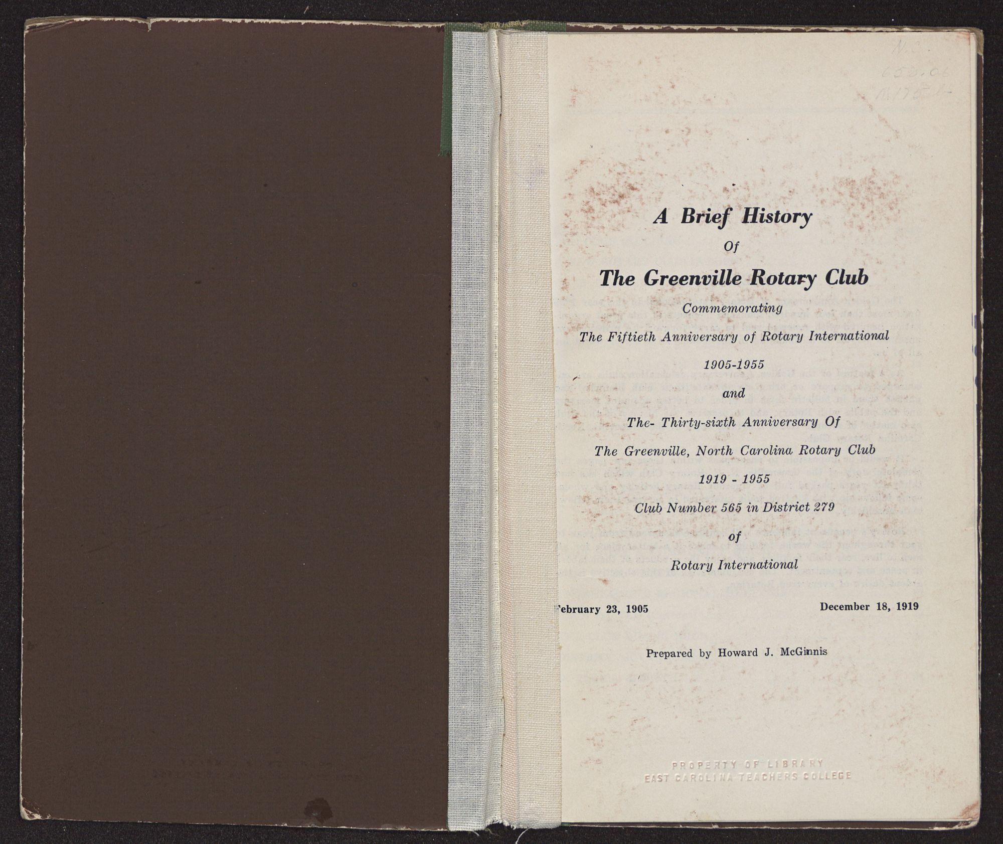 A Brief HistoryOfThe Greenville Rotary ClubCommemoratingThe Fiftieth Anniversary of Rotary International1905-1955andThe- Thirty-sixth Anniversary OfThe Greenville, North Carolina Rotary Club1919 - 1955Club Number 565 in District 279ofRotary International February 23, 1905 December 18, 1919 Prepared by Howard J. McGinnis
