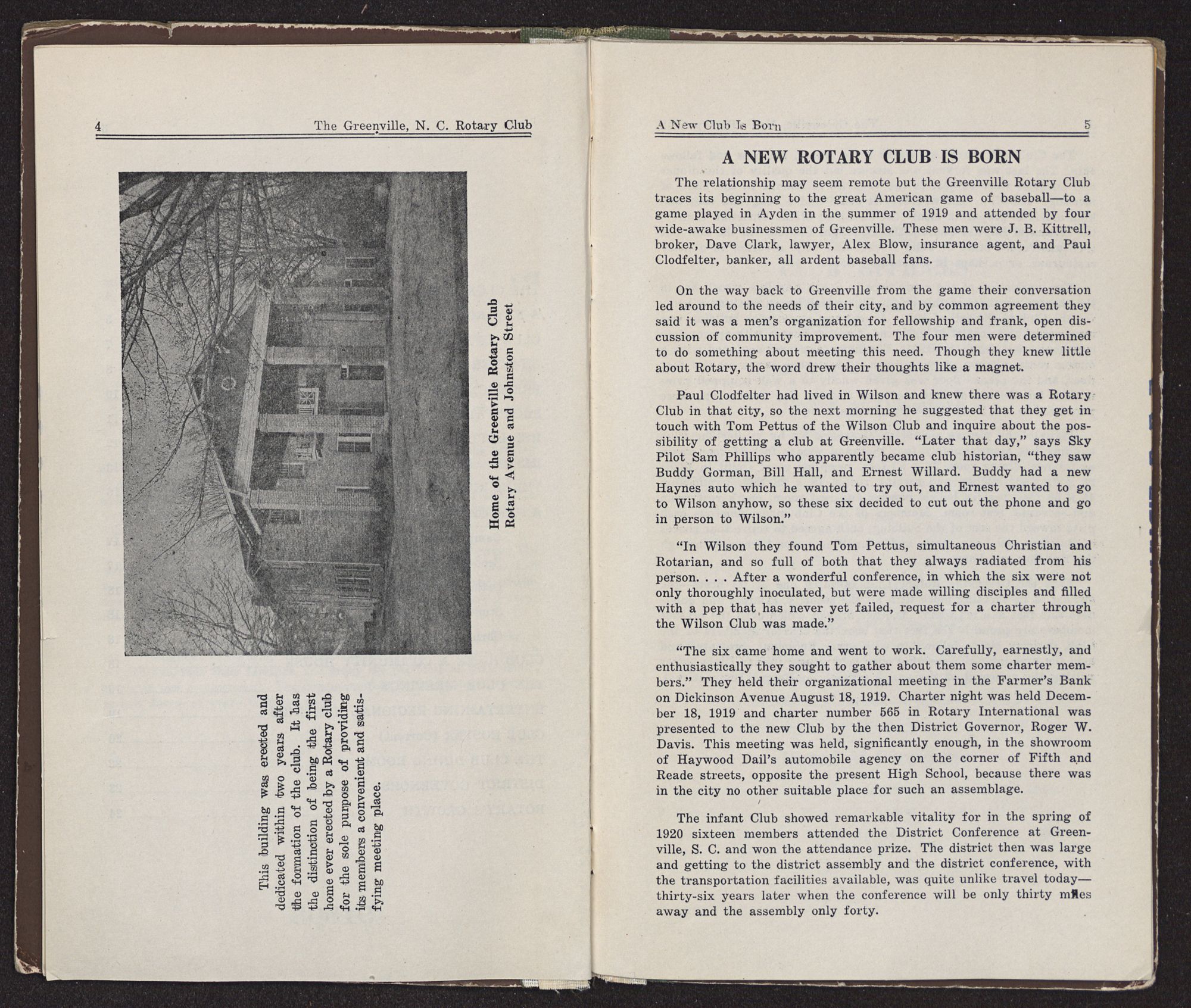 The relationship may seem remote but the Greenville Rotary Club traces its beginning to the great American game of baseball—to a game played in Ayden in the summer of 1919 and attended by four wide-awake businessmen of Greenville. These men were J. B. Kittrell, broker, Dave Clark, lawyer, Alex Blow, insurance agent, and Paul Clodfelter, banker, all ardent baseball fans.