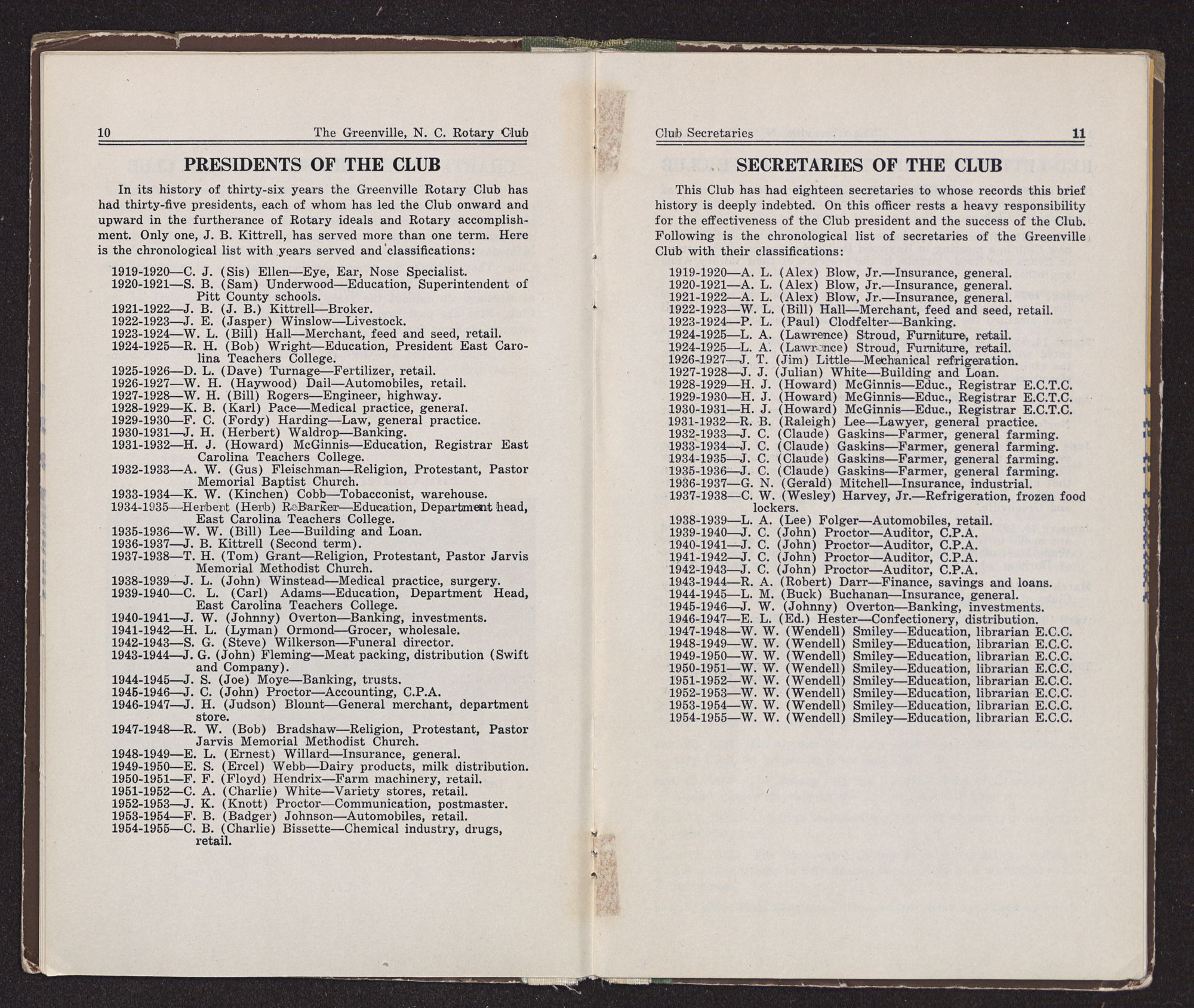 In its history of thirty-six years the Greenville Rotary Club has had thirty-five presidents, each of whom has led the Club onward and upward in the furtherance of Rotary ideals and Rotary accomplishment. Only one, J. B. Kittrell, has served more than one term. Here is the chronological list with years served and classifications: