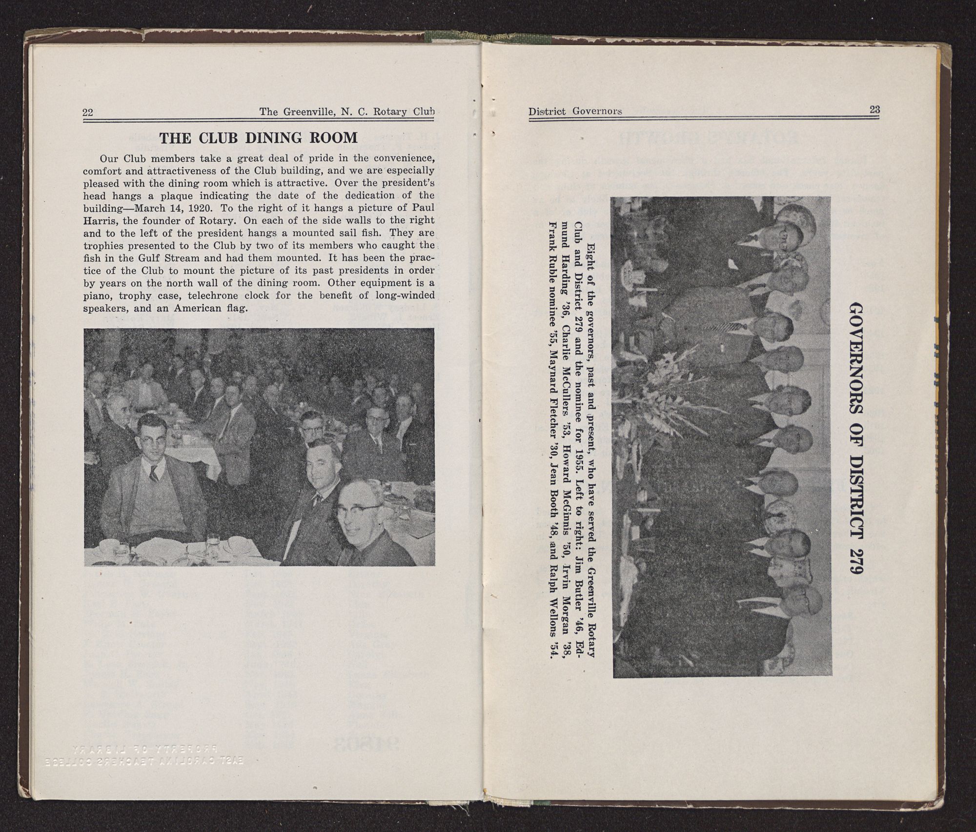 Our Club members take a great deal of pride in the convenience, comfort and attractiveness of the Club building, and we are especially pleased with the dining room which is attractive. Over the president's head hangs a plaque indicating the date of the dedication of the building—March 14, 1920. To the right of it hangs a picture of Paul Harris, the founder of Rotary. On each of the side walls to the right and to the left of the president hangs a mounted sail fish. They are trophies presented to the Club by two of its members who caught the fish in the Gulf Stream and had them mounted. It has been the practice of the Club to mount the picture of its past presidents in order by years on the north wall of the dining room. Other equipment is a piano, trophy case, telechrone clock for the benefit of long-winded speakers, and an American flag.