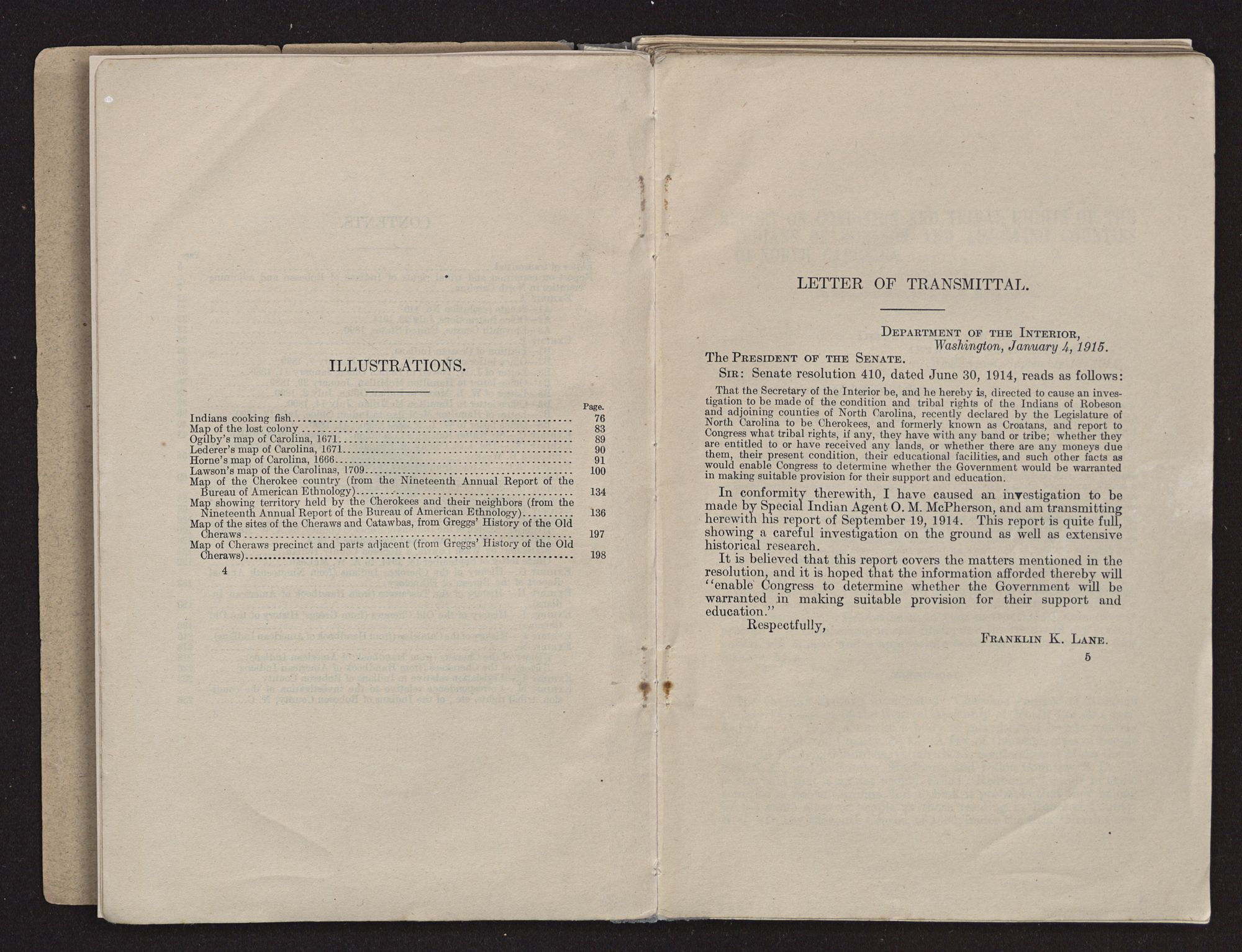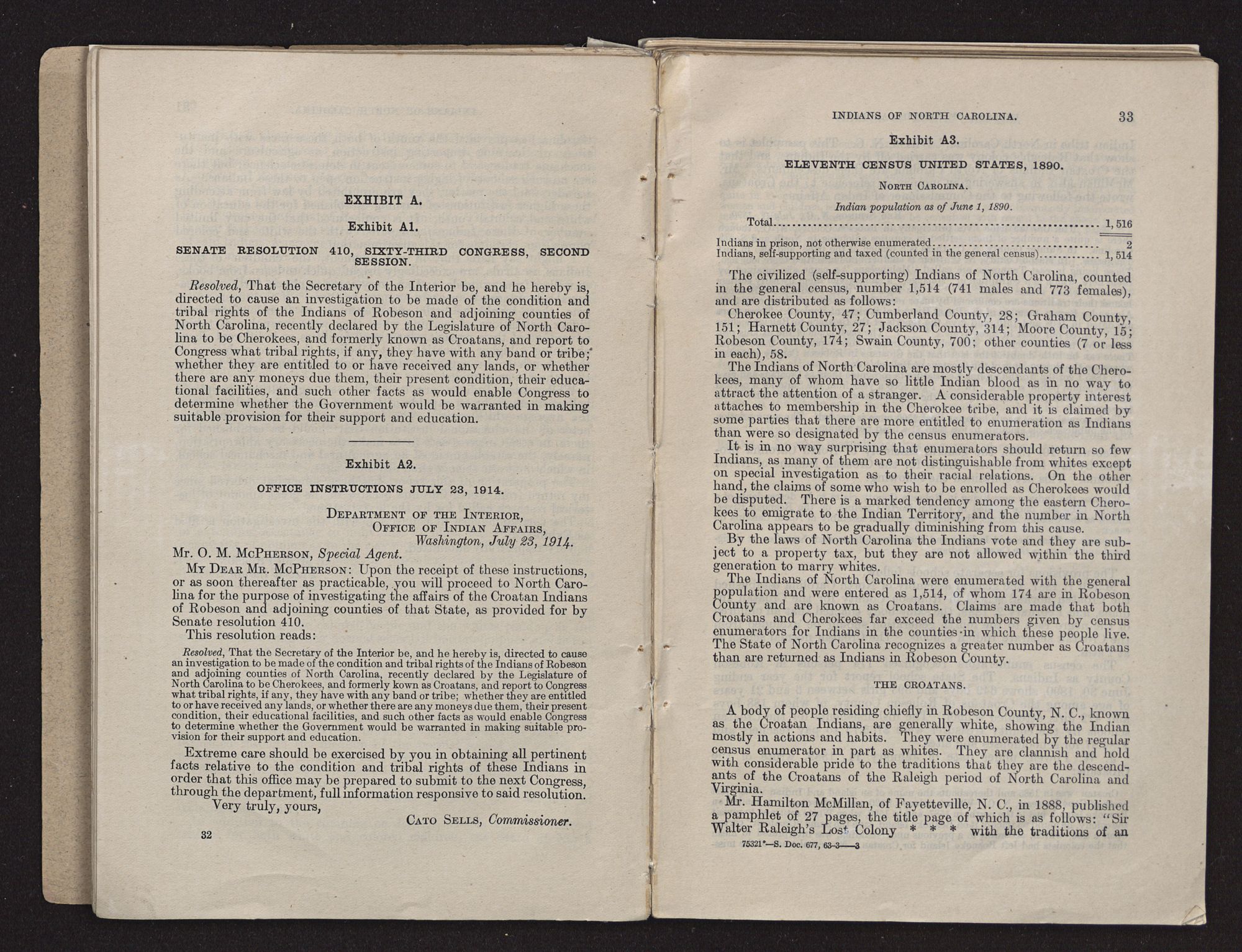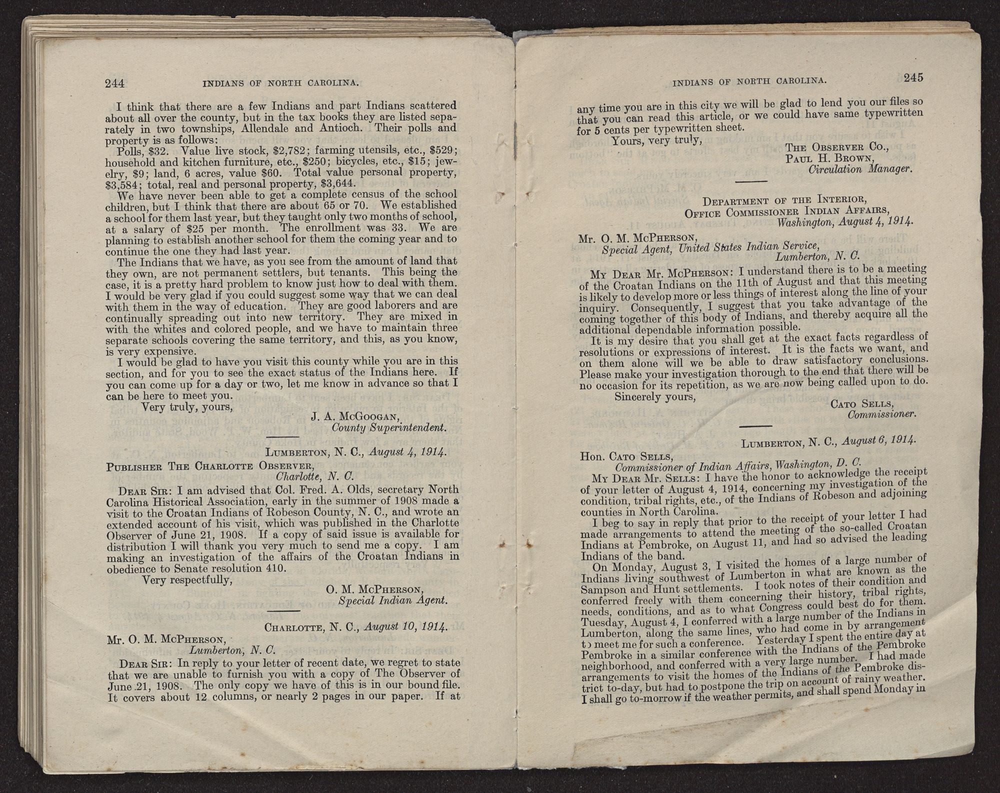 MY DEAR MR. SELLS: On June 30, 1914, the Senate passed a resolution (S. Res. 410) authorizing and directing the Secretary of the Interior to cause an investigation to be made of the condition and tribal rights of the Indians of Robeson and adjoining counties in North Carolina. Said resolution reads as follows: