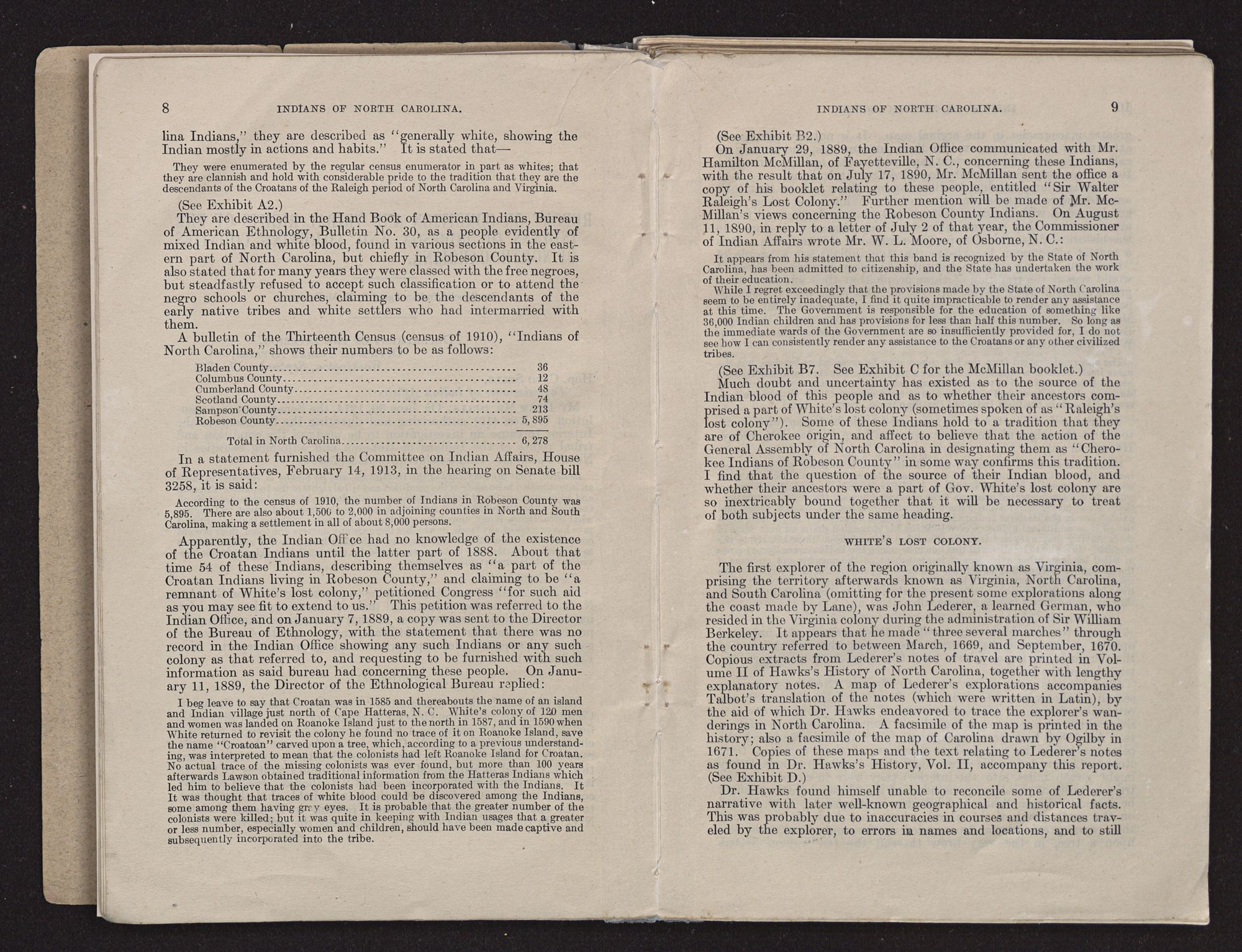 Apparently, the Indian Office had no knowledge of the existence of the Croatan Indians until the latter part of 1888. About that time 54 of these Indians, describing themselves as “a part of the Croatan Indians living in Robeson County,” and claiming to be “a remnant of White's lost colony,” petitioned Congress “for such aid as you may see fit to extend to us.” This petition was referred to the Indian Office, and on January 7, 1889, a copy was sent to the Director of the Bureau of Ethnology, with the statement that there was no record in the Indian Office showing any such Indians or any such colony as that referred to, and requesting to be furnished with such information as said bureau had concerning these people. On January 11, 1889, the Director of the Ethnological Bureau replied: