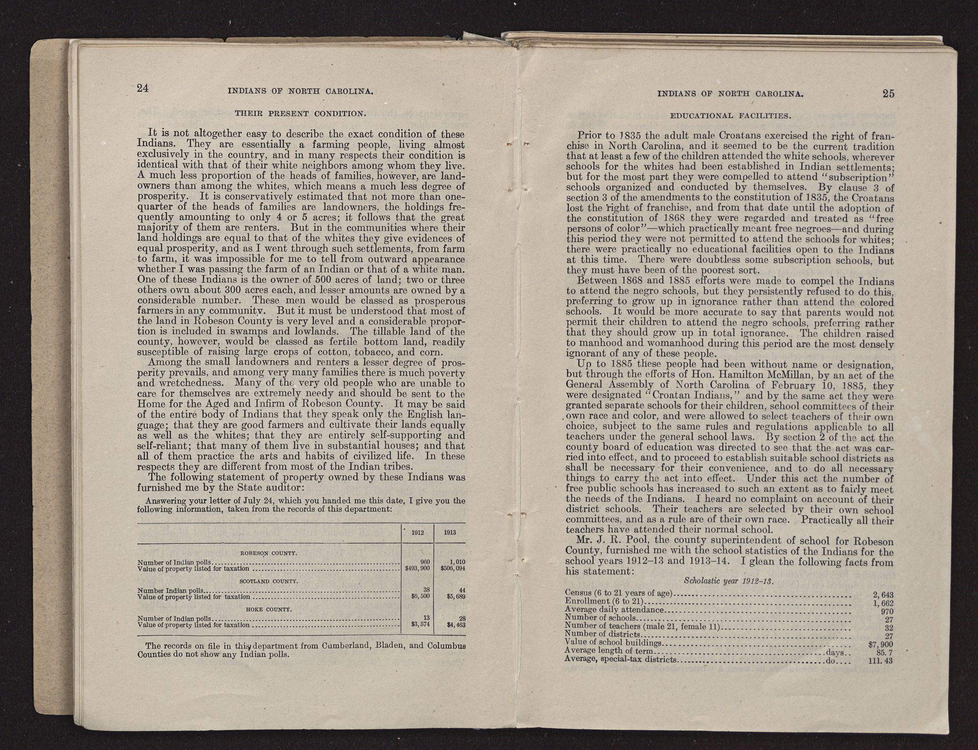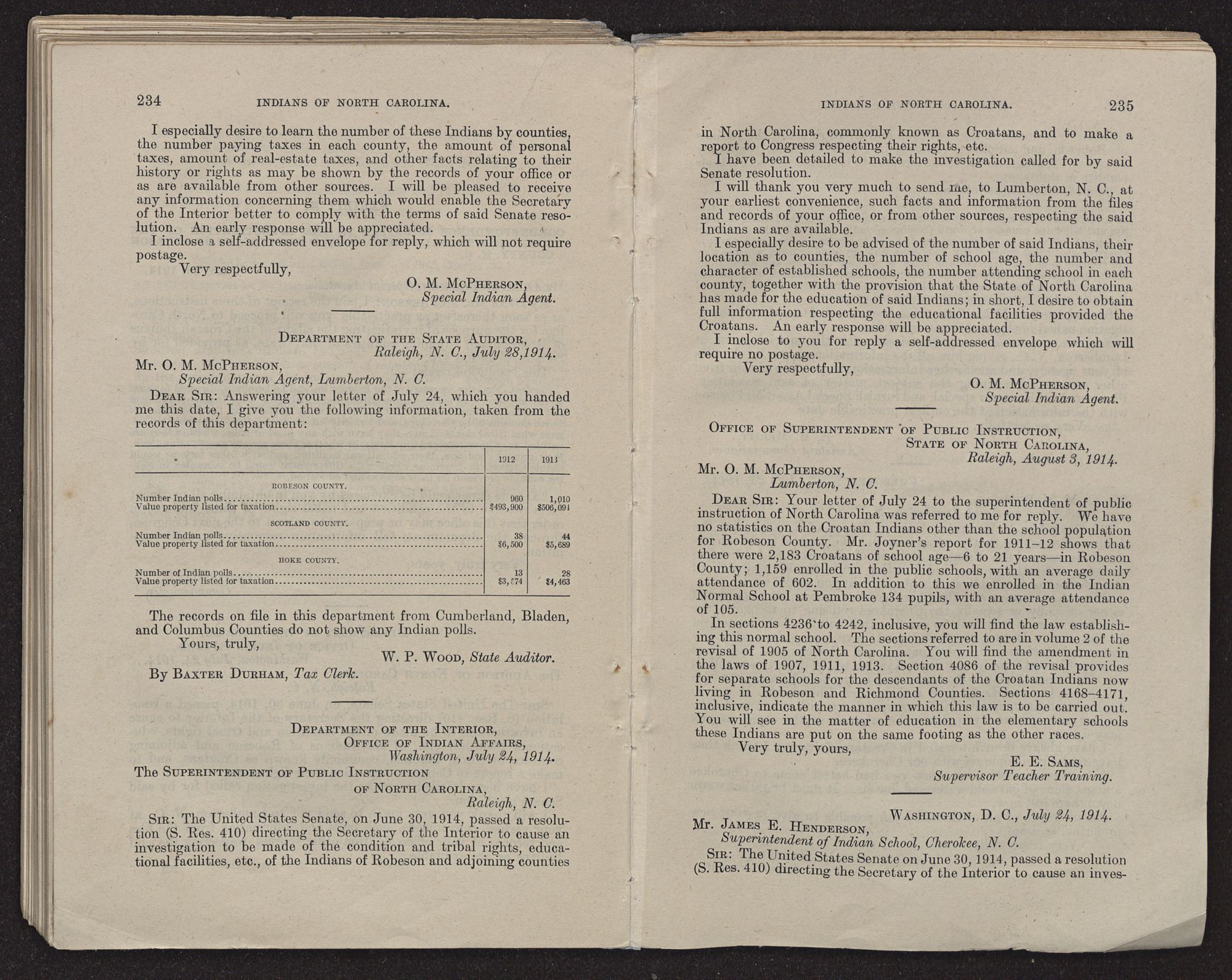 DEAR SIR: If you have not already done so, I will thank you very much to send me by return mail the school statistics of the so-called Croatan Indians of Robeson County for the school years 1912 and 1913.