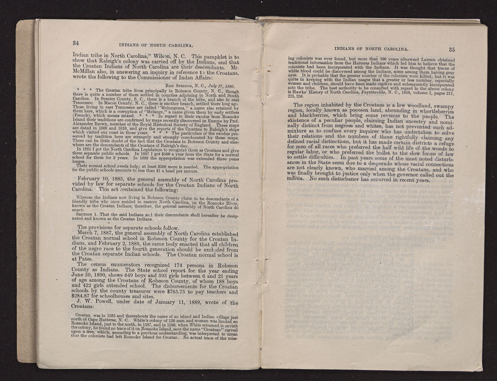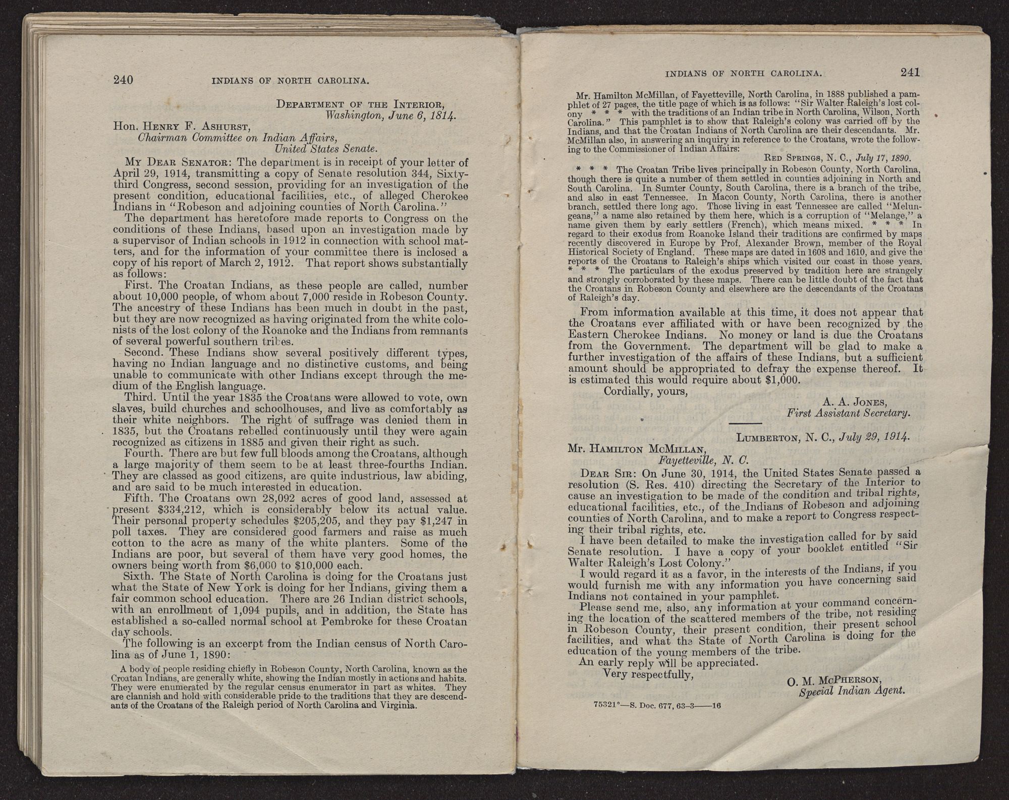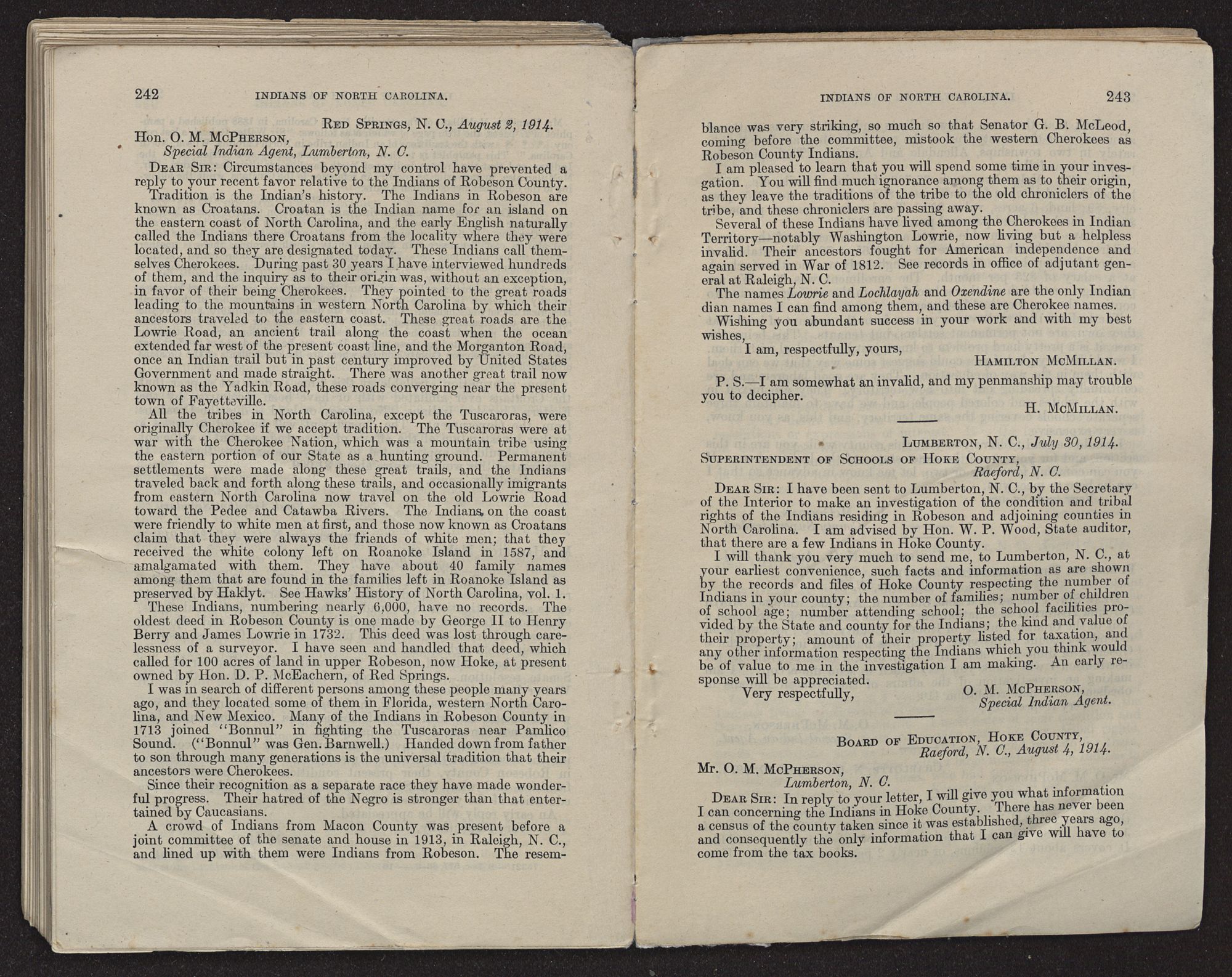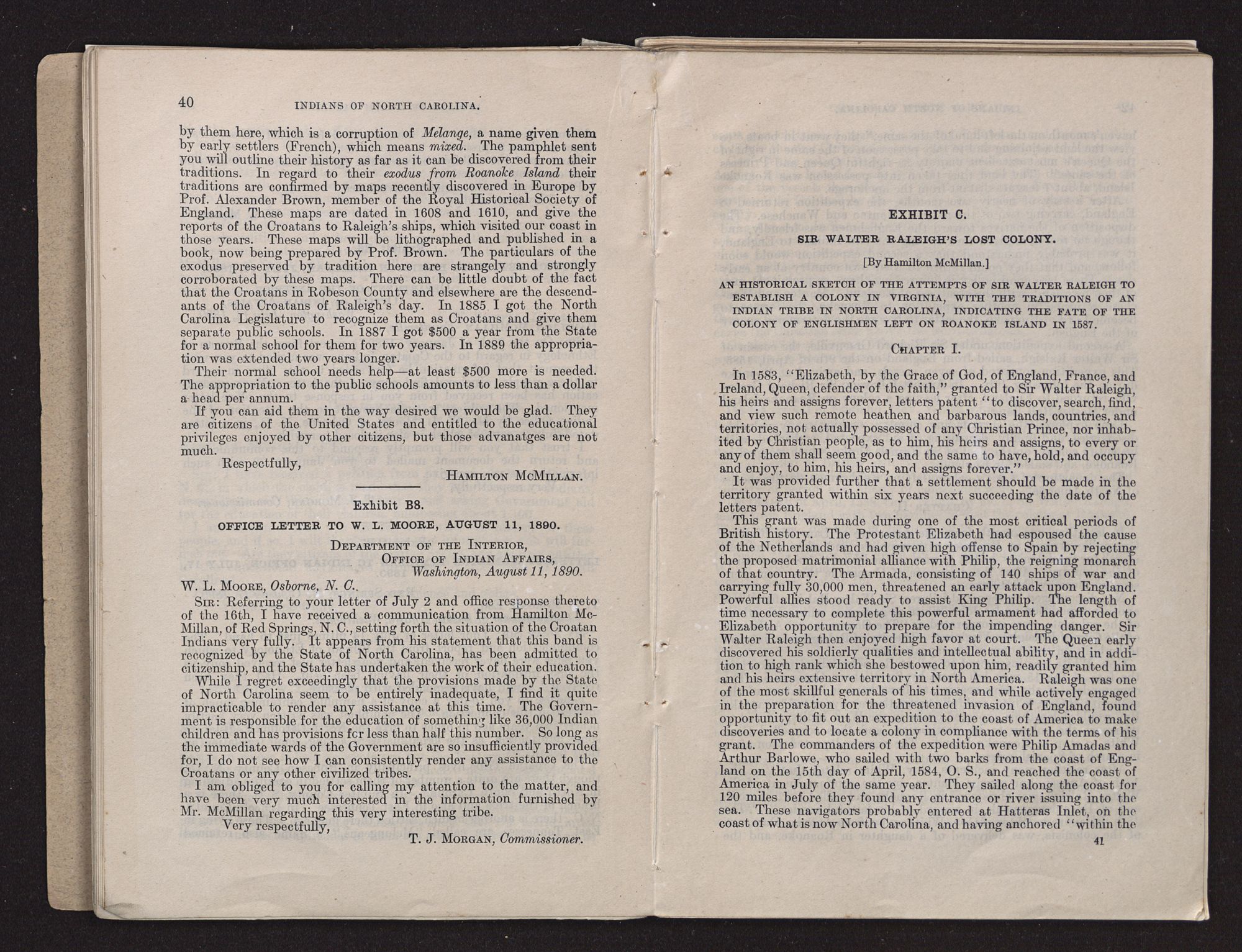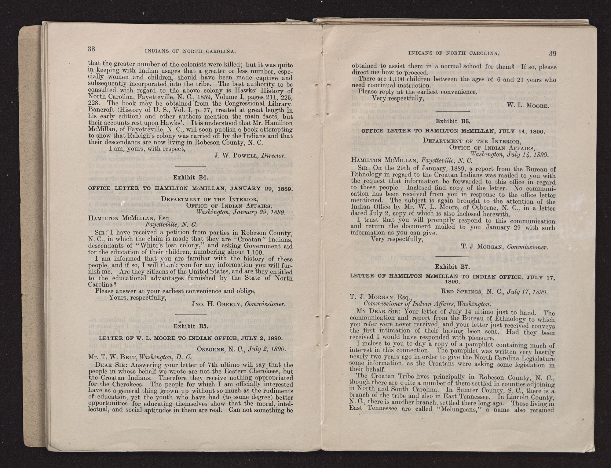 On January 29, 1889, the Indian Office communicated with Mr. Hamilton McMillan, of Fayetteville, N. C., concerning these Indians, with the result that on July 17, 1890, Mr. McMillan sent the office a copy of his booklet relating to these people, entitled “Sir Walter Raleigh's Lost Colony.” Further mention will be made of Mr. McMillan's views concerning the Robeson County Indians. On August 11, 1890, in reply to a letter of July 2 of that year, the Commissioner of Indian Affairs wrote Mr. W. L. Moore, of Osborne, N. C.: