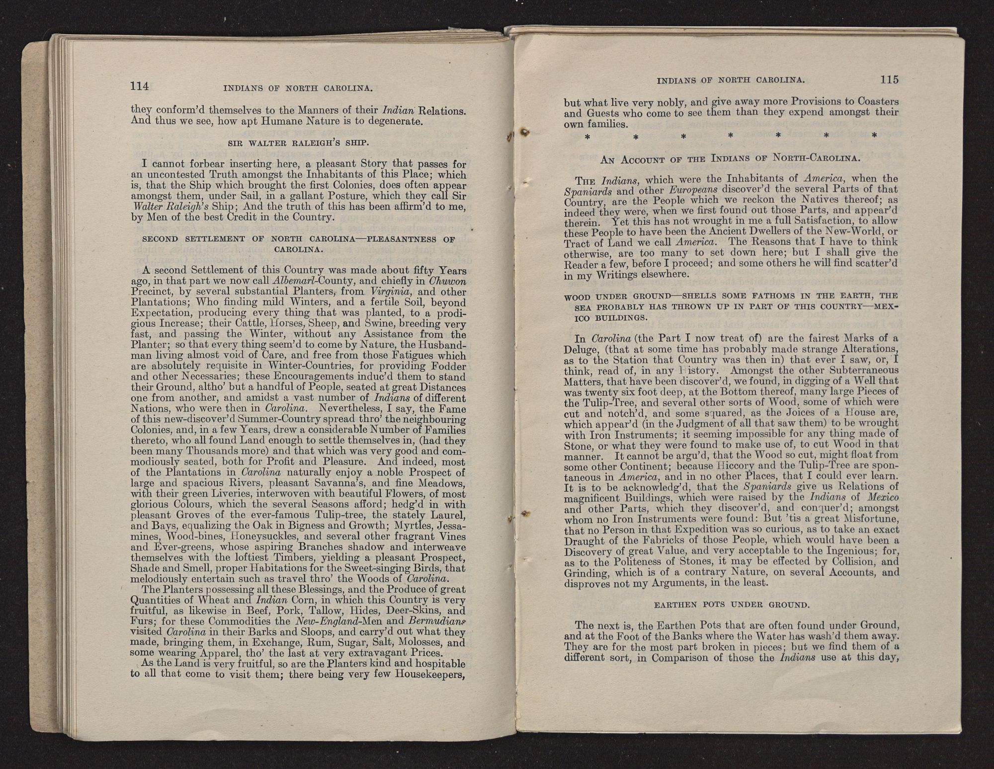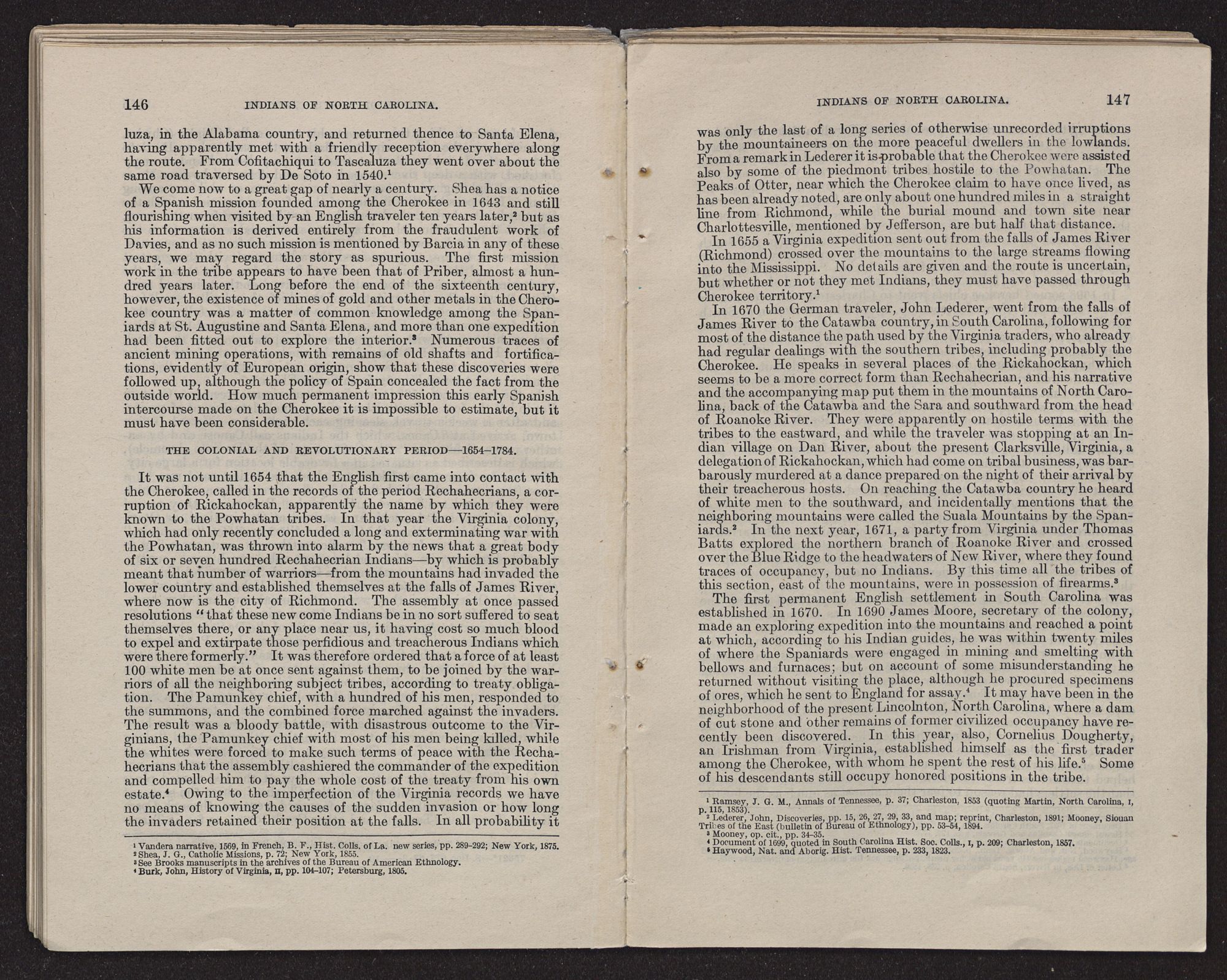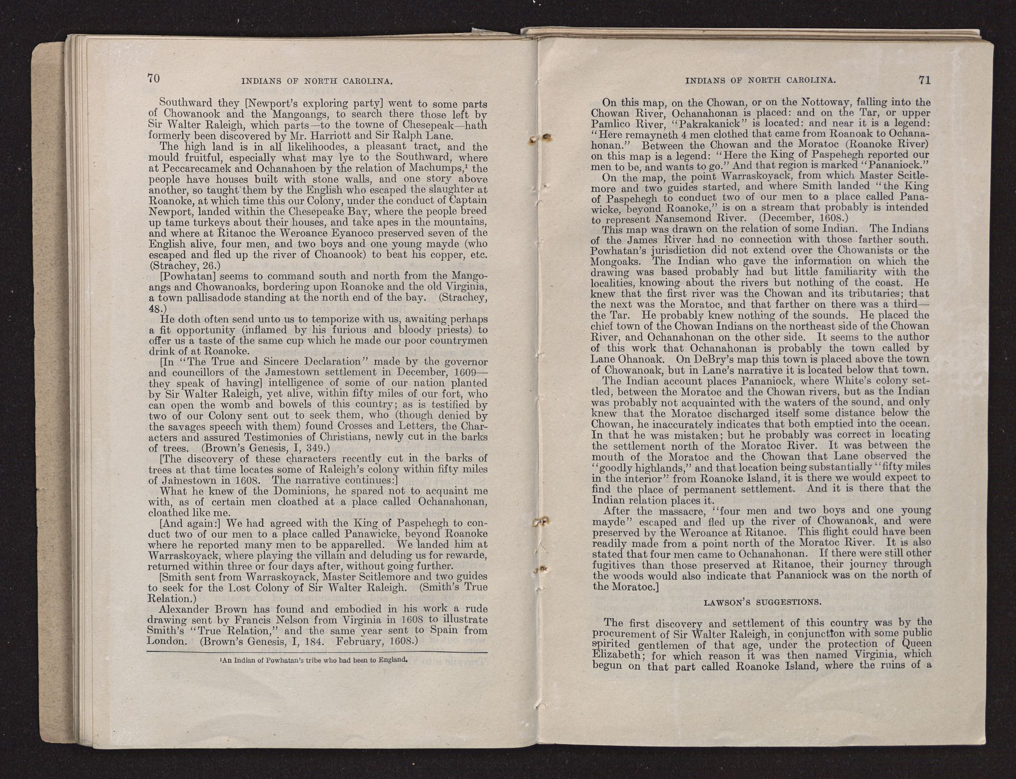 WHITE'S LOST COLONY.The first explorer of the region originally known as Virginia, comprising the territory afterwards known as Virginia, North Carolina, and South Carolina (omitting for the present some explorations along the coast made by Lane), was John Lederer, a learned German, who resided in the Virginia colony during the administration of Sir William Berkeley. It appears that he made “three several marches” through the country referred to between March, 1669, and September, 1670. Copious extracts from Lederer's notes of travel are printed in Volume II of Hawks's History of North Carolina, together with lengthy explanatory notes. A map of Lederer's explorations accompanies Talbot's translation of the notes (which were written in Latin), by the aid of which Dr. Hawks endeavored to trace the explorer's wanderings in North Carolina. A facsimile of the map is printed in the history; also a facsimile of the map of Carolina drawn by Ogilby in 1671. Copies of these maps and the text relating to Lederer's notes as found in Dr. Hawks's History, Vol. II, accompany this report. (See Exhibit D.)