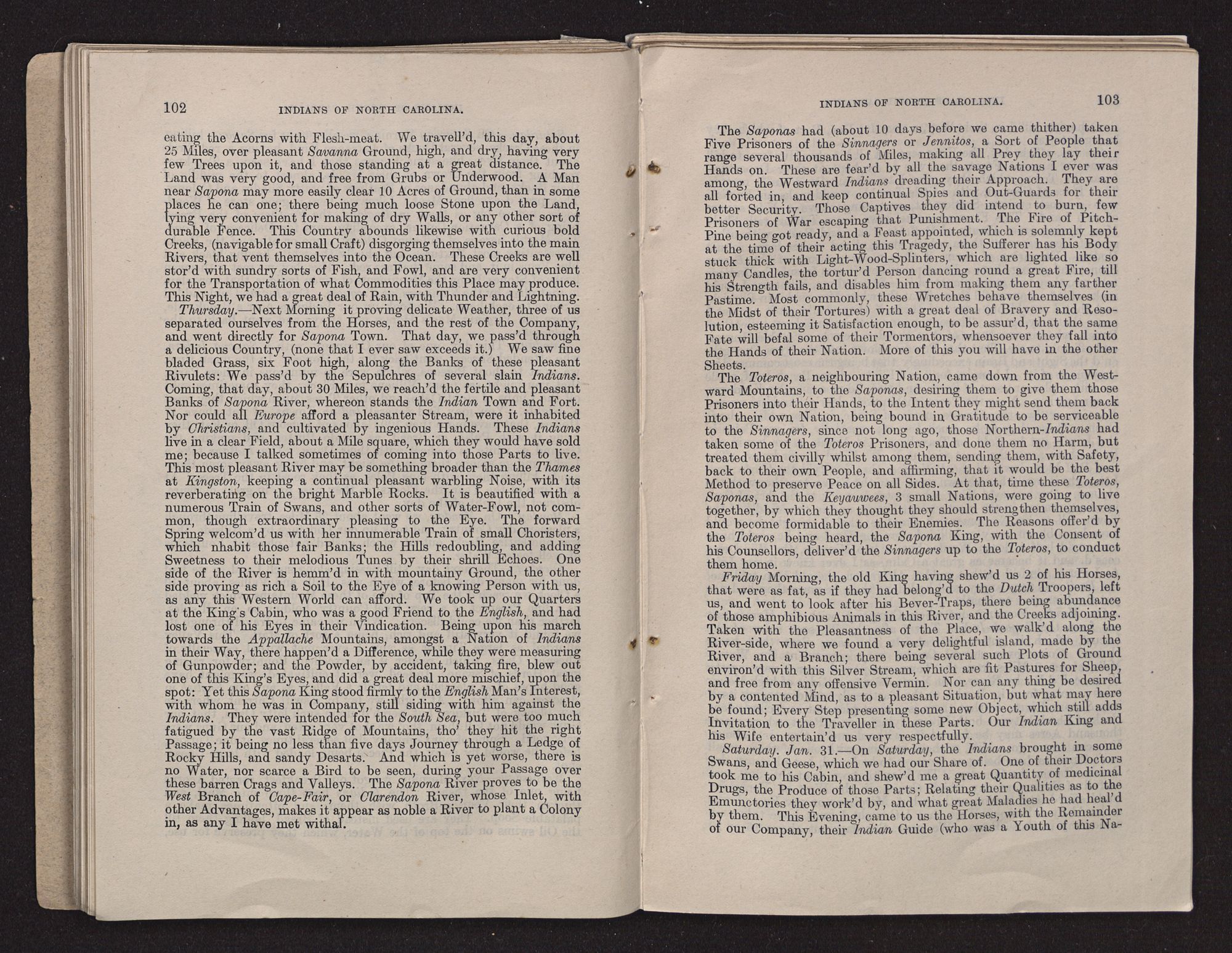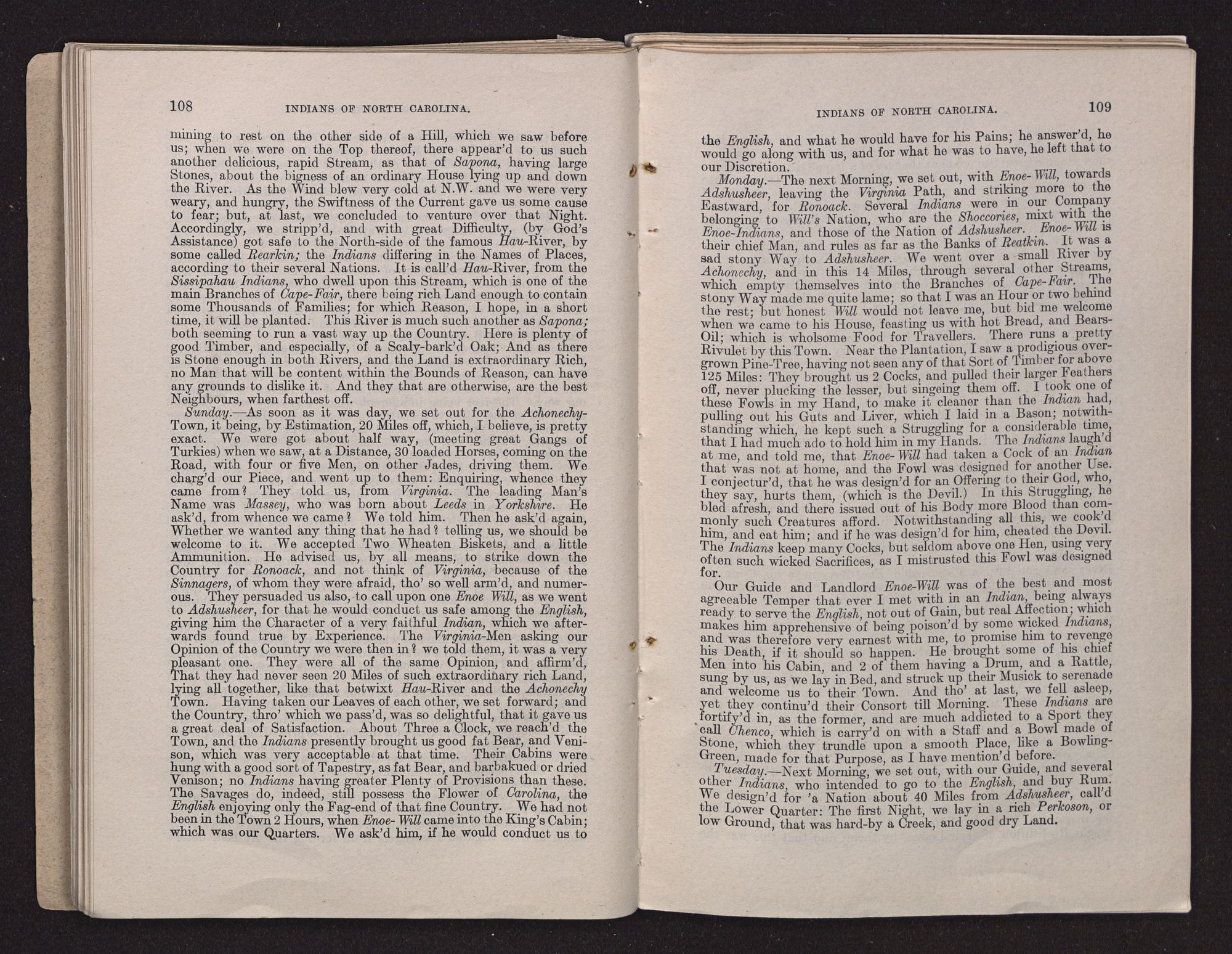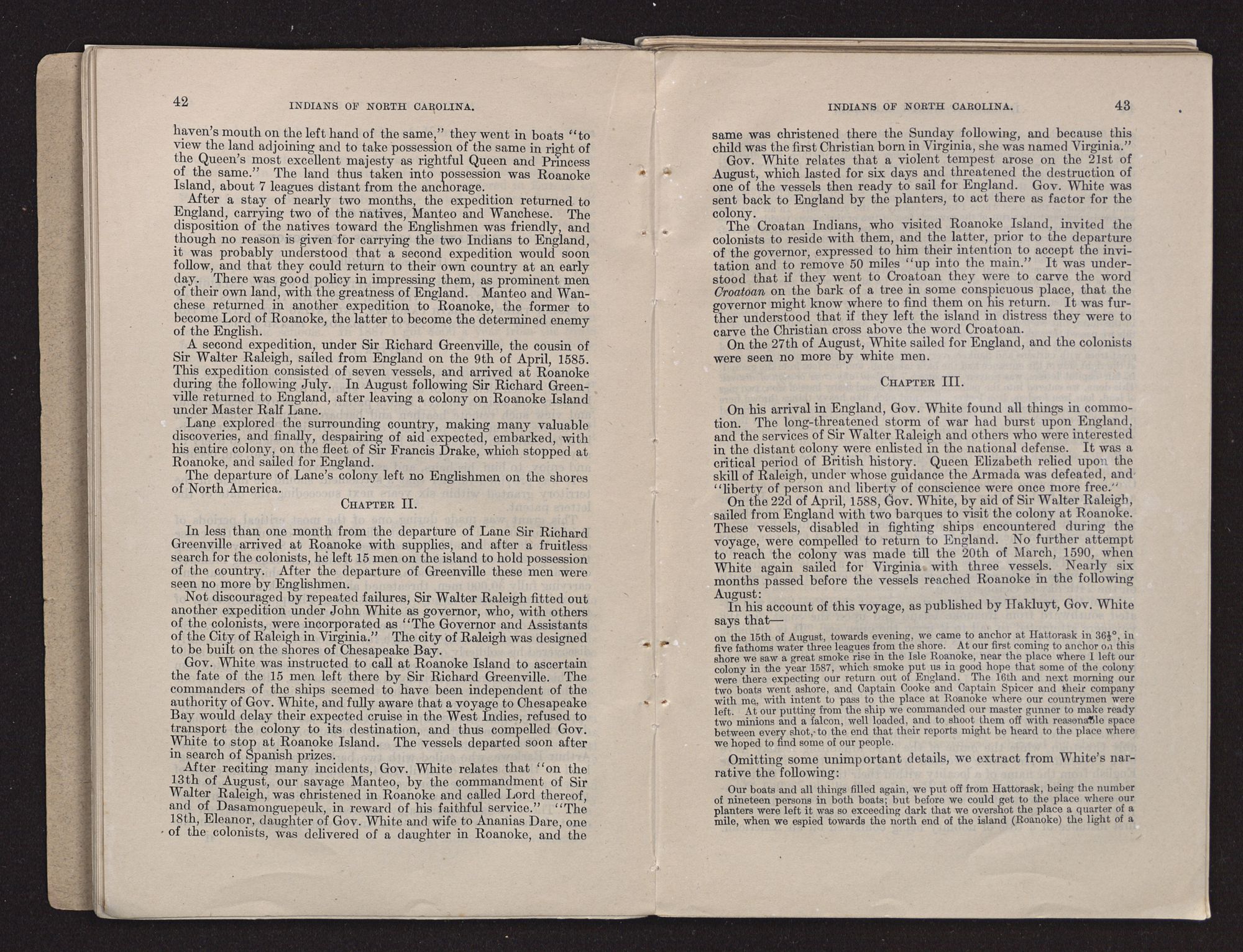 WHITE'S LOST COLONY.The first explorer of the region originally known as Virginia, comprising the territory afterwards known as Virginia, North Carolina, and South Carolina (omitting for the present some explorations along the coast made by Lane), was John Lederer, a learned German, who resided in the Virginia colony during the administration of Sir William Berkeley. It appears that he made “three several marches” through the country referred to between March, 1669, and September, 1670. Copious extracts from Lederer's notes of travel are printed in Volume II of Hawks's History of North Carolina, together with lengthy explanatory notes. A map of Lederer's explorations accompanies Talbot's translation of the notes (which were written in Latin), by the aid of which Dr. Hawks endeavored to trace the explorer's wanderings in North Carolina. A facsimile of the map is printed in the history; also a facsimile of the map of Carolina drawn by Ogilby in 1671. Copies of these maps and the text relating to Lederer's notes as found in Dr. Hawks's History, Vol. II, accompany this report. (See Exhibit D.)