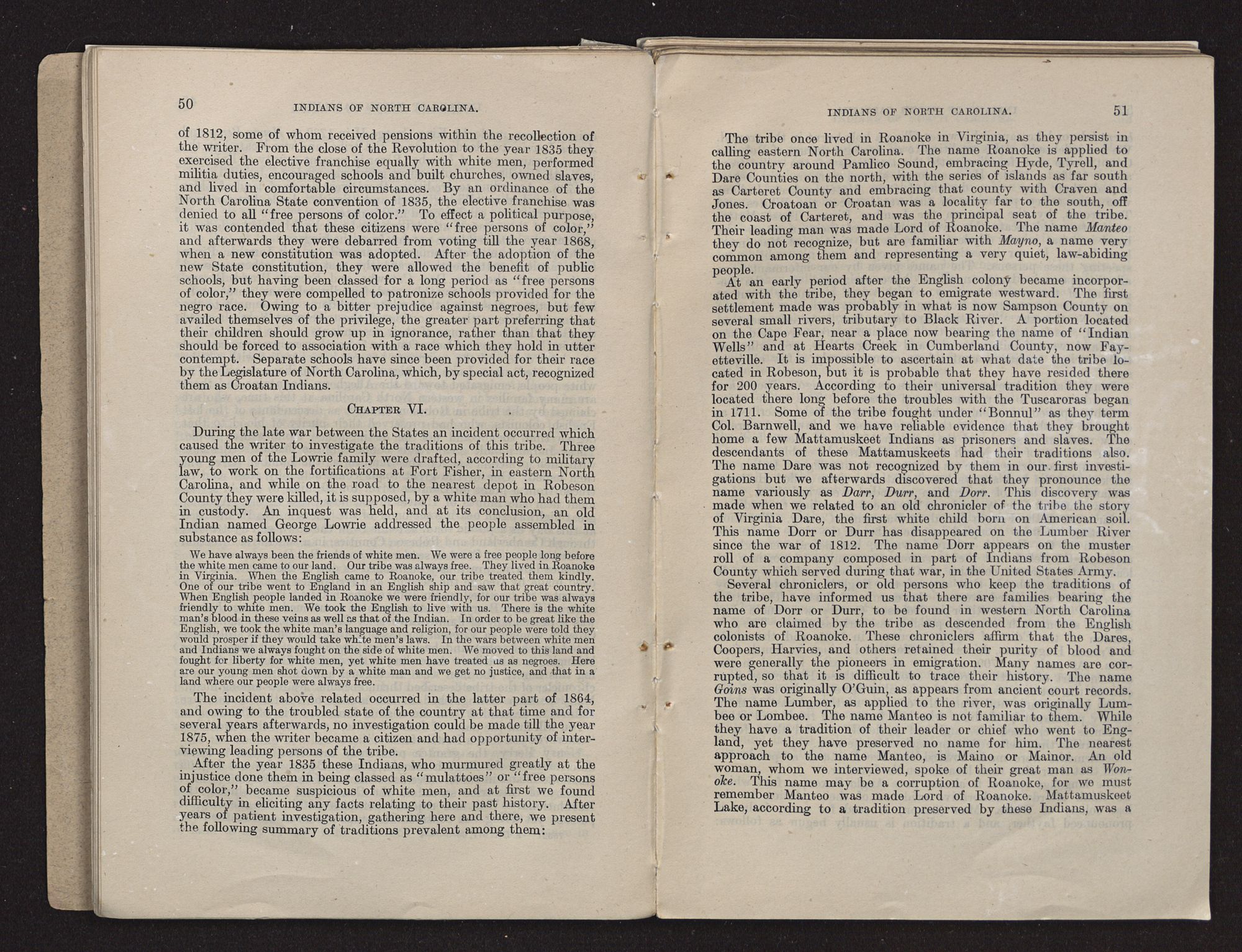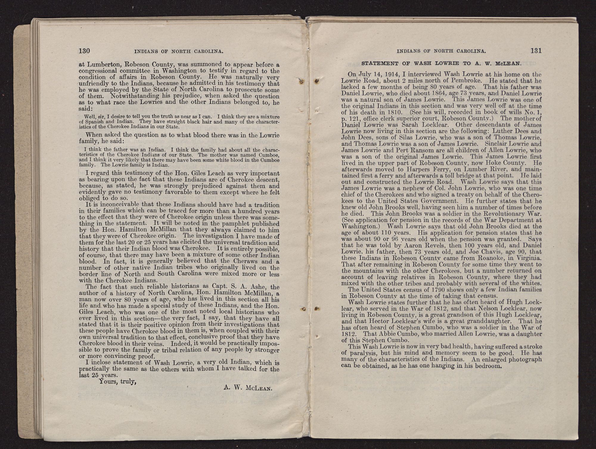 | Statement by Wash Lowrie, a Robeson County Indian | 131 |