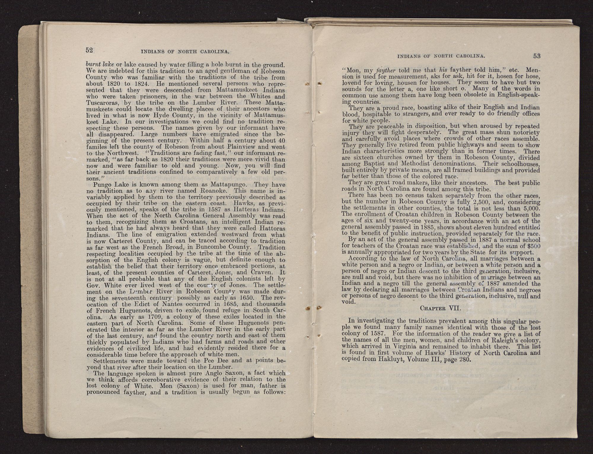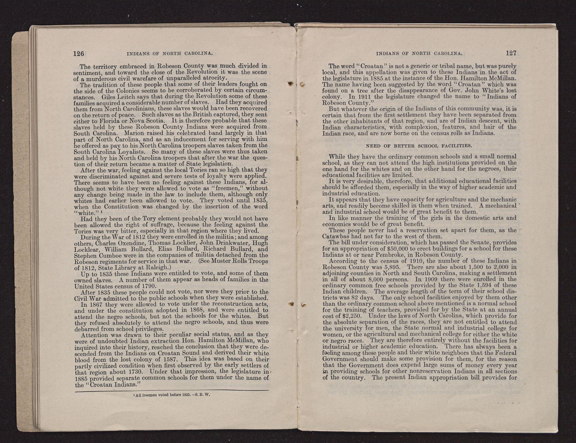 HISTORICAL.The Croatan Indians (designated “Cherokee Indians of Robeson County” by an act of the General Assembly of North Carolina ratified Mar. 11, 1913) comprise a body of mixed-blood people residing chiefly in Robeson County, N. C. A few of the same class of people reside in Bladen, Columbus, Cumberland, Scotland, and Hoke Counties, N. C., and in Sumter, Marlboro, and Dillon Counties, S. C. It is also said that a similar people, called “Redbones,” reside in these counties in South Carolina, but I think it probable that they belong to the same class of people as those residing in Robeson County, N. C. In the Eleventh Census, of 1890, under the title “North Carolina