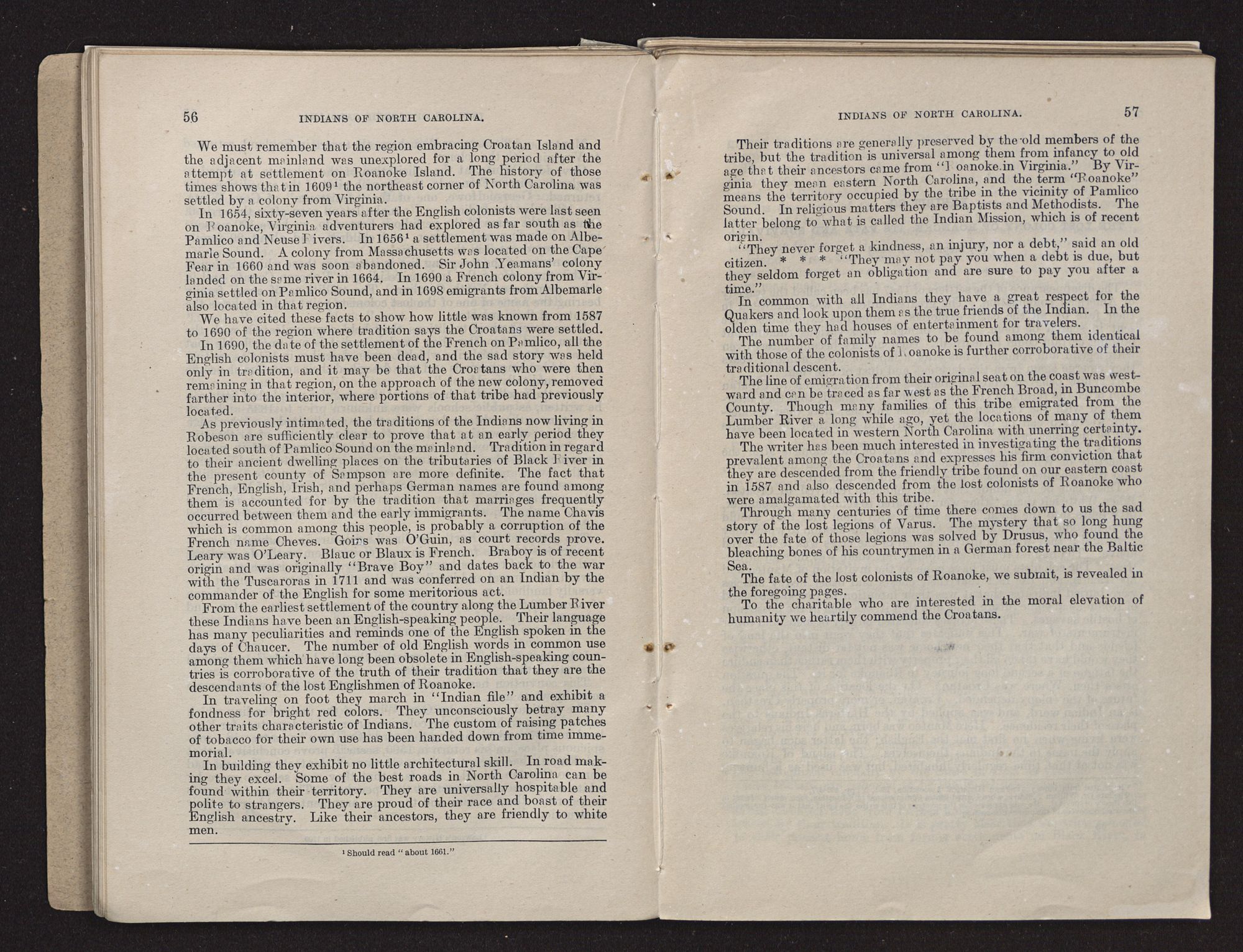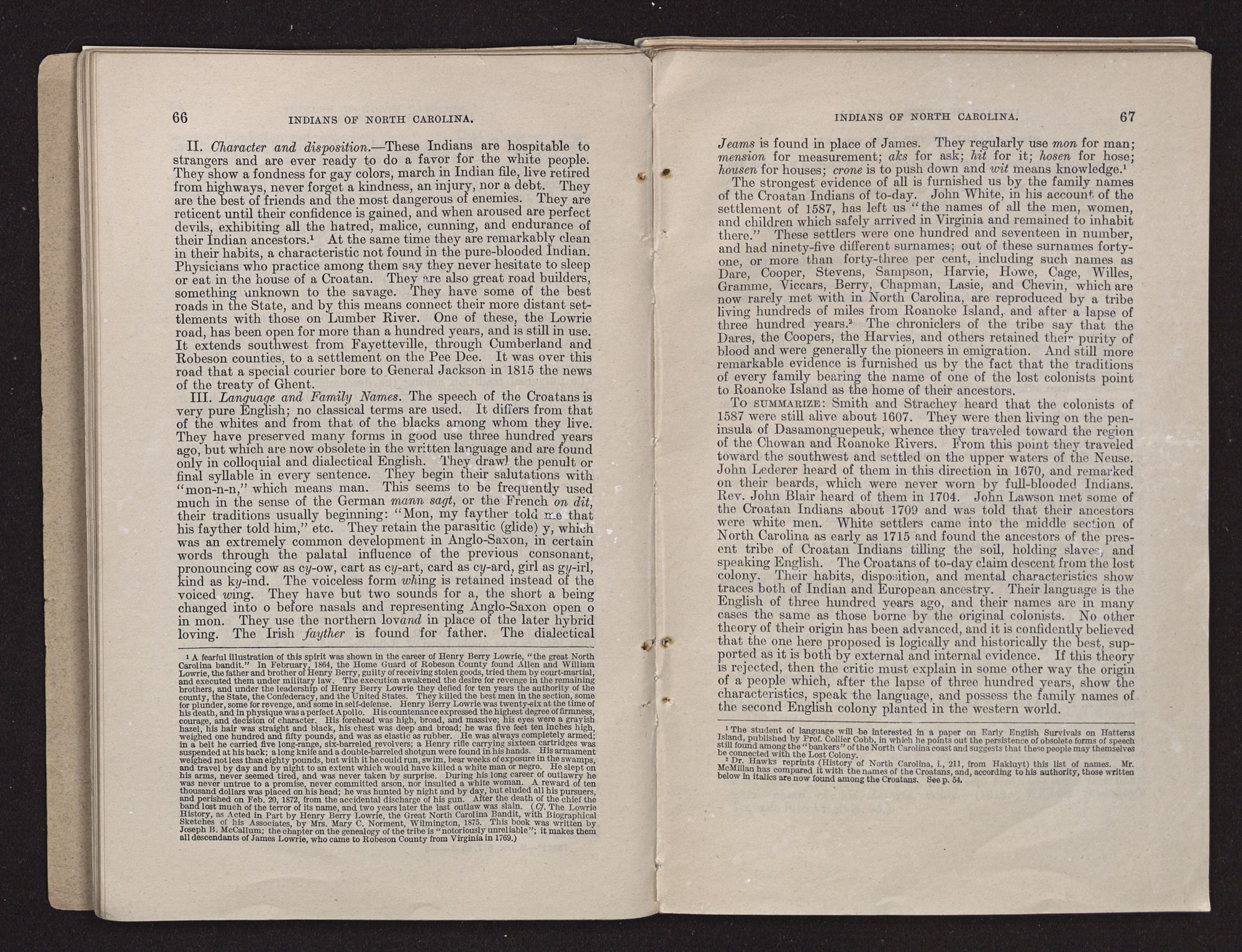They were enumerated by the regular census enumerator in part as whites; that they are clannish and hold with considerable pride to the tradition that they are the descendants of the Croatans of the Raleigh period of North Carolina and Virginia.