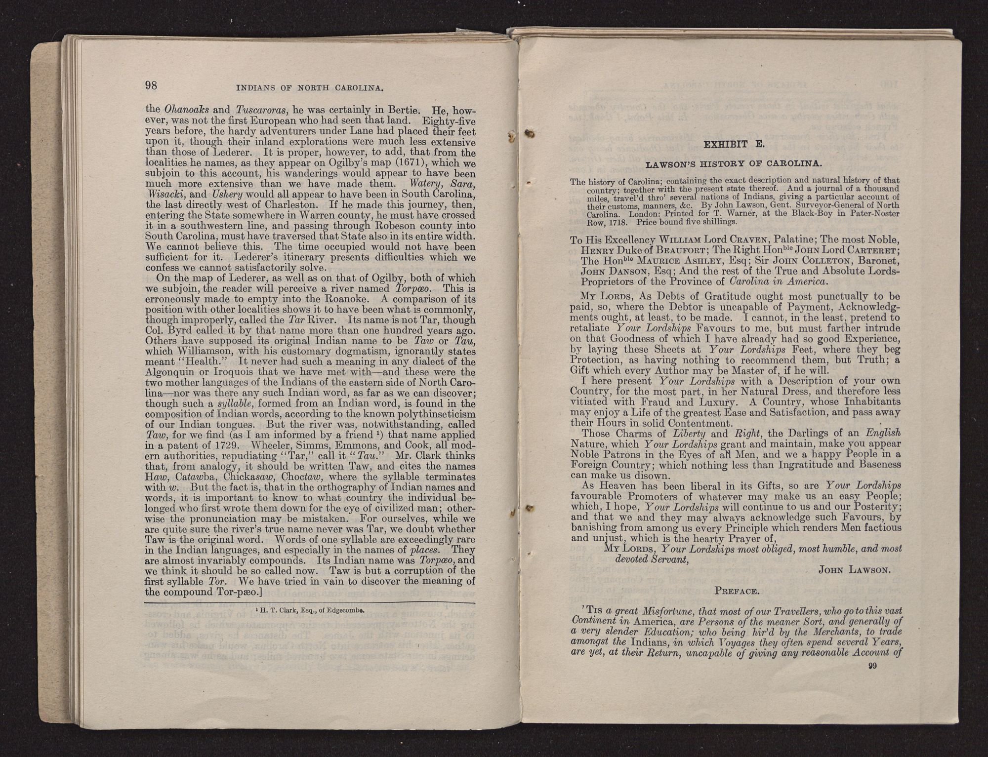 | EXHIBIT E.—Lawson's History of Carolina | 99 |