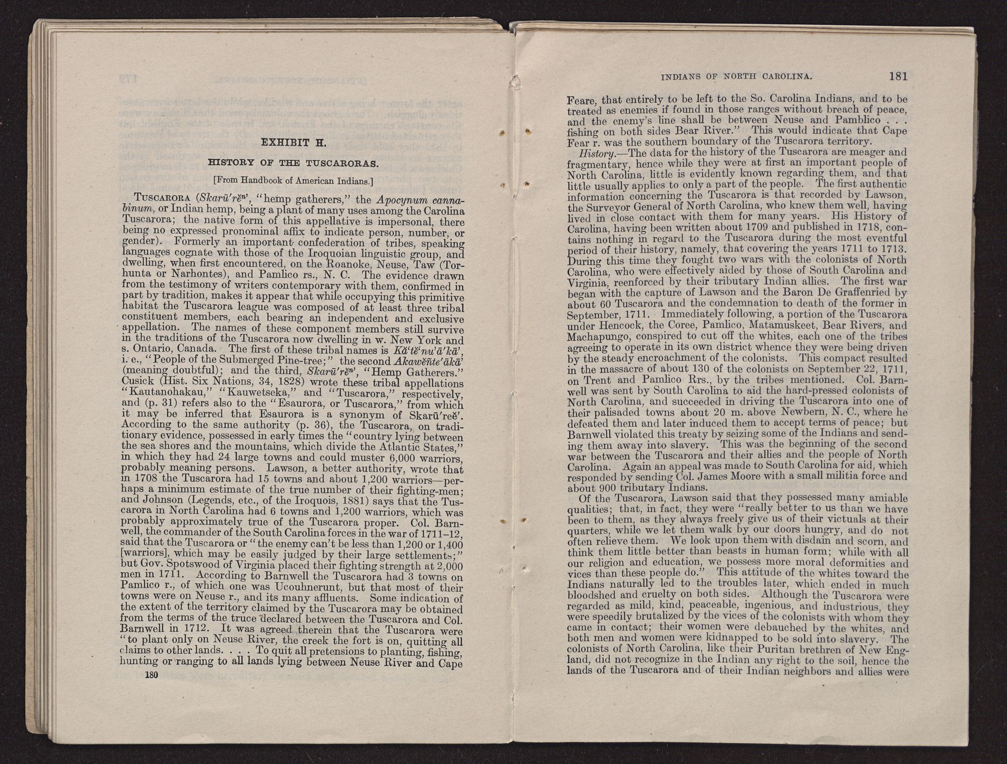 | EXHIBIT H.—History of the Tuscaroras (from Handbook of American Indians) | 180 |