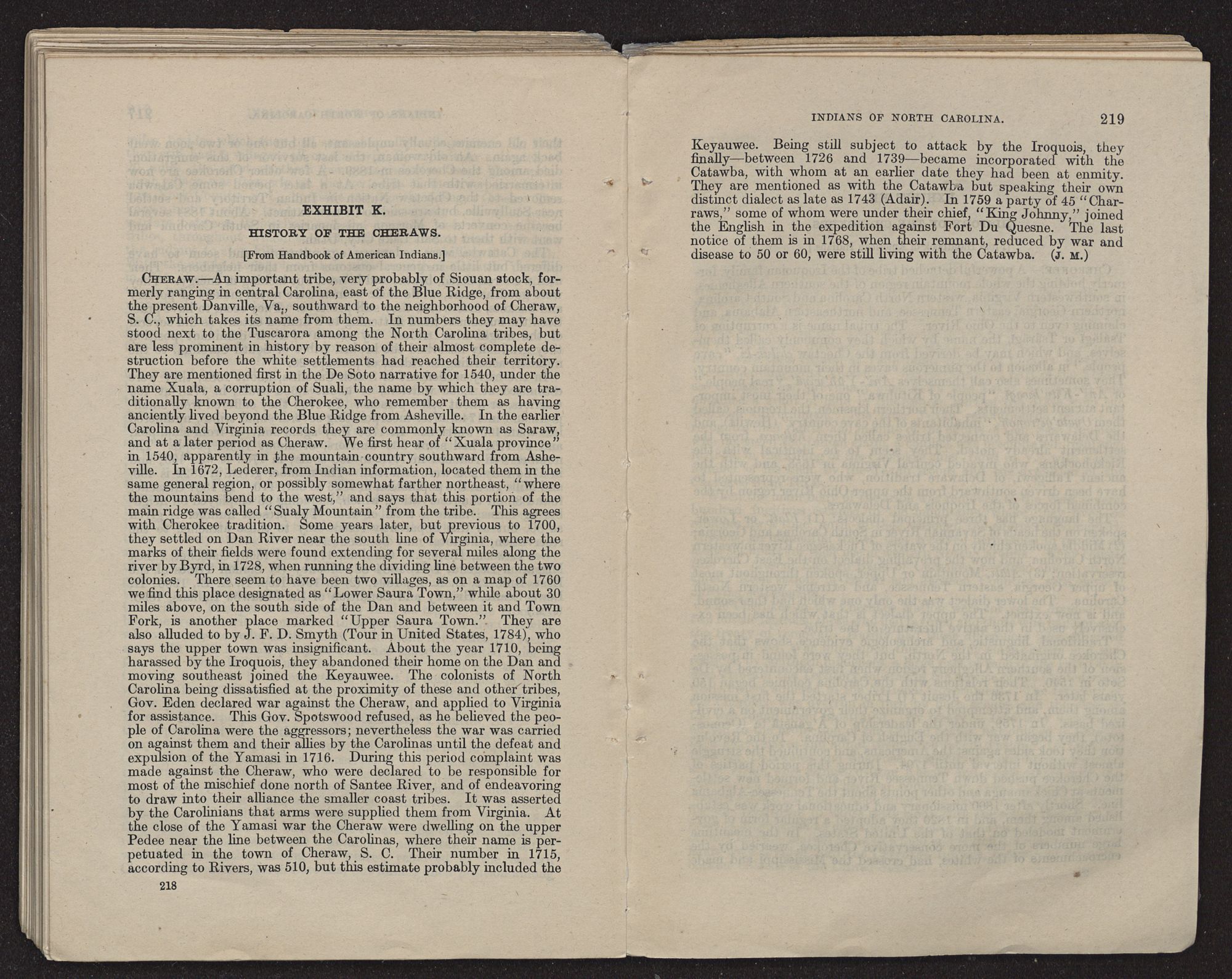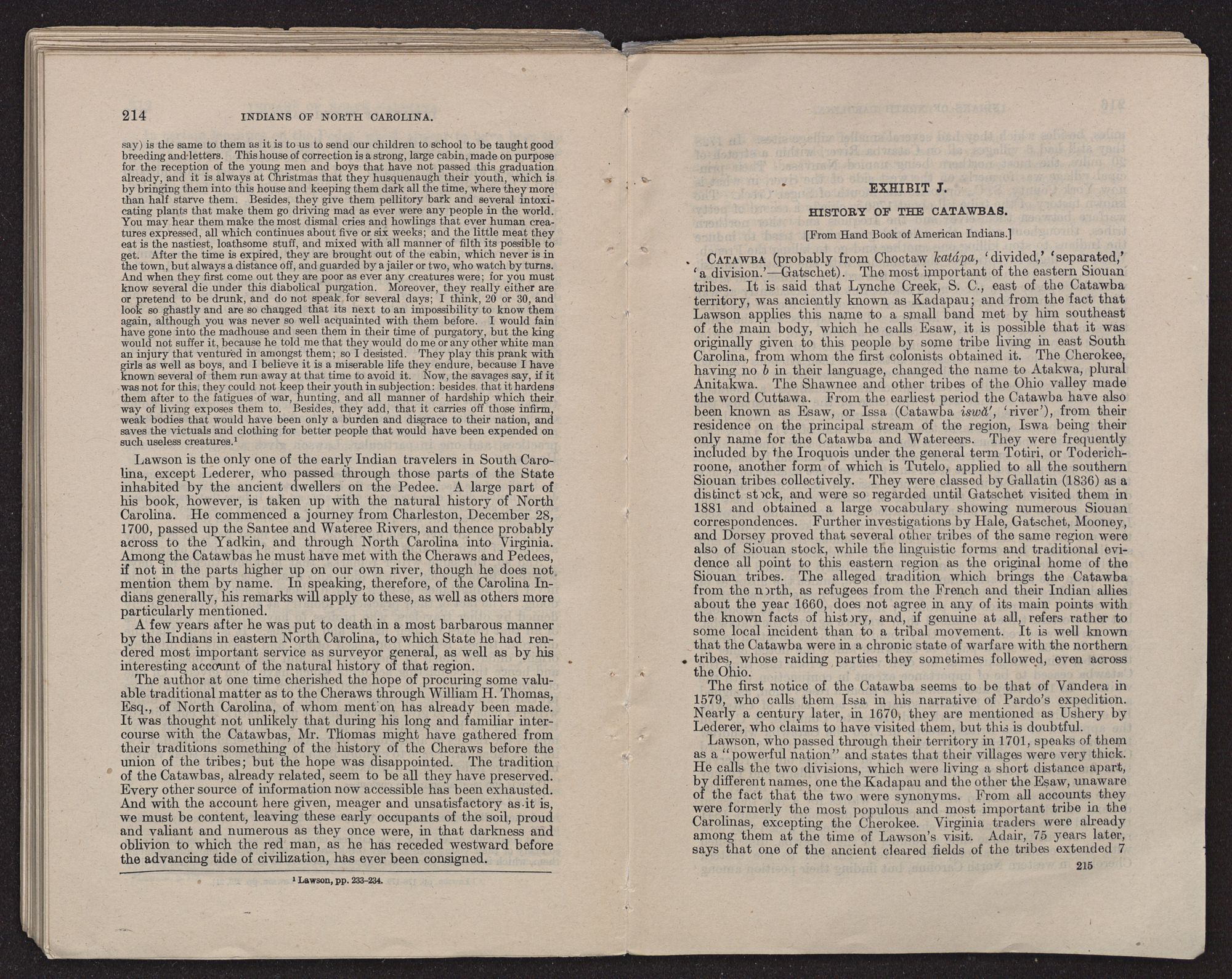 | EXHIBIT J.—History of the Catawbas (from Handbook of American Indians) | 215 |