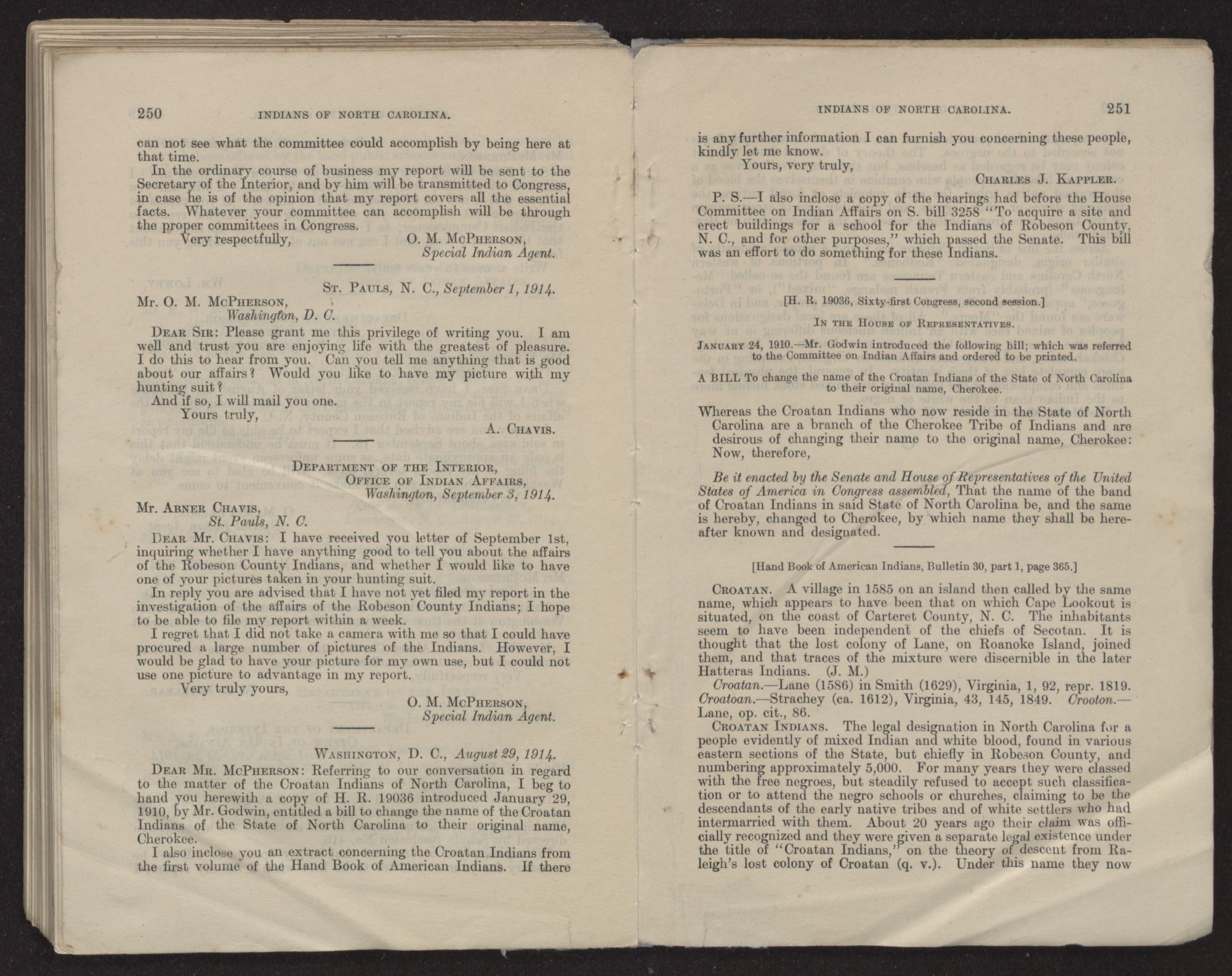 DEAR MR. MCPHERSON: Referring to our conversation in regard to the matter of the Croatan Indians of North Carolina, I beg to hand you herewith a copy of H. R. 19036 introduced January 29, 1910, by Mr. Godwin, entitled a bill to change the name of the Croatan Indians of the State of North Carolina to their original name, Cherokee.