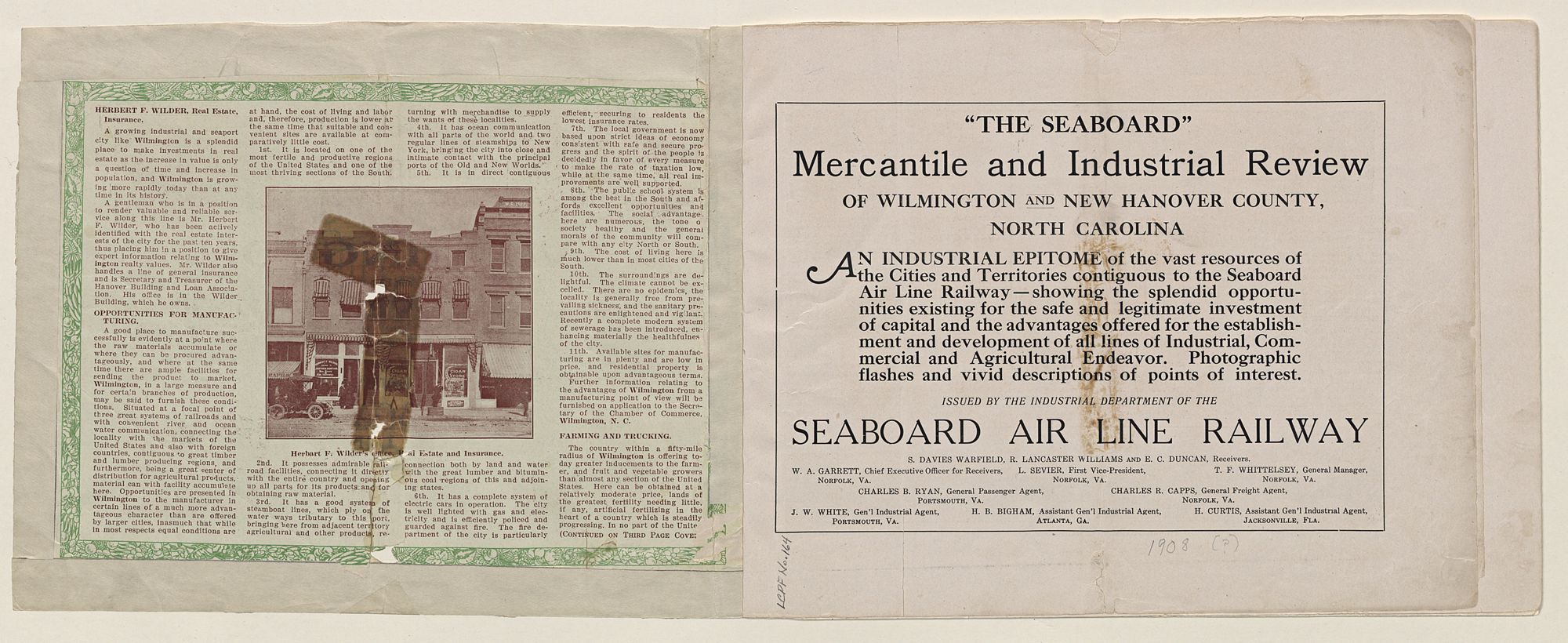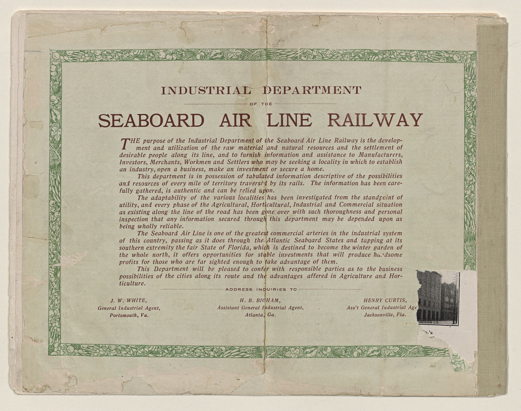 THE purpose of the Industrial Department of the Seaboard Air Line Railway is the development and utilization of the raw material and natural resources and the settlement of desirable people along its line, and to furnish information and assistance to Manufacturers, Investors, Merchants, Workmen and Settlers who may be seeking a locality in which to establish an industry, open a business, make an investment or secure a home.