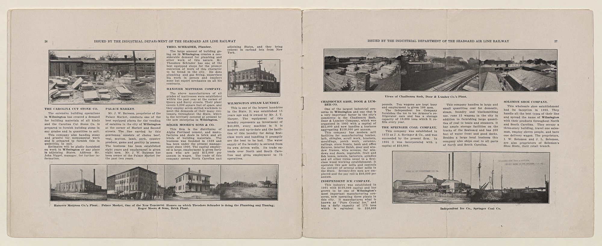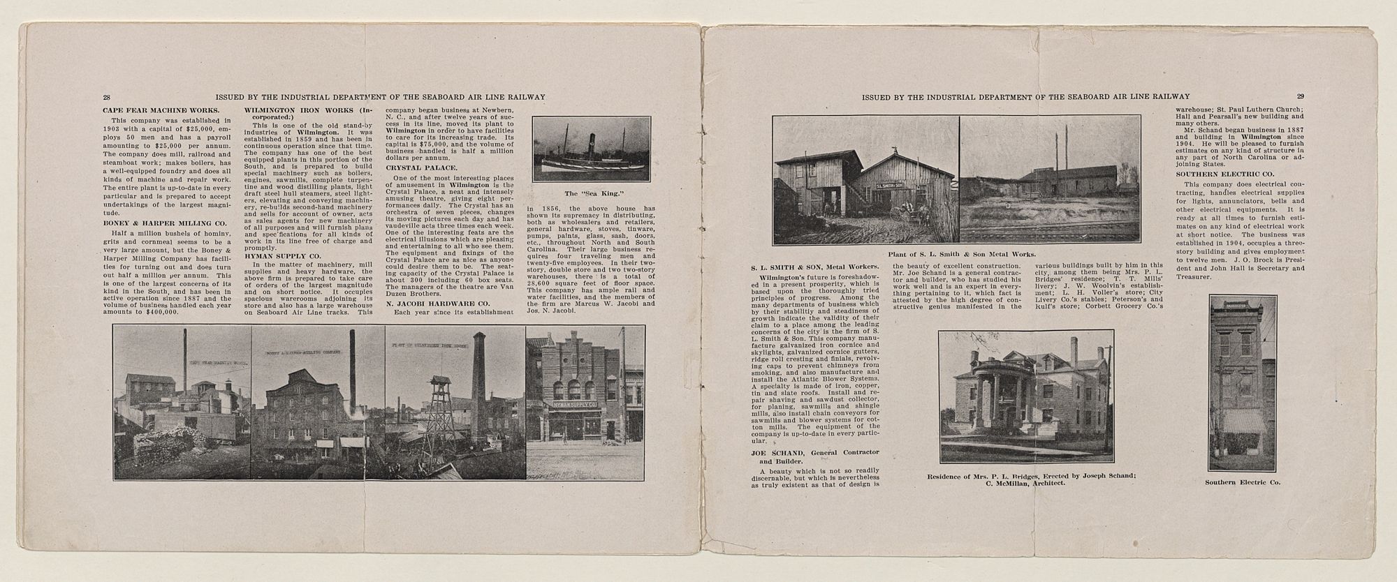 WILMINGTON IRON WORKS (Incorporated.)This is one of the old stand-by industries of Wilmington. It was established in 1859 and has been in continuous operation since that time. The company has one of the best equipped plants in this portion of the South, and is prepared to build special machinery such as boilers, engines, sawmills, complete turpentine and wood distilling plants, light draft steel hull steamers, steel lighters, elevating and conveying machinery, re-builds second-hand machinery and sells for account of owner, acts as sales agents for new machinery of all purposes and will furnish plans and specifications for all kinds of work in its line free of charge and promptly.