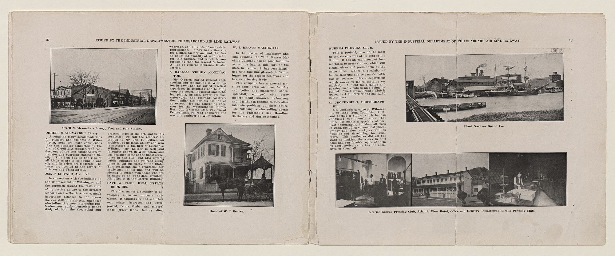 W. J. REAVES MACHINE CO.In the matter of machinery and mill supplies, the W. J. Reaves Machine Company has as good facilities as can be had in this part of the State in its line. It has been identified with this line of work in Wilmington for the past fifteen years, and has an extensive trade.
