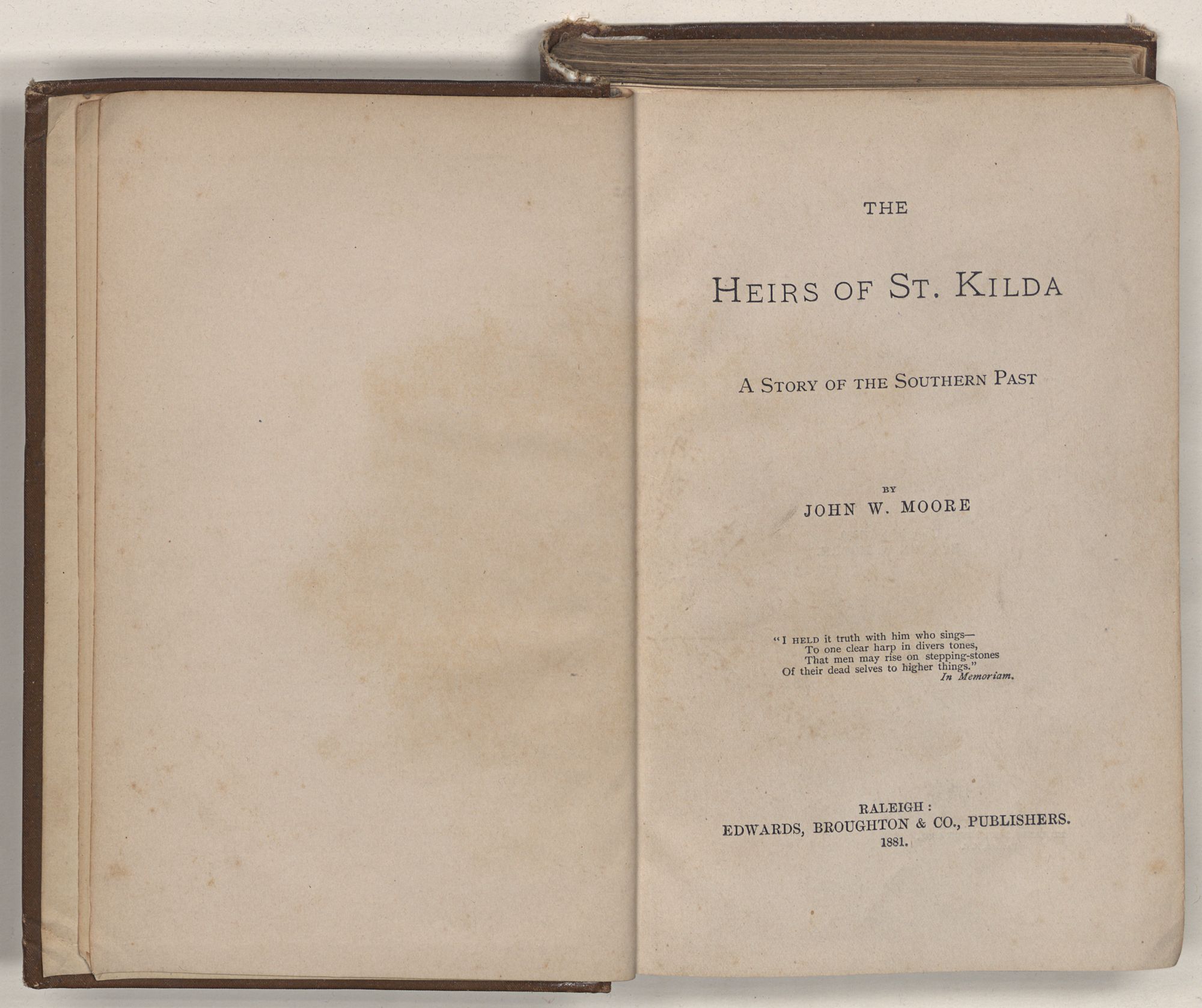 THEHEIRS OF ST. KILDAA STORY OF THE SOUTHERN PAST BYJOHN W. MOORE "I HELD it truth with him who sings— To one clear harp in divers tones, That men may rise on stepping-stones Of their dead selves to higher things."In Memoriam. RALEIGH EDWARDS, BROUGHTON & CO., PUBLISHERS. 1881.