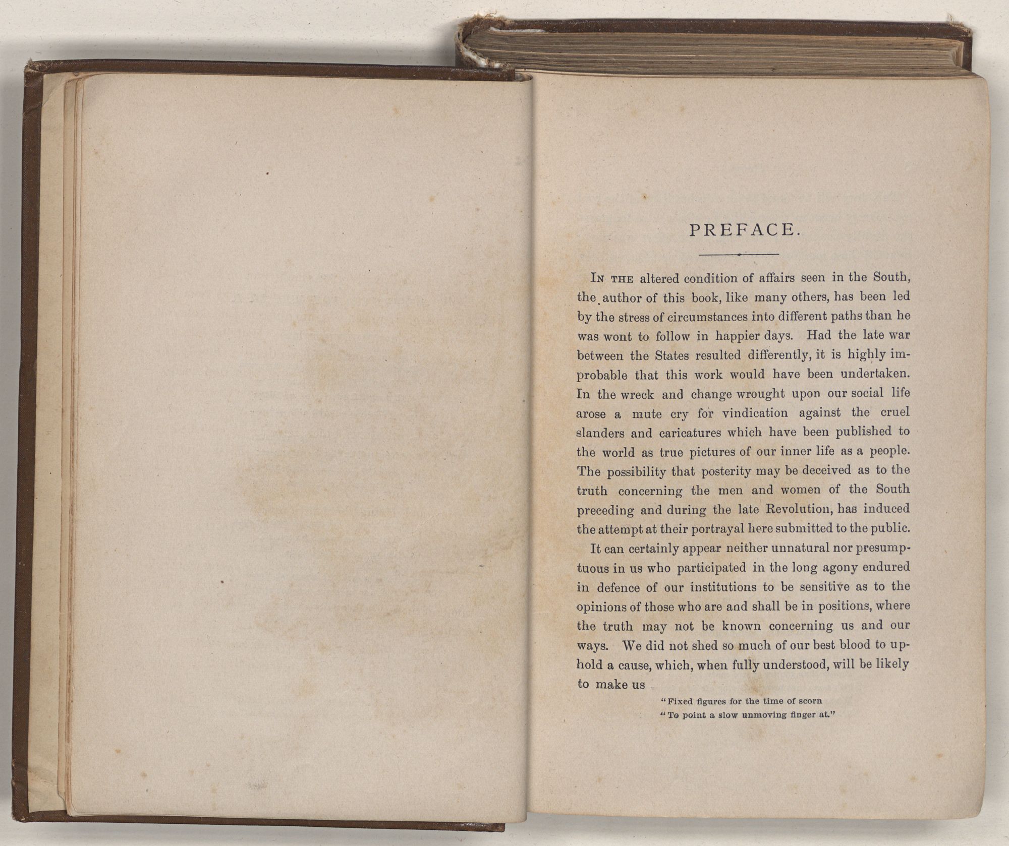 IN THE altered condition of affairs seen in the South, the author of this book, like many other, has been led by the stress of circumstances into different paths than he was wont to follow in happier days. Had the late war between the States resulted differently, it is highly improbably that this work would have been undertaken. In the wreck and change wrought upon our social life arose a mute cry for vindication against the cruel slanders an caricatures which have been published to the world as true pictures of our inner life as a people. The possibility that posterity may be deceived as to the preceding and during the late Revolution, has induced the attempt at their portrayal here submitted to the public.