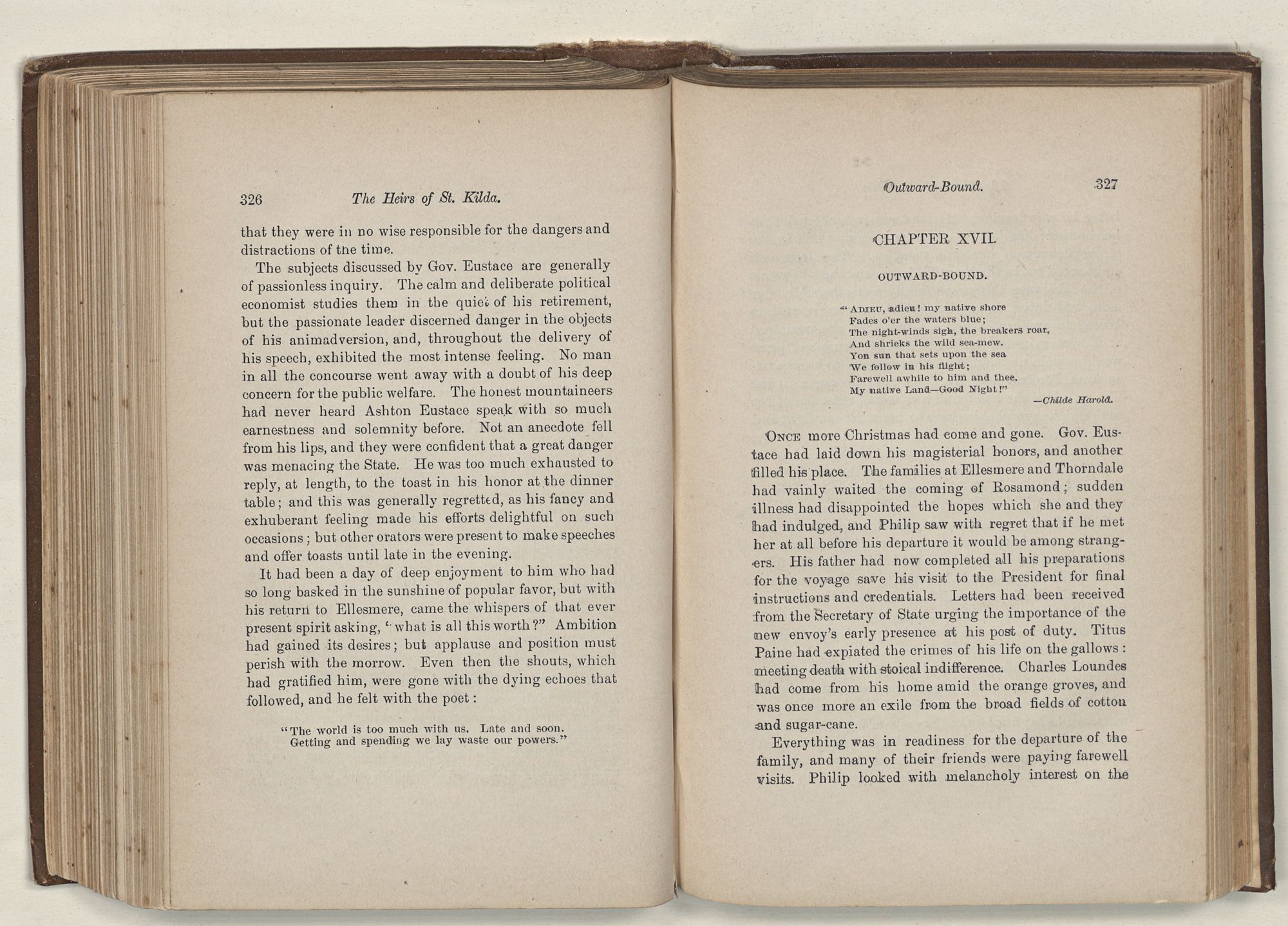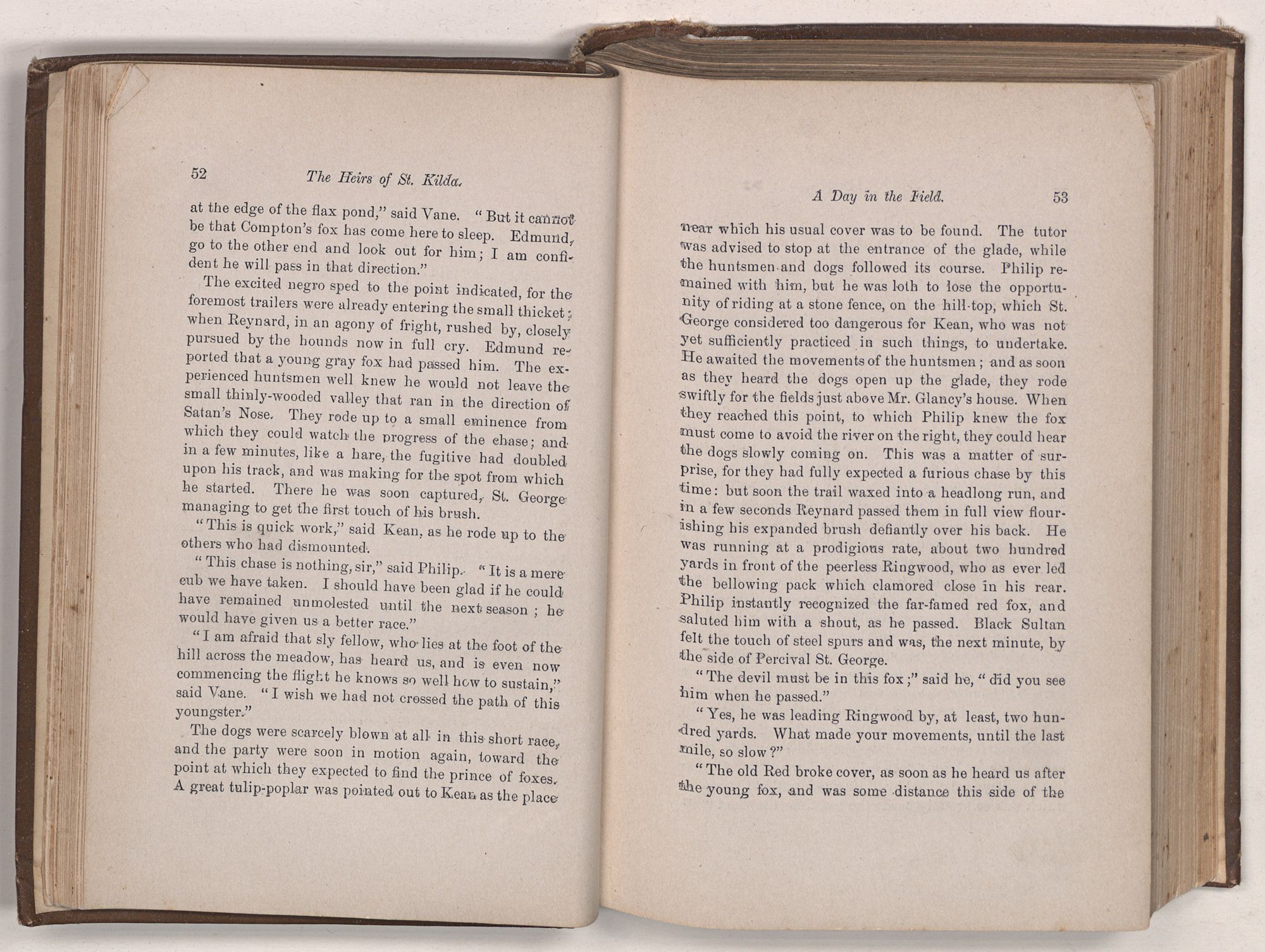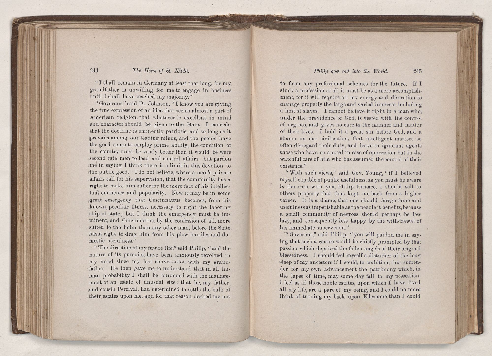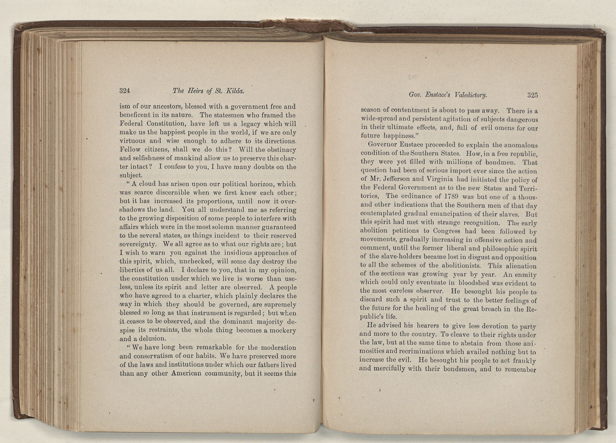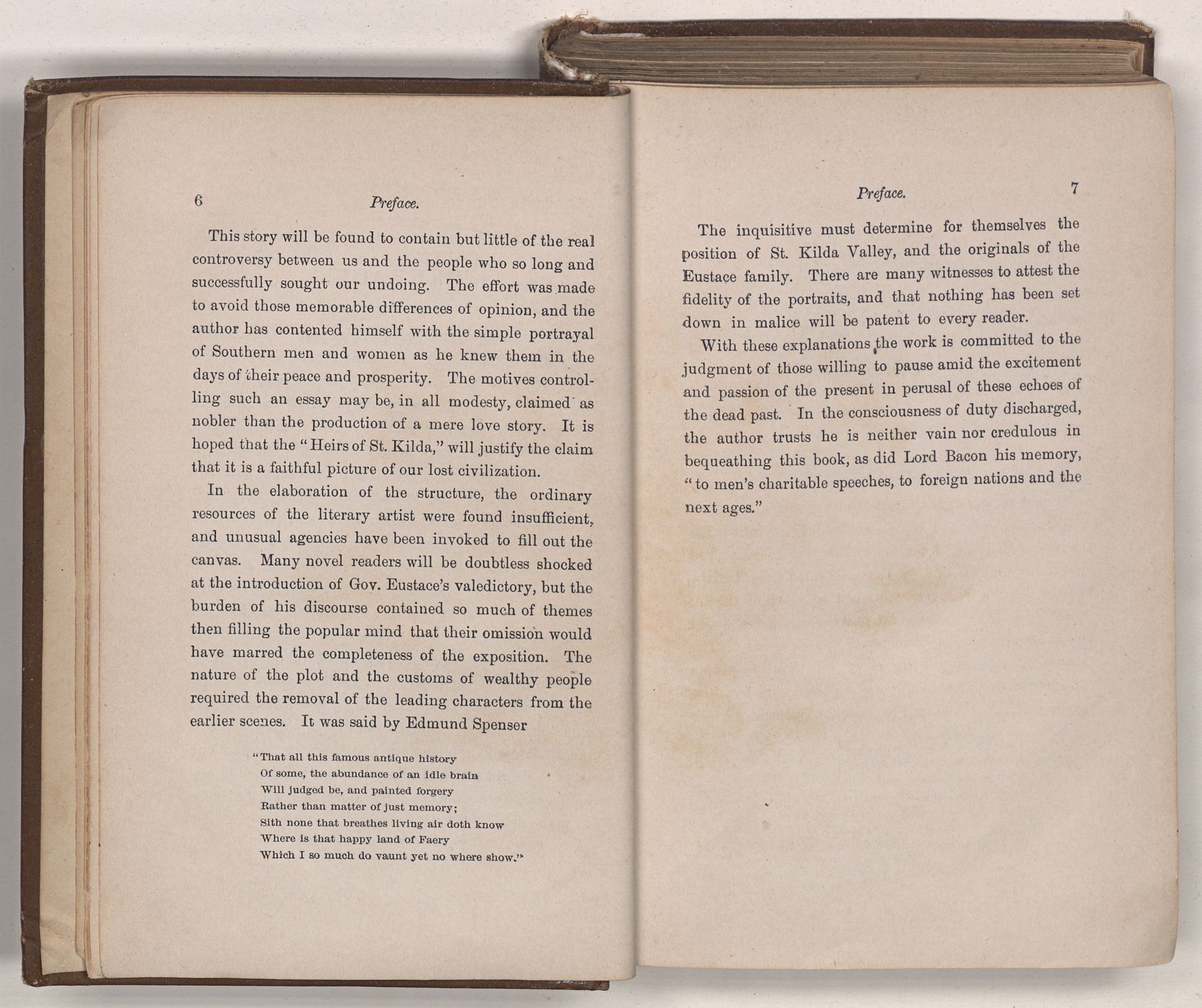 This story will be found to contain but little of the real controversy between us and the people who so long and successfully sought our undoing. The effort was made to avoid those memorable differences of opinion, and the author has contented himself with the simple portrayal of Southern men and women as he knew them in the days of their peace and prosperity. The motives controlling such an essay may be, in all modesty, claimed as nobler than the production of a mere love story. It is hoped that the “Heirs of St. Kilda,” will justify the claim that it is a faithful picture of our lost civilization.
