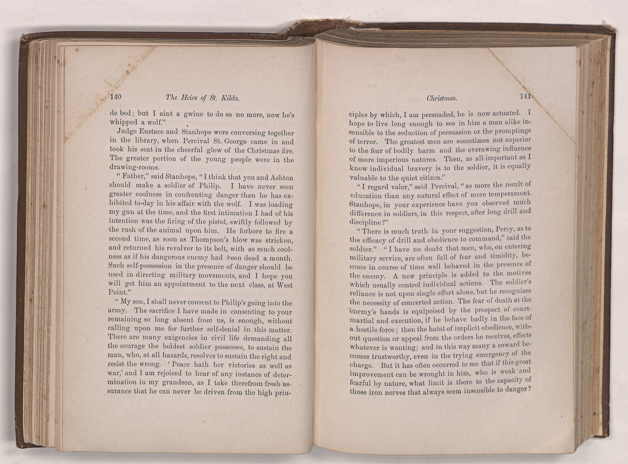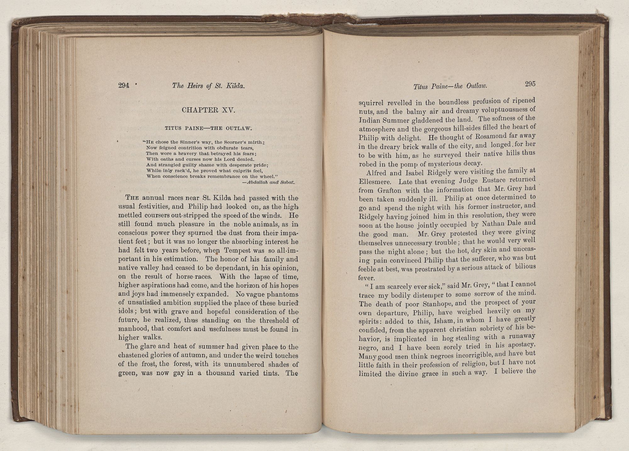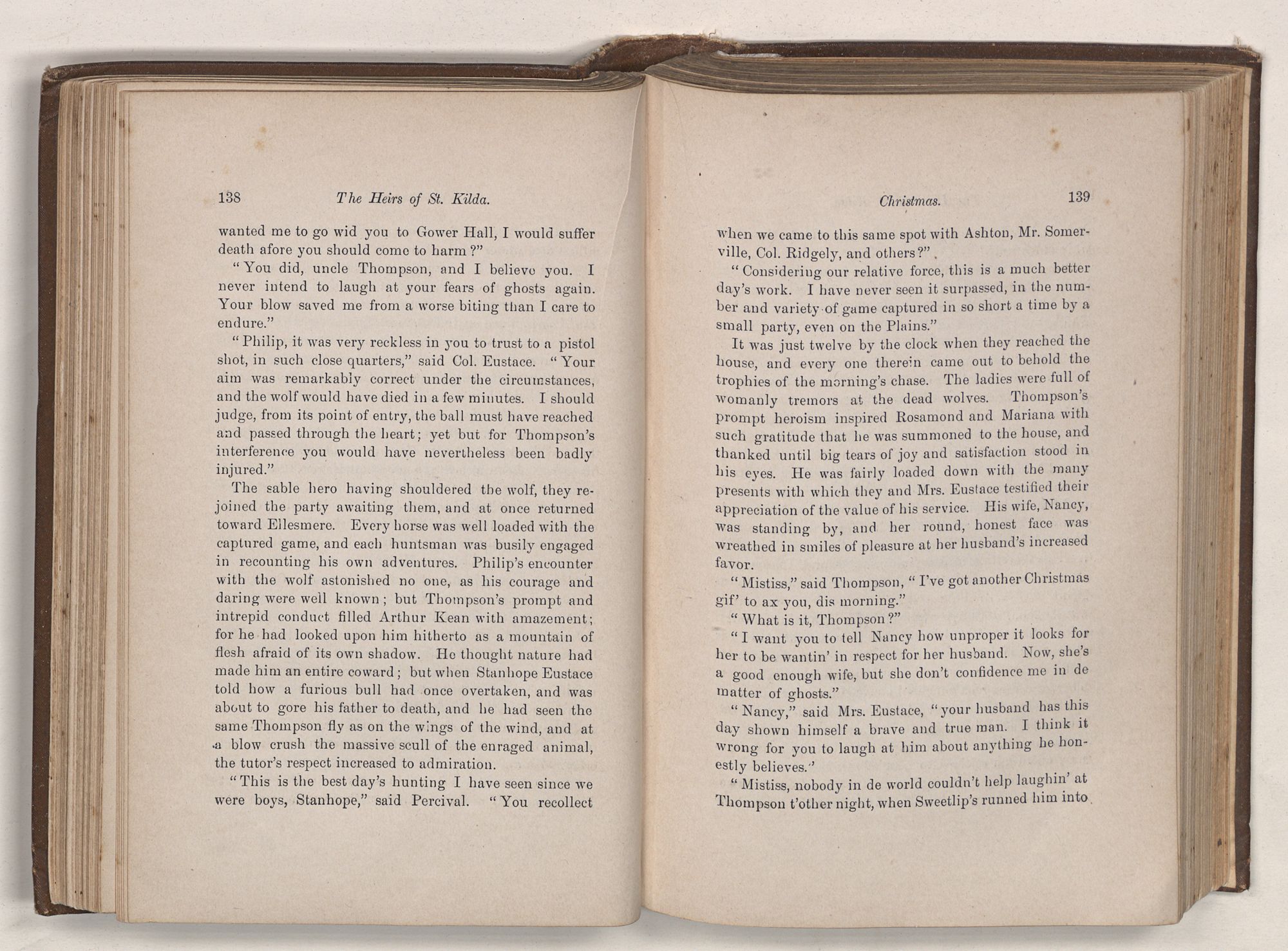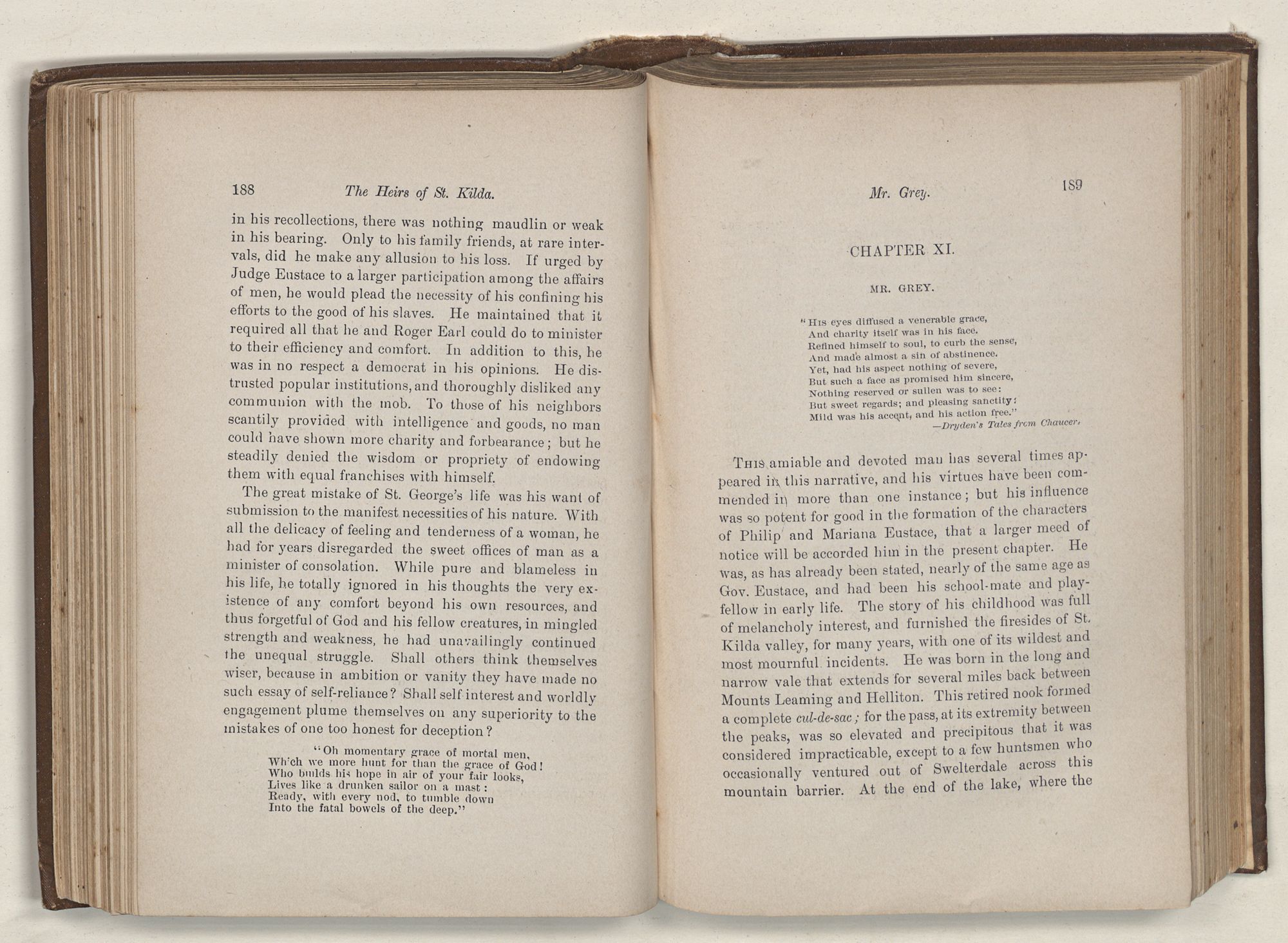 This story will be found to contain but little of the real controversy between us and the people who so long and successfully sought our undoing. The effort was made to avoid those memorable differences of opinion, and the author has contented himself with the simple portrayal of Southern men and women as he knew them in the days of their peace and prosperity. The motives controlling such an essay may be, in all modesty, claimed as nobler than the production of a mere love story. It is hoped that the “Heirs of St. Kilda,” will justify the claim that it is a faithful picture of our lost civilization.